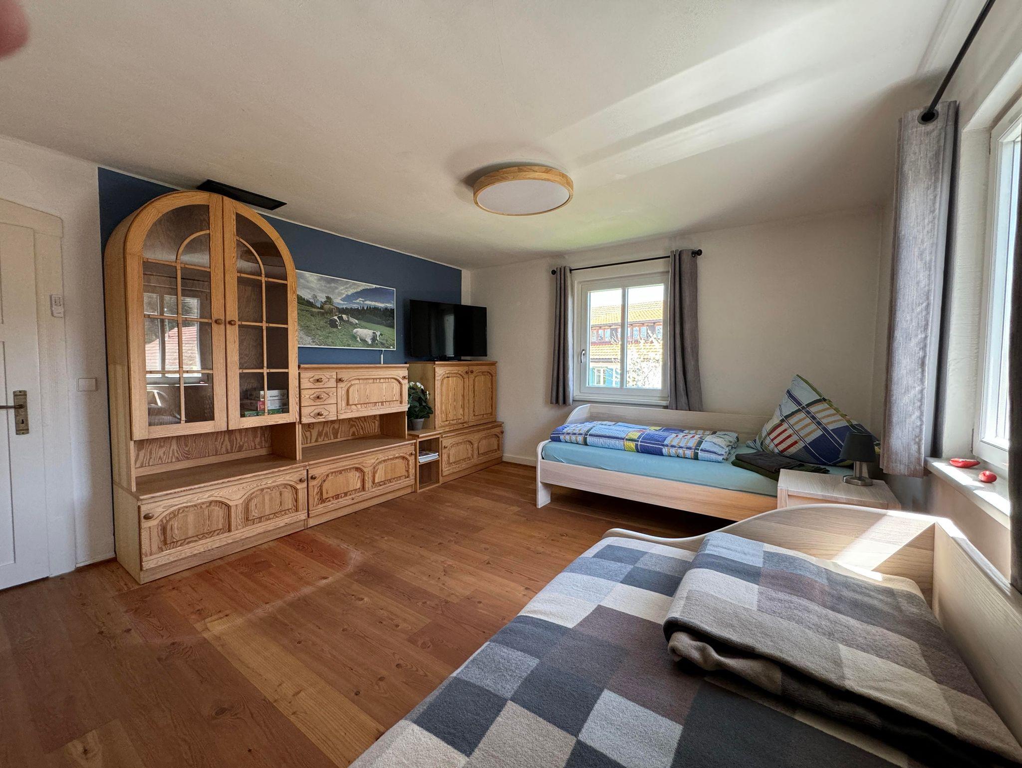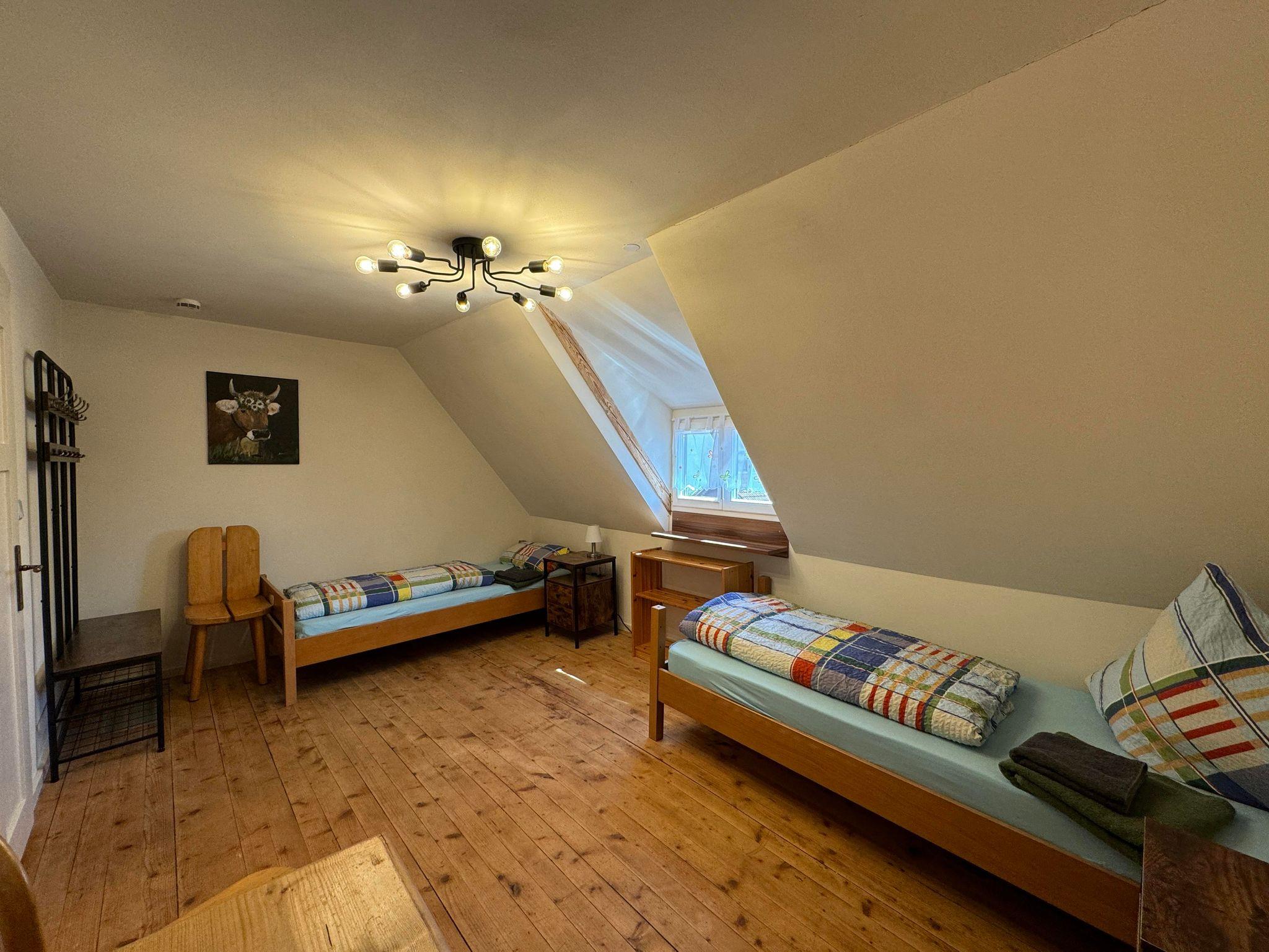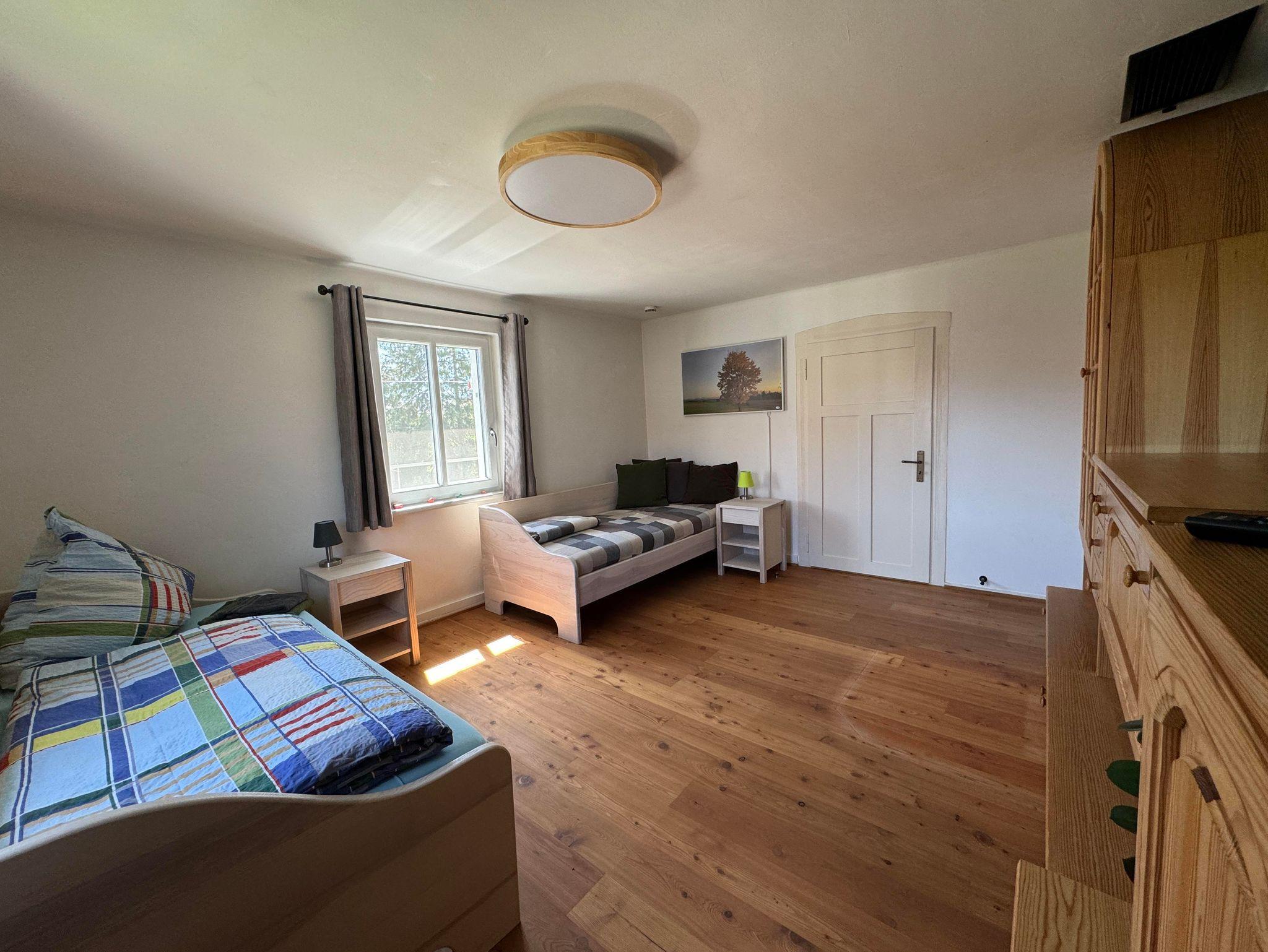 Gemütliche Schlafmöglichkeiten: Momentan bietet die Wohnung ein Doppelbett und vier Einzelbetten, ideal für eine kleinere Gruppe oder ein Team, das Wert auf Komfort legt.