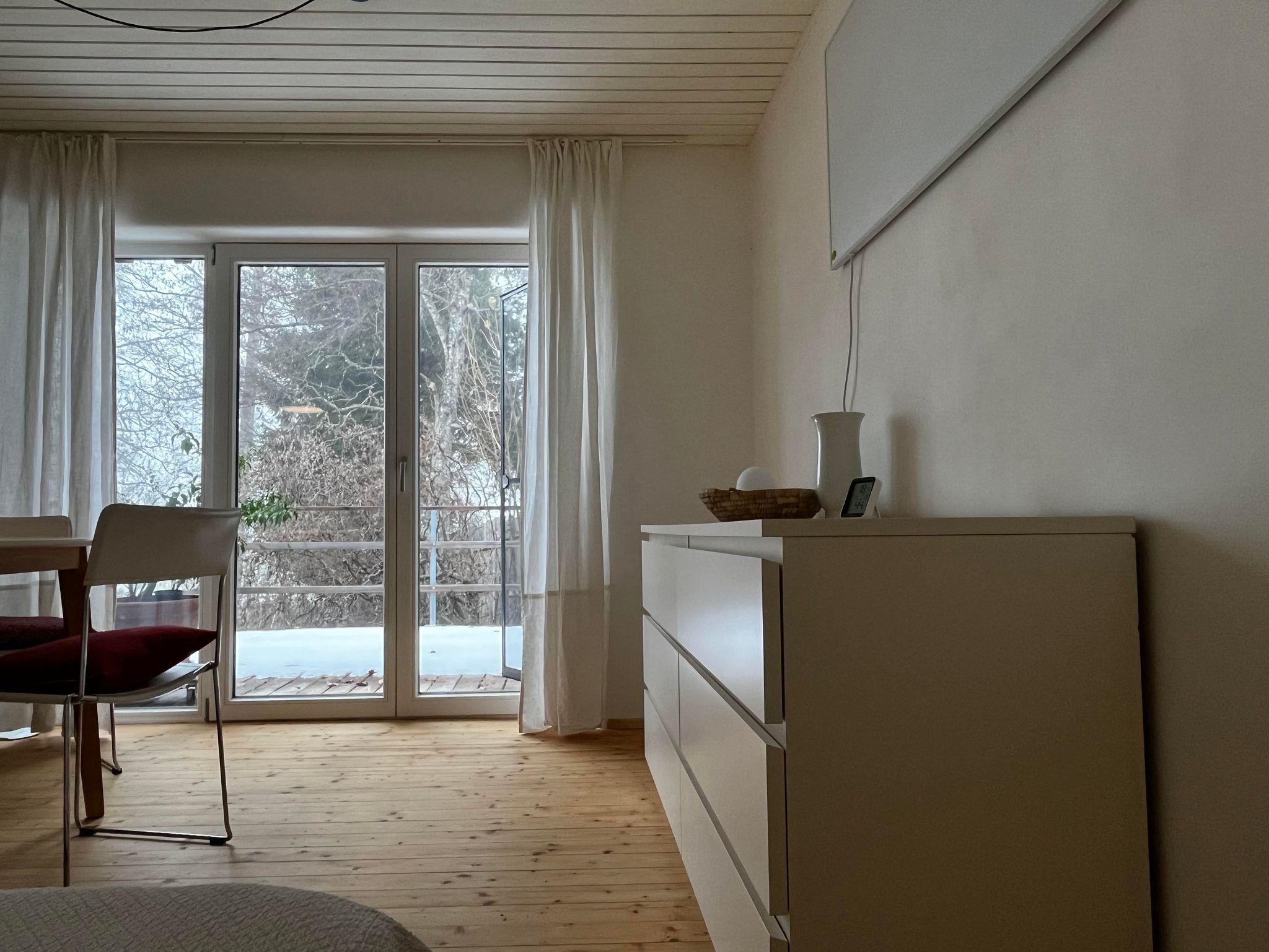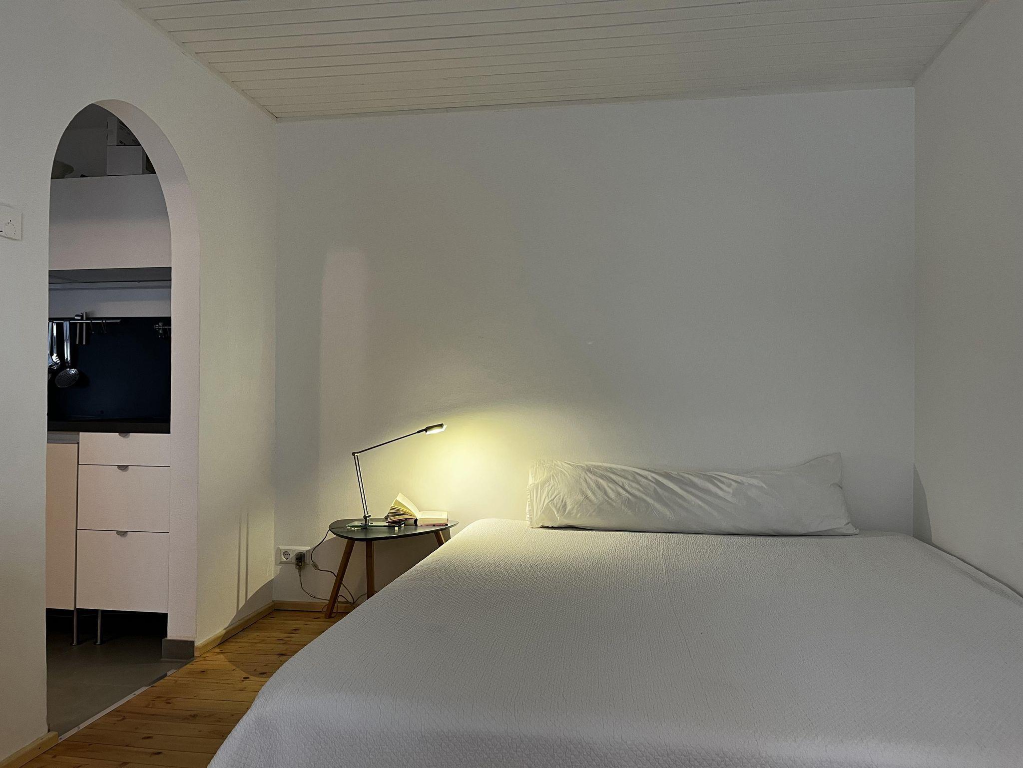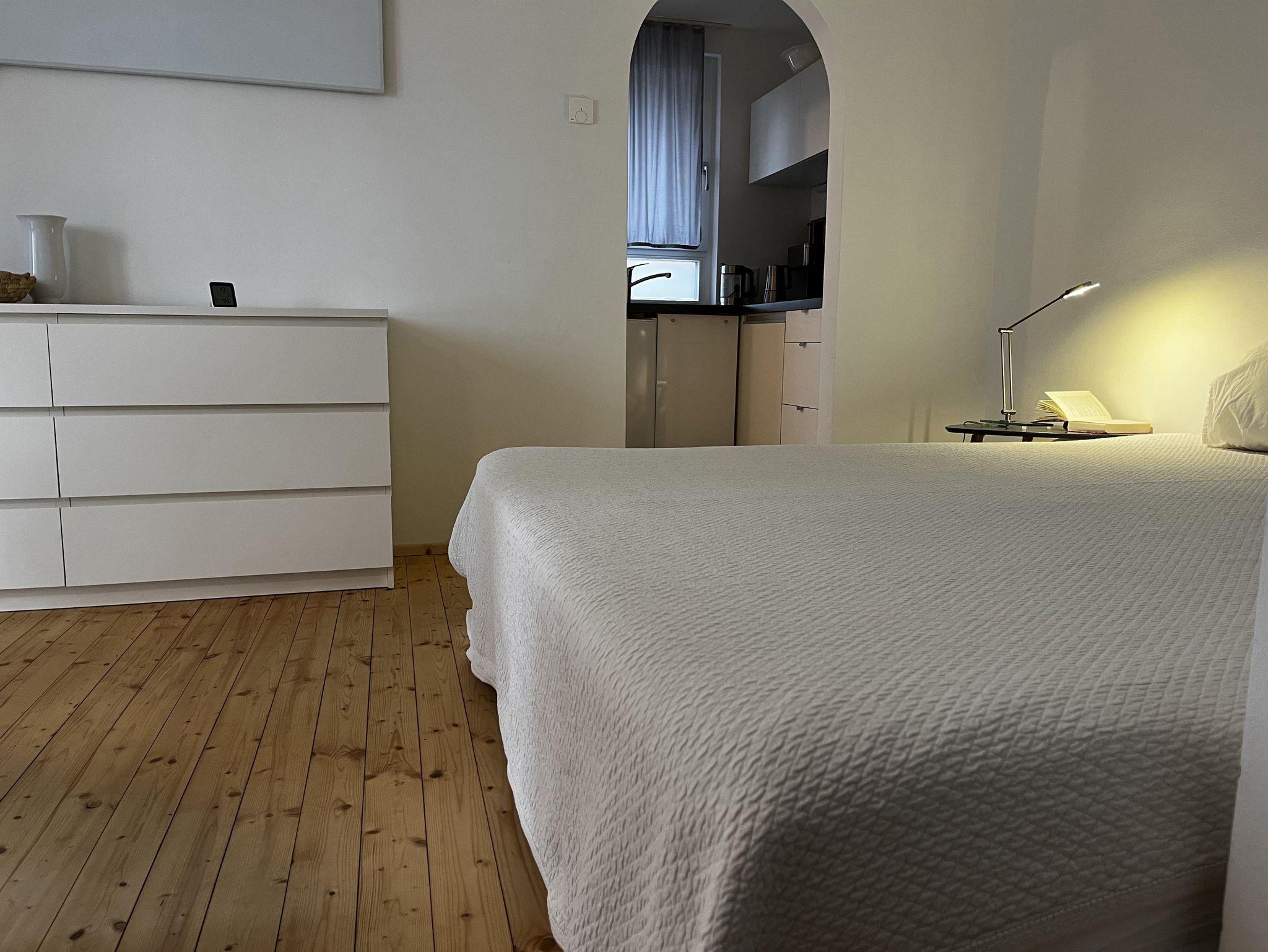 1 Wohn- Schlafzimmer mit großem Doppelbett (180 cm) im Erdgeschoss. Badezimmer mit Dusche/WC und Fußbodenheizung. Kleine Küche und Terrasse mit Gartenblick. Freies WLAN.