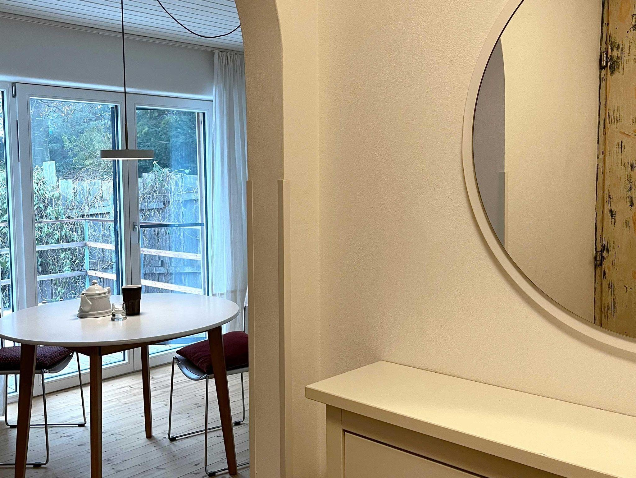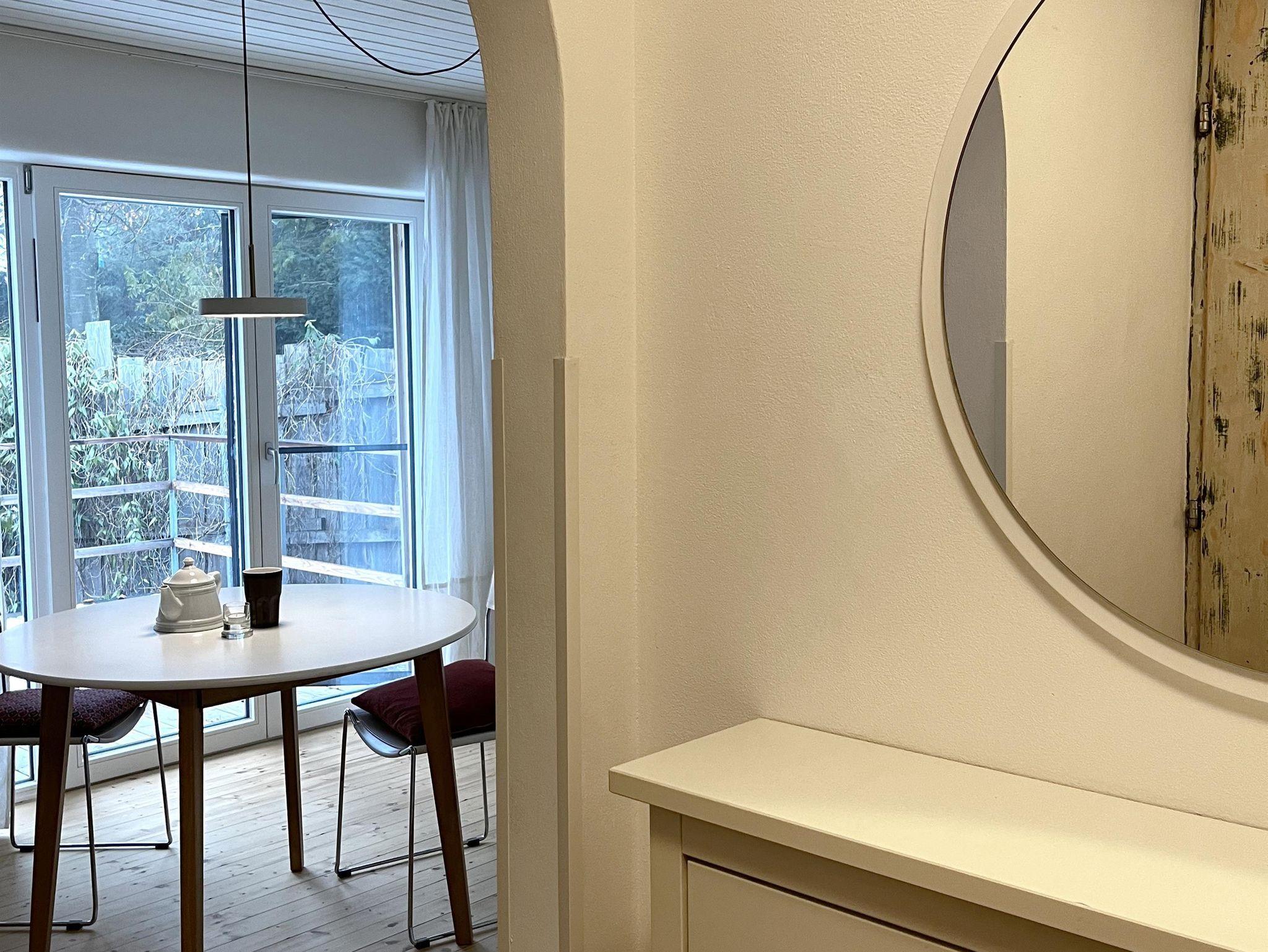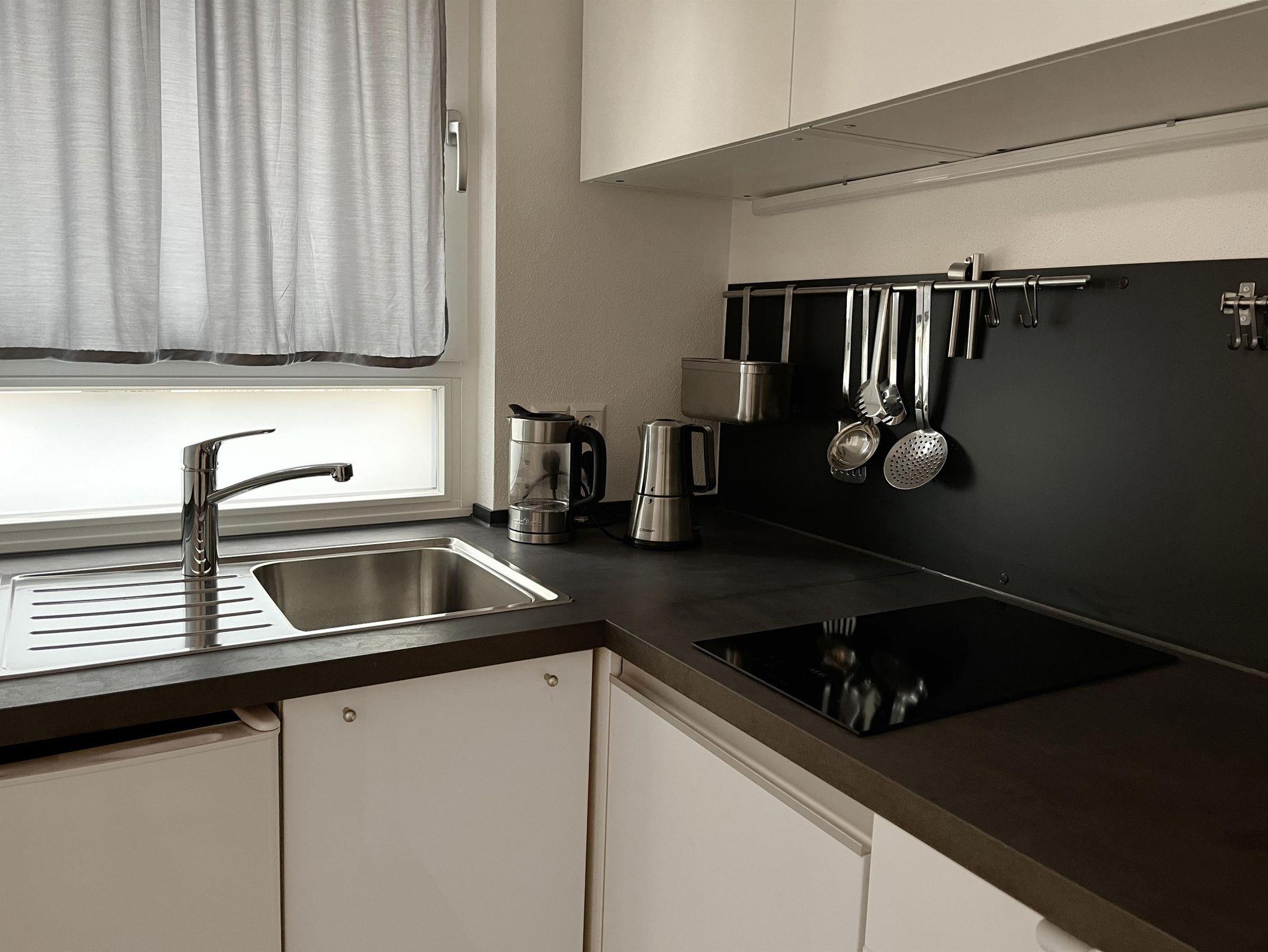 1 Wohn- Schlafzimmer mit großem Doppelbett (180 cm) im Erdgeschoss. Badezimmer mit Dusche/WC und Fußbodenheizung. Kleine Küche und Terrasse mit Gartenblick. Freies WLAN.