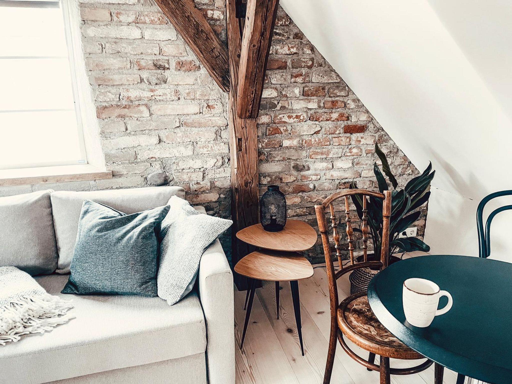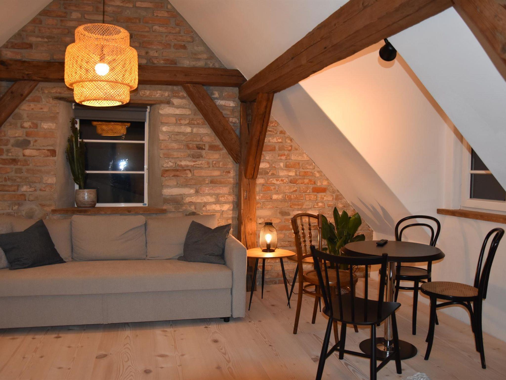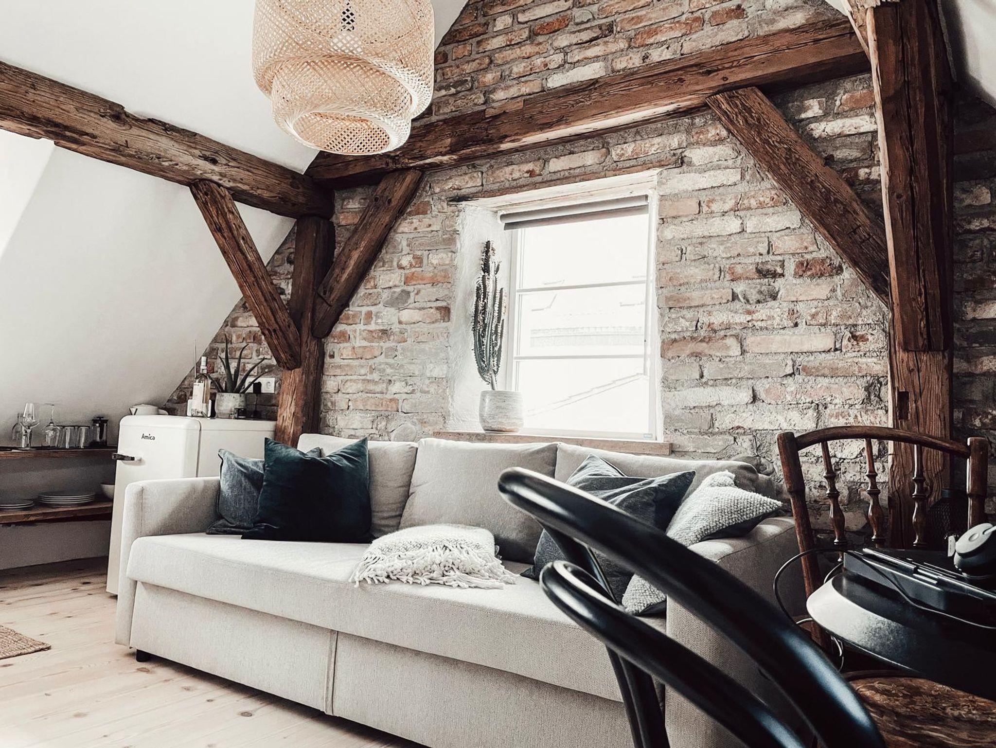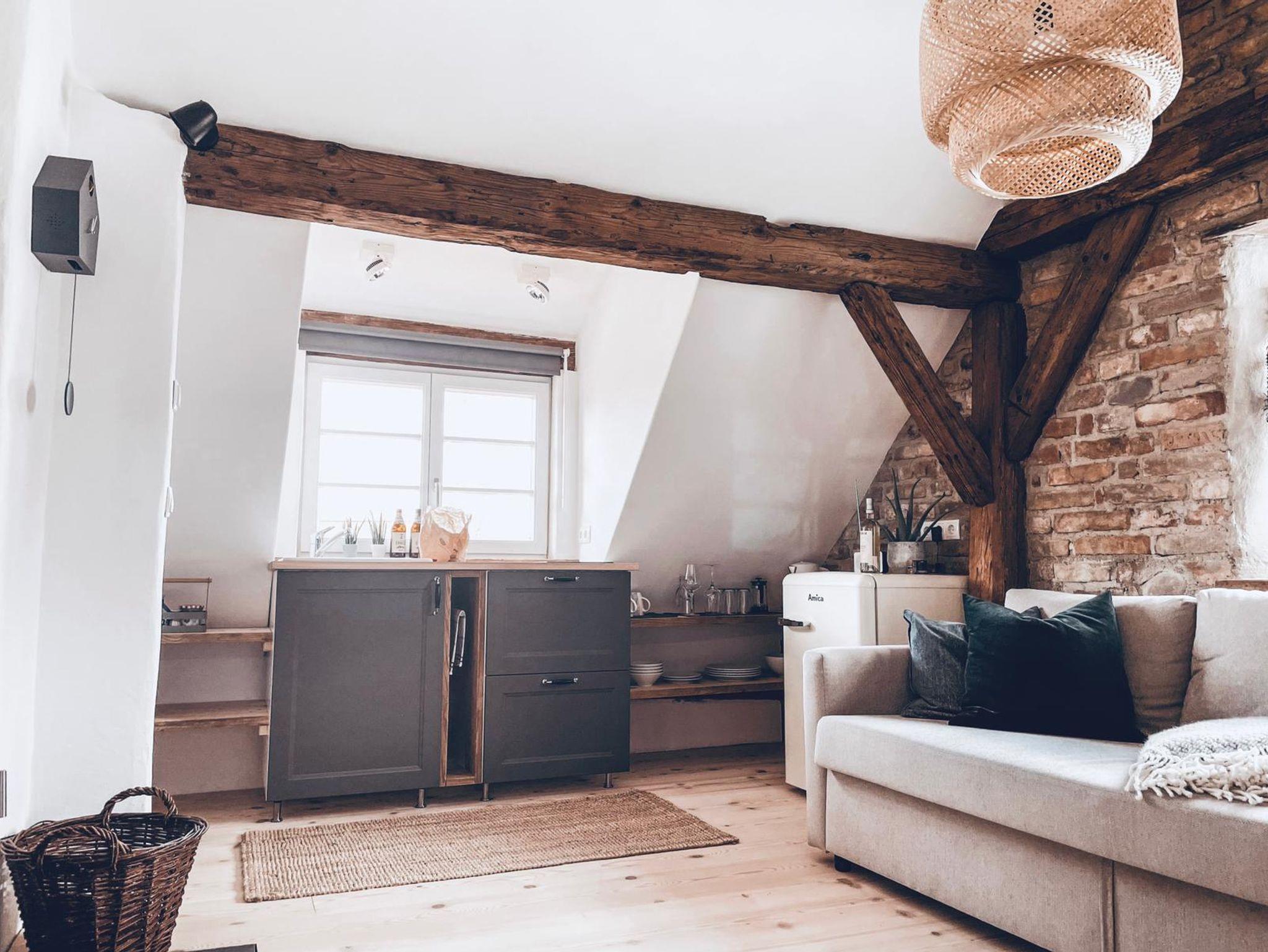 Appartement Allgäuglück: Gemütliche 35qm Wohnung im DG mit offenem Wohn-& Schlafbereich. Wunderschöne alte Sichtbalken und freigelegte Ziegelwand. Blick in den Garten und in die Altstadt.