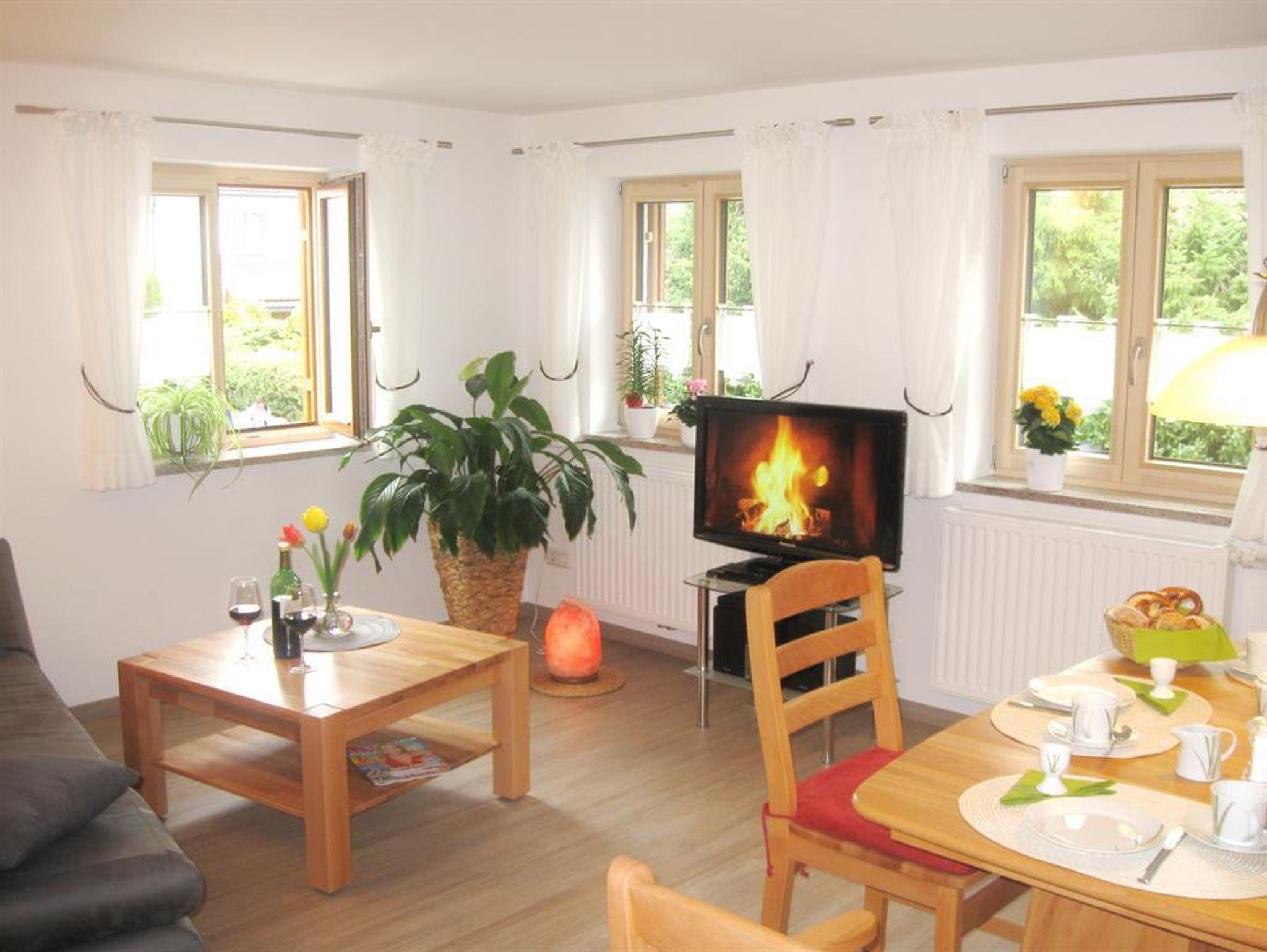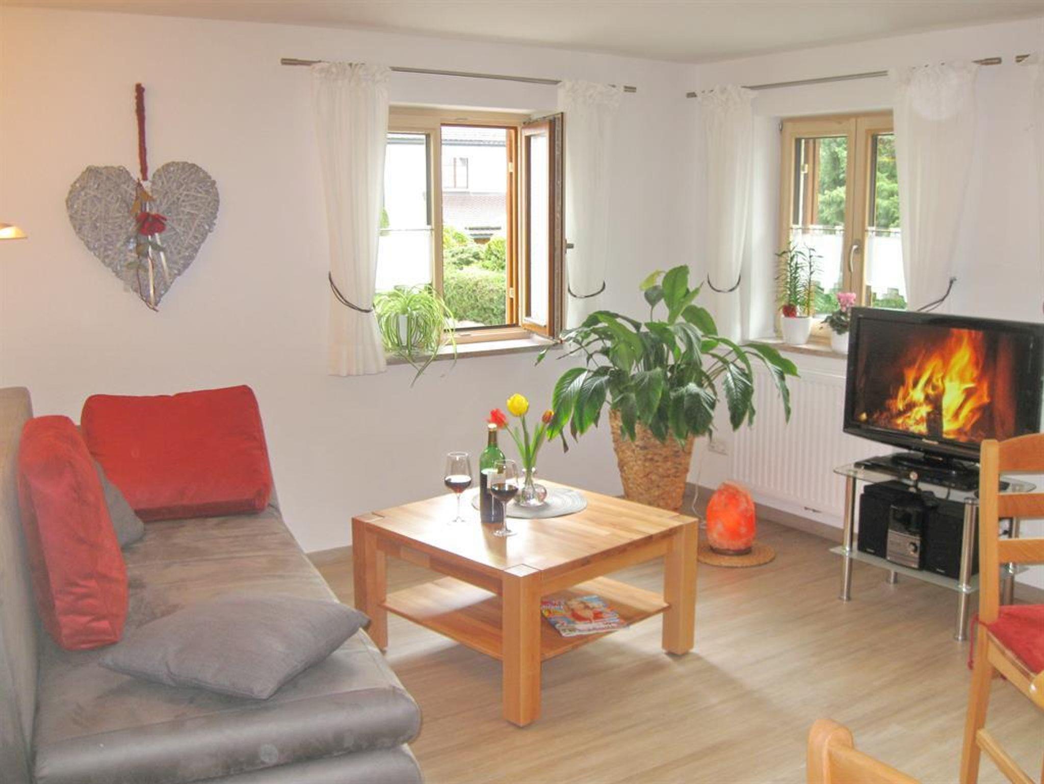 Neumöblierte Wohnung mit eigenem Hauseingang. Zur Wohnung gehört ein schöner Wohnraum mit Sofabett, Essplatz und Küchenzeile mit Geschirrspülmaschine, außerdem ein Schlafzimmer mit Doppelbett, Badezimmer mit Dusche/WC und ein Balkon. Die Ausstattung der Ferienwohnung umfasst ein HD-TV-Gerät. Internetnutzung mit kostenlosem WLAN.