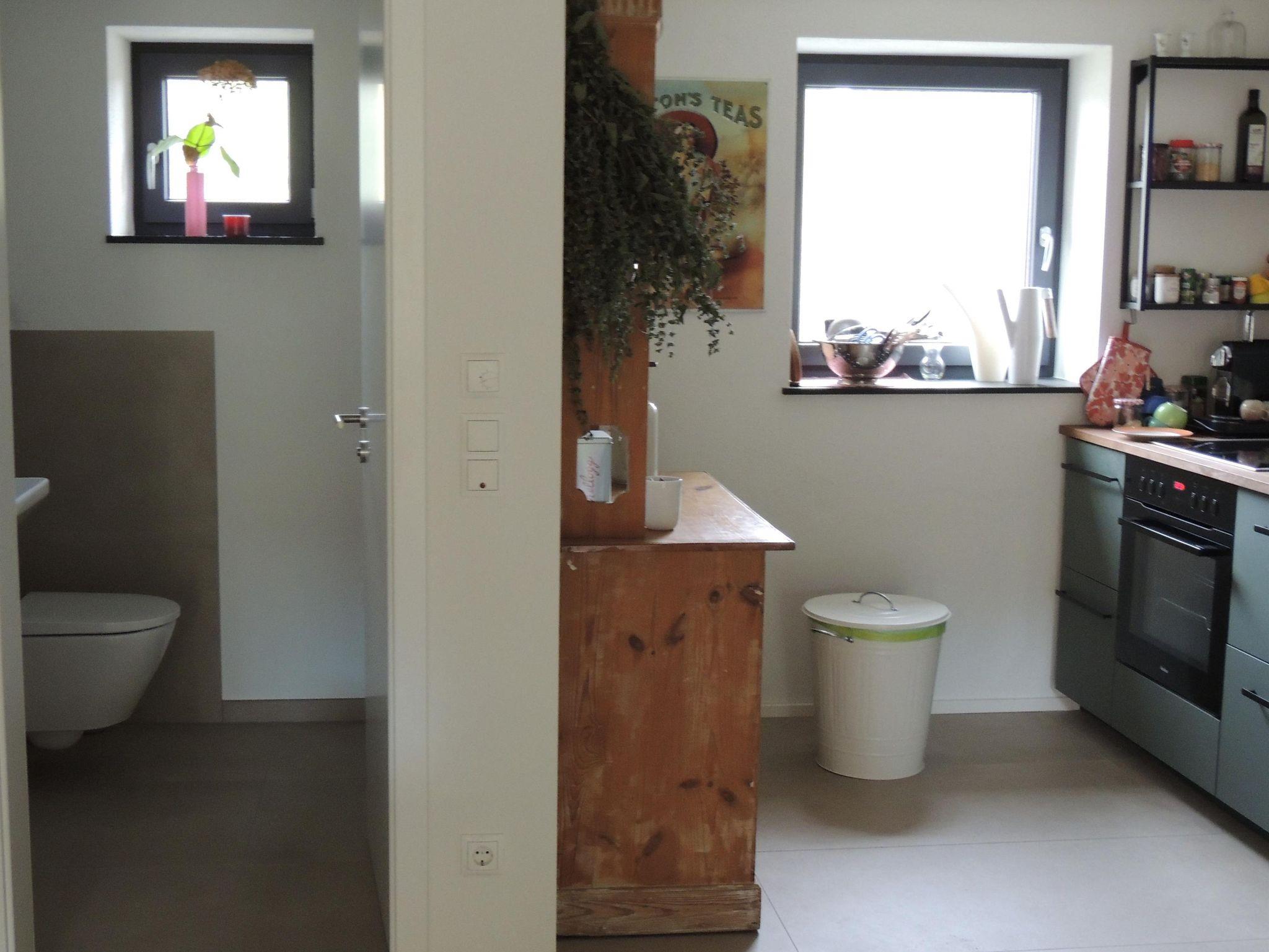 Die Wohnküche im Erdgeschoss lädt mit ihrem gemütlichen Wohn-Essbereich zum Zubereiten und Genießen von frischen Mahlzeiten ein. Ihre Kappendecke mit Wölbungen und liebevoll herausgearbeiteten Stahlträgern weckt die Erinnerung an die Vergangenheit als Stall. Bei schönem Wetter sind es nur wenige Schritte auf die Süd-Terrasse mit Blick auf den begrünten Innenhof.