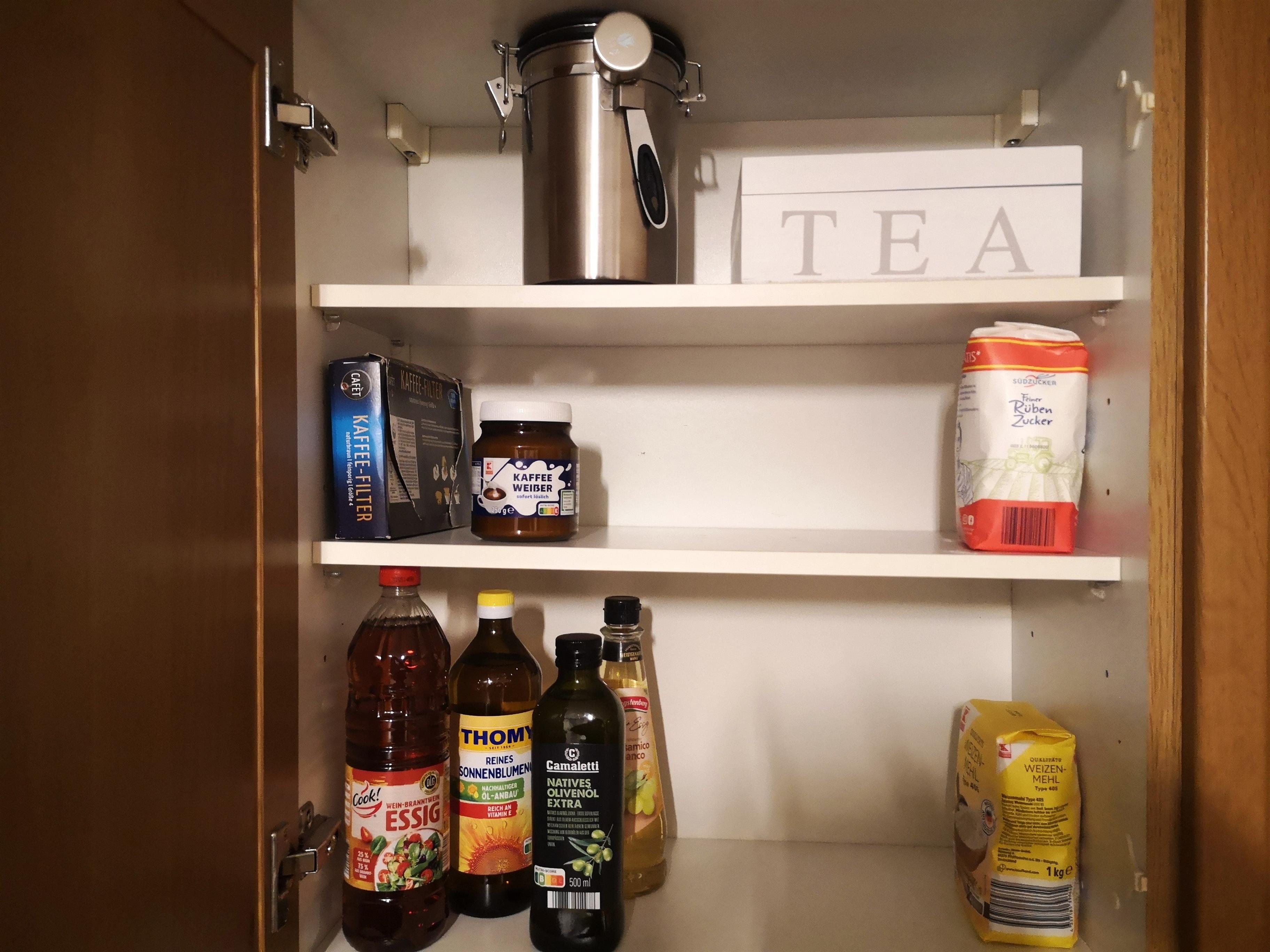 Grundausstattung: Kaffee, Tee, Zucker, Salz, Pfeffer, Öl, Essig, Balsamico, Olivenöl, Gewürze, Küchenpapier, Alufolie, Frischhaltefolie, Reinigungsmittel...