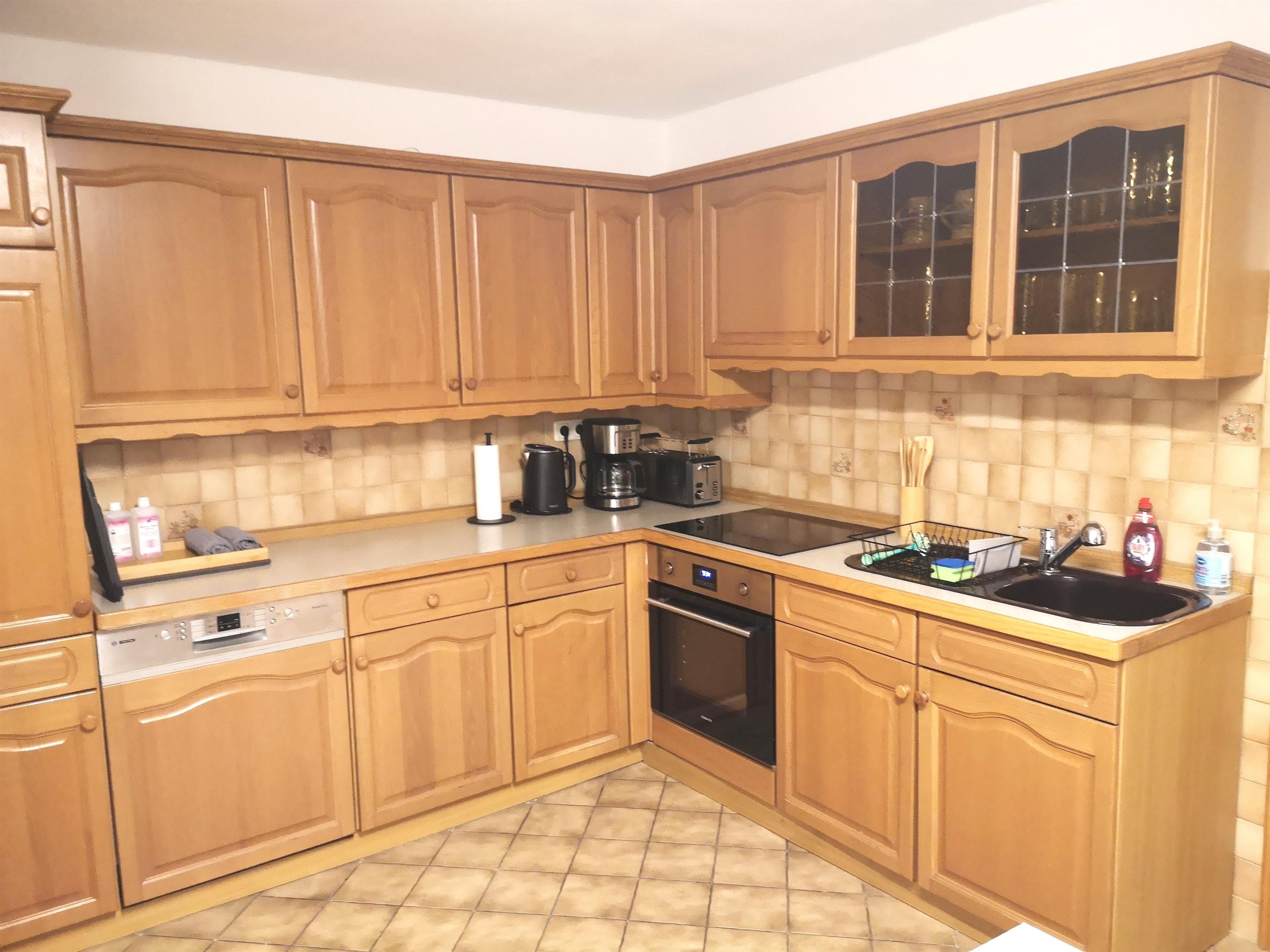 Vollausgestattete Küche: Geschirrspüler (Tabs vorhanden), Herd, Backofen, Kühlschrank mit Gefrierfach, Kaffeemaschine, Wasserkocher, Toaster