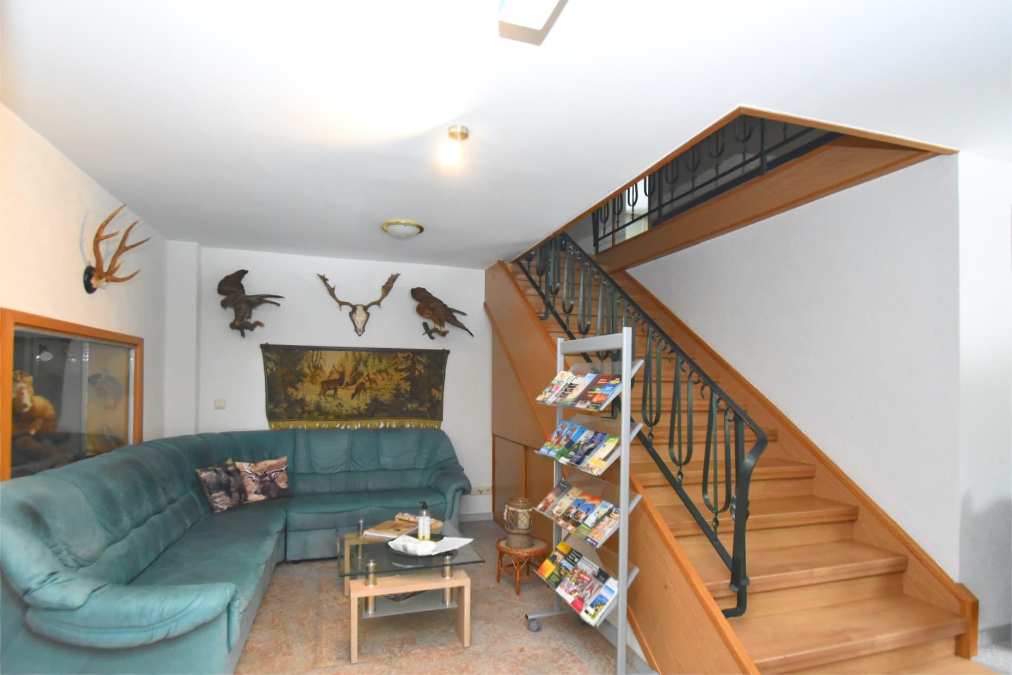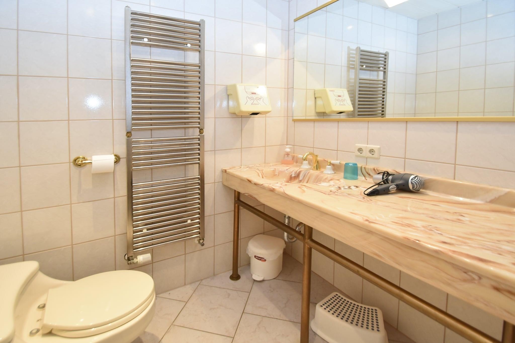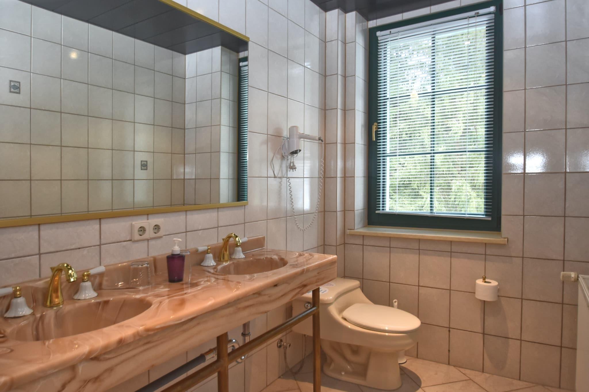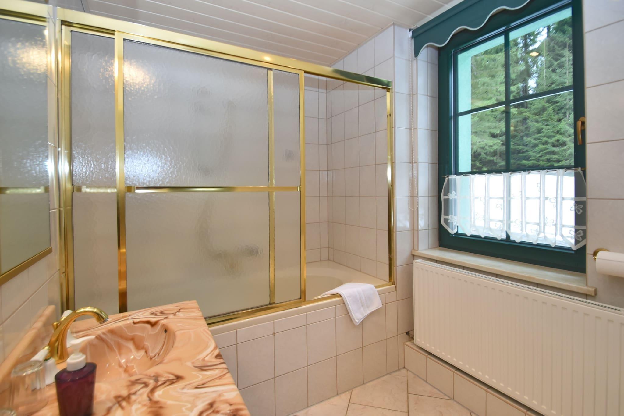 Denne boligen i første etasje i Muldenhammer er ideell for sammenkomster, og blander privatliv, komfort og felles moro. Den romslige stue/spisestuen med åpen planløsning har plass til 14 personer og kobles til et fullt utstyrt kjøkken med elektriske og keramiske kokeplater, kjøleskap med fryser, oppvaskmaskin, mikrobølgeovn, stekeovn og filterkaffetrakter. Hvert av de fem stilige soverommene har satellitt-TV og dobbeltsenger, med eget bad med badekar og dobbel servant - noen har også kjøkkenkrok, kjøleskap og sittegrupper for ekstra bekvemmelighet. Avslapping er foran og i sentrum med en infrarød badstue, betalt tilgang til finsk badstue og boblebad, pluss et velværeområde komplett med dusj, TV og solsenger. Gjestene kan også nyte en privat terrasse på 100 m² og tilgang til den delte 5000 m² store hagen med et sesongbasert oppvarmet basseng med tak (åpent mai–sep), dam, lekeapparater, trampoline, sandkasse og bordtennis. Festspill, leker, insektnett og solkrem gjør det familievennlig året rundt. Ligger kun 10 m fra en tennisbane og 500 m fra skogsstier, med strender ved innsjøen, ski, restauranter og butikker innen kort kjøretur. Dette kjæledyrvennlige tilfluktsstedet er ideelt for naturflukter, velværehelger eller gledelige gjenforeninger.