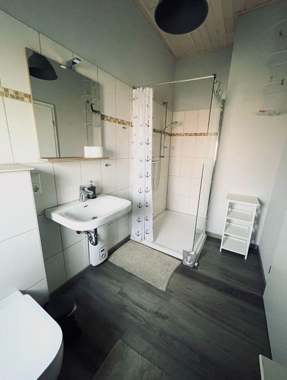 Eine große begehbare Dusche und Regale als Ablagefläche für Handtücher sind im Bad vorhanden.