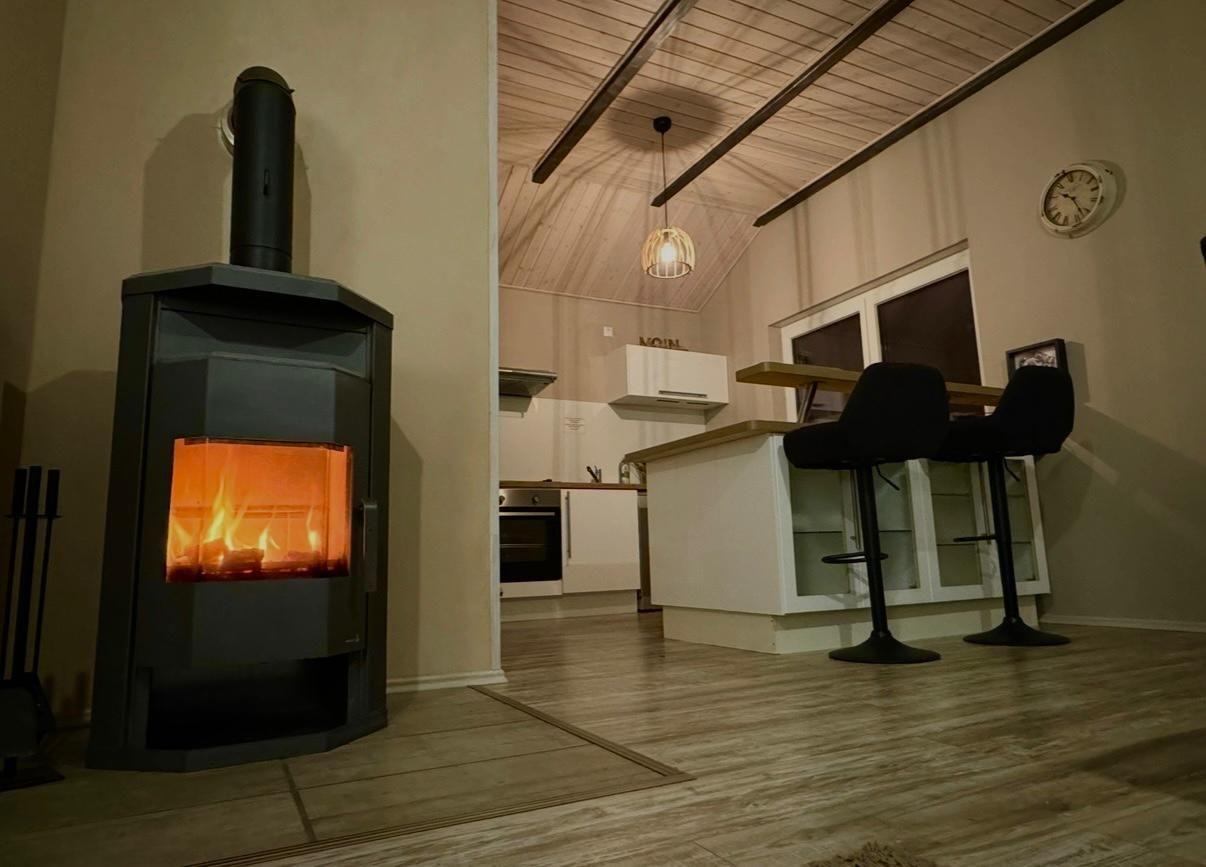 Ein Kaminofen und eine gemütliche Sitzecke bilden neben dem offenen Essbereich das Zentrum des Hauses.