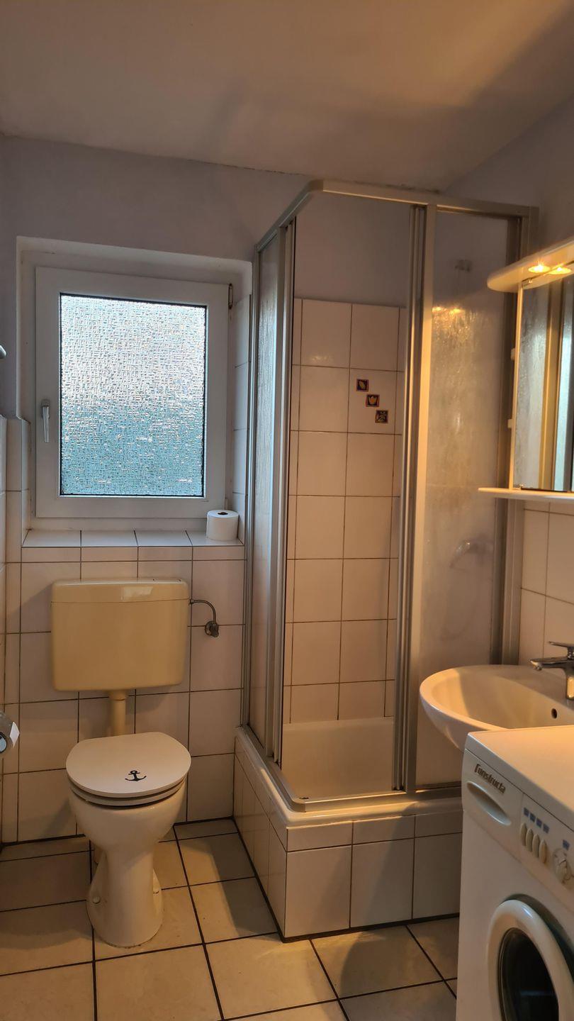 Das Badezimmer verfügt über eine Dusche sowie eine Waschmaschine – praktisch besonders bei längeren Aufenthalten.