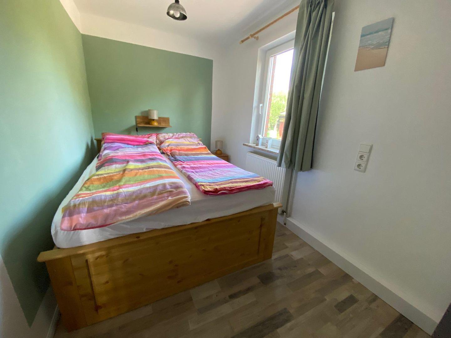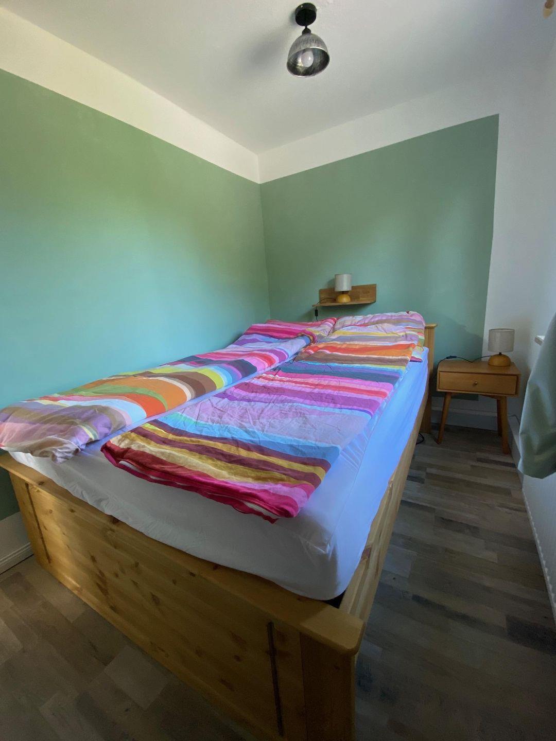 Das Schlafzimmer ist mit einem Doppelbett (140 x 200 cm), einem Kleiderschrank, Nachttischen und einer Kofferablage ausgestattet, sodass Sie bequem Ihren Aufenthalt genießen können.