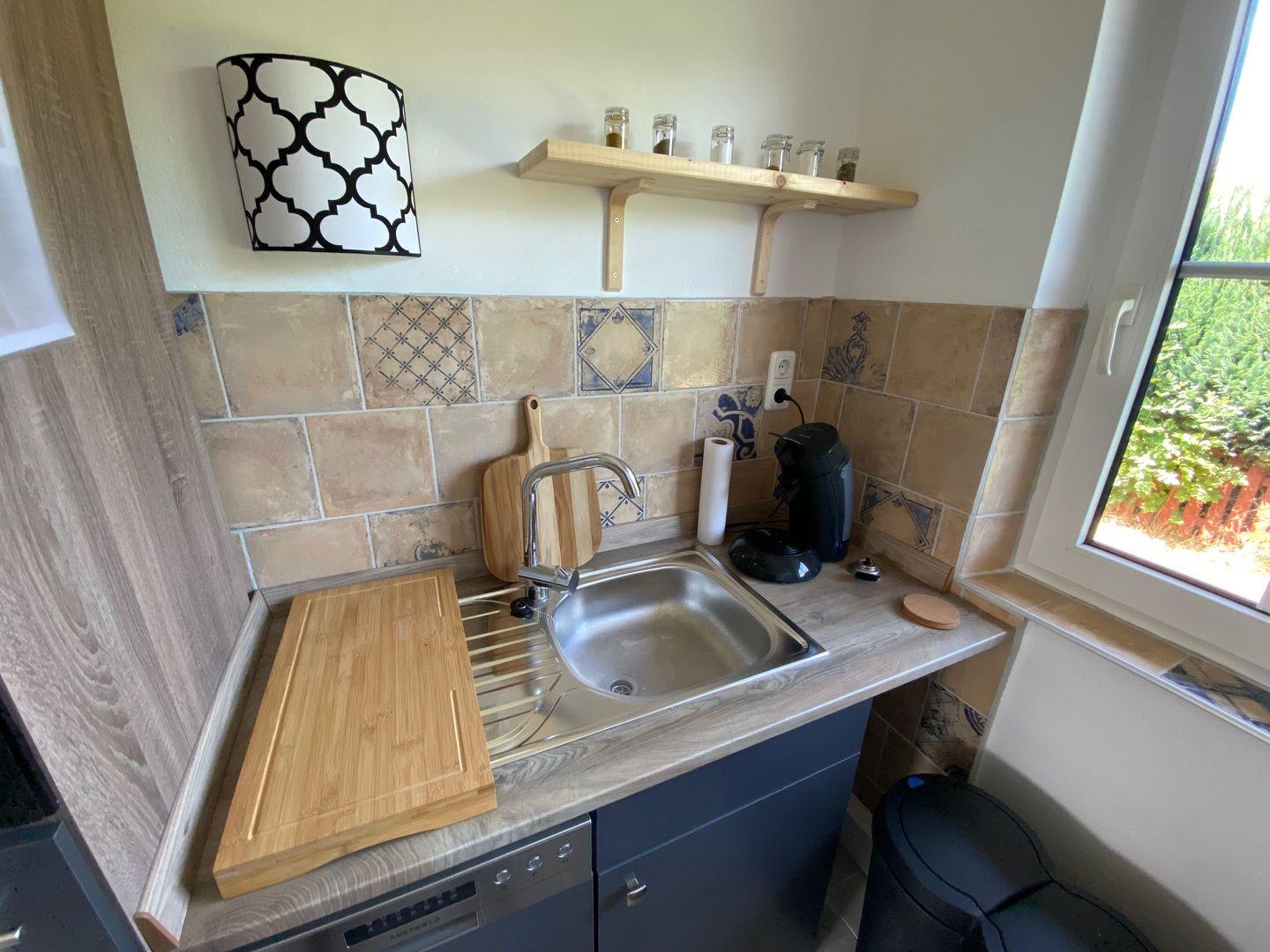 Die Küche mit moderner Küchenzeile ist ausgestattet mit Kühlschrank inklusive Gefrierfach, Backofen, Kochplatten, Spüle und Spülmaschine.