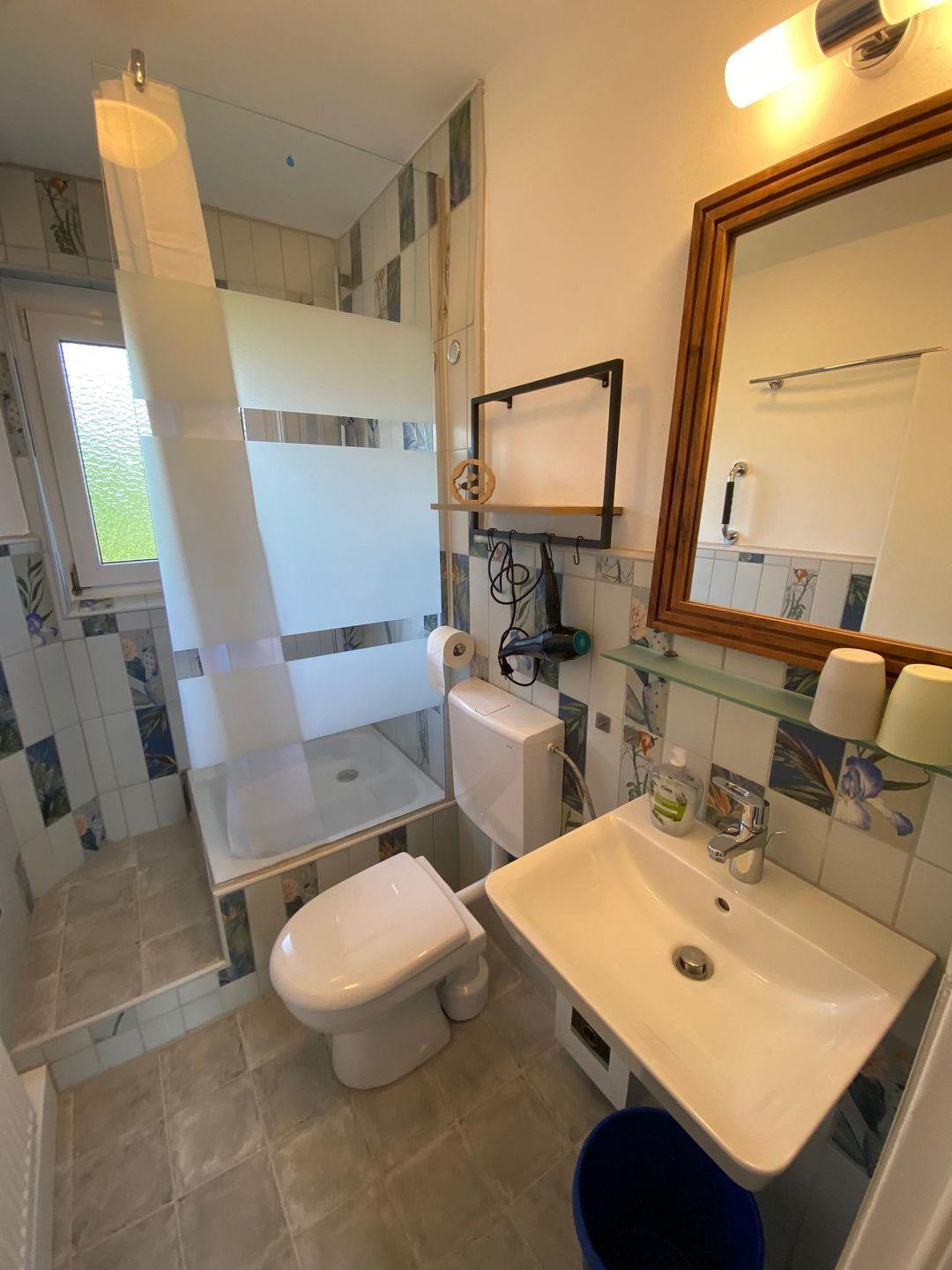 Das Badezimmer verfügt über eine Dusche, einen Waschtisch, ein WC, einen beleuchteten Spiegel und einen Fön.