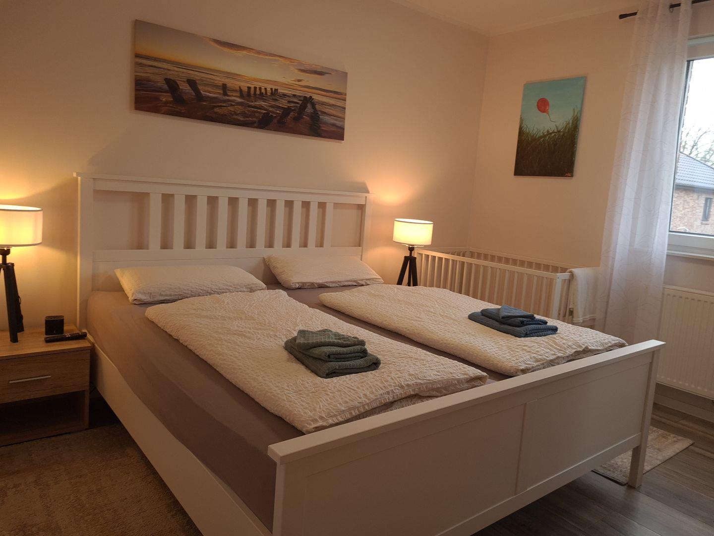 Es gibt 2 separate Schlafzimmer, eines mit großem Doppelbett (180x200cm), TV und Kleiderschrank, das andere mit 2 Einzelbetten (90x200cm), TV und Kleiderschrank.