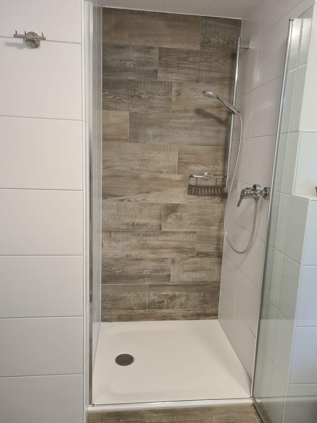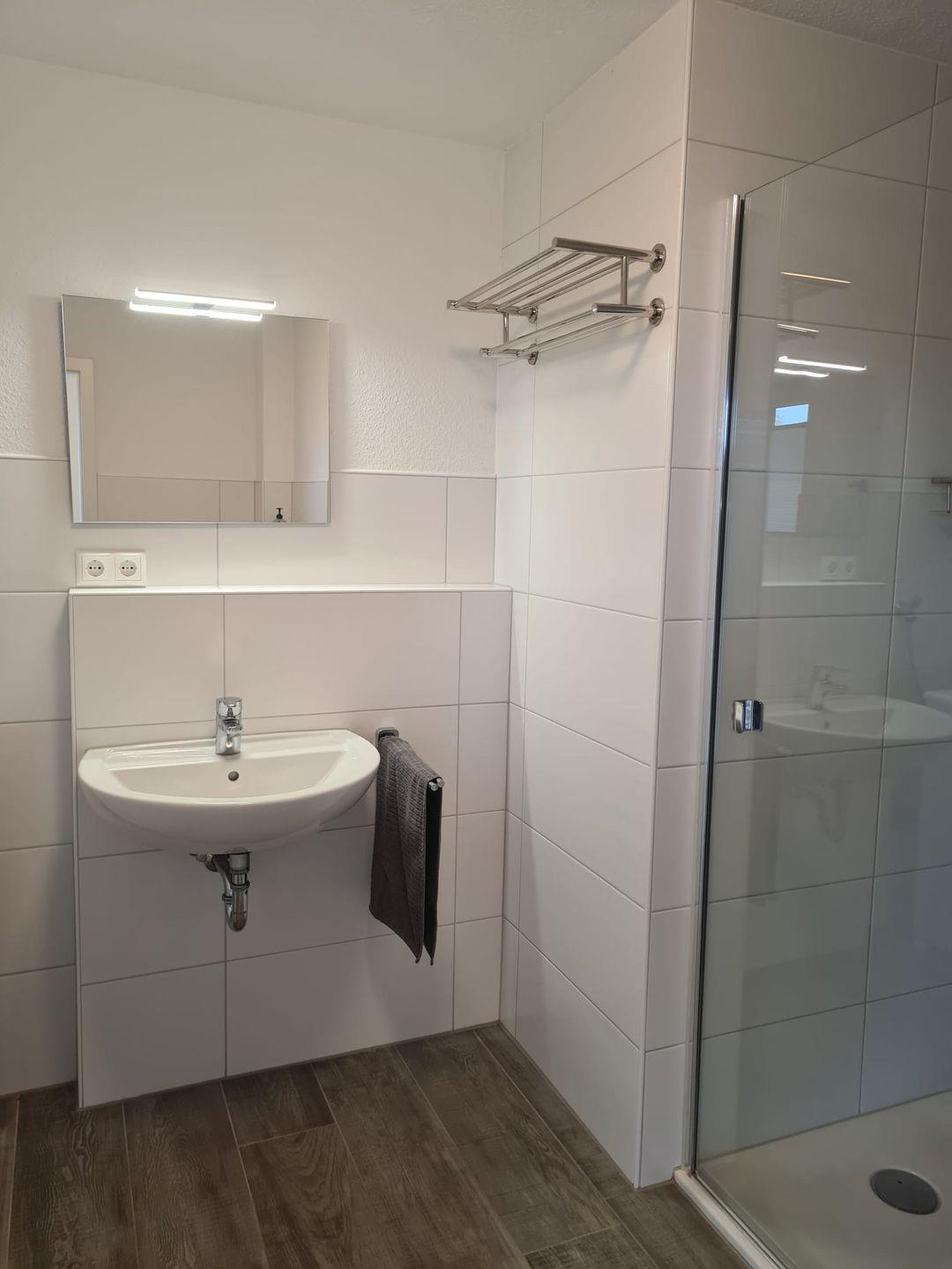 Zwei separate Schlafzimmer sowie ein modernes Badezimmer mit großer bodentiefer Dusche runden das Angebot ab.