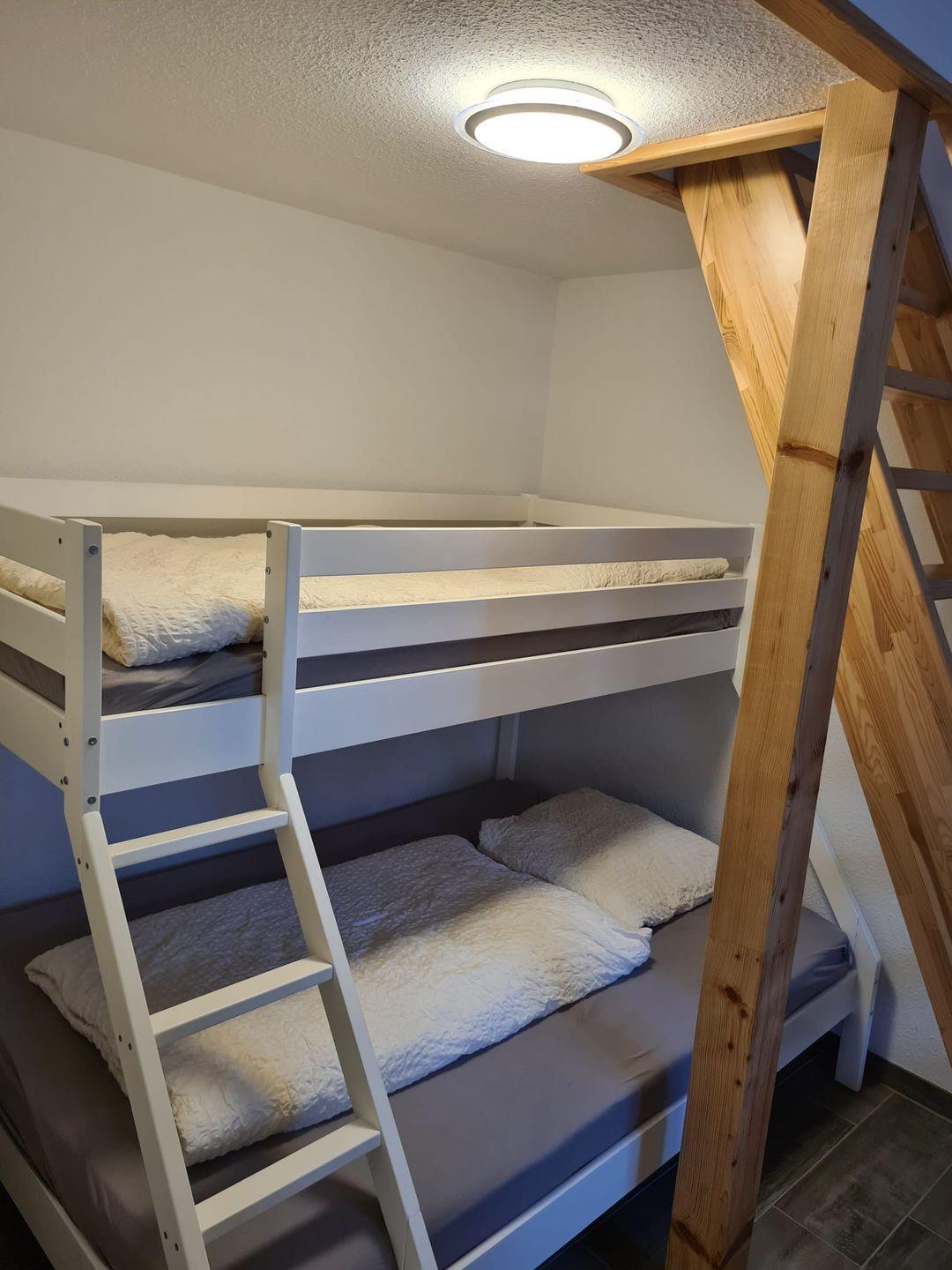 Das Hauptschlafzimmer verfügt über ein Doppelbett (180x 200). Das zweite Schlafzimmer ist mit einem Etagenbett (140X200 und 90X200) ausgestattet. Die zusätzliche Spielebene mit Schlafsofa ist vom 2 Schlafzimmer über eine Raumspartreppe zu erreichen.