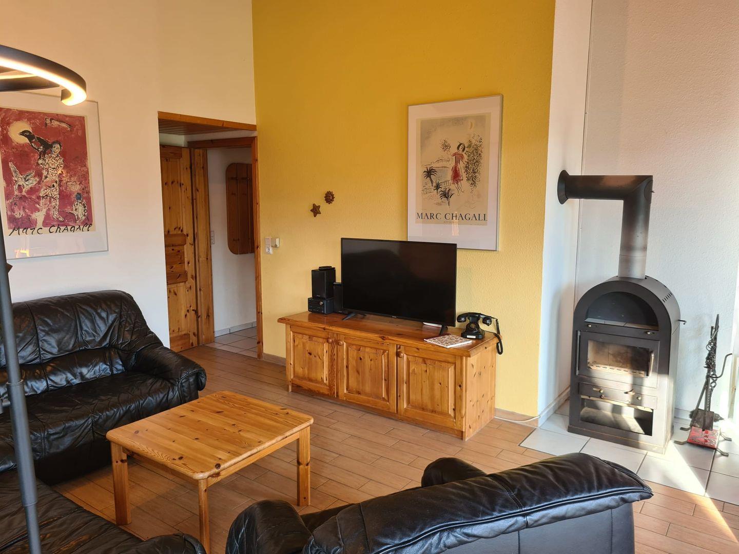 Der Kaminofen im Wohnzimmer vermittelt an kalten Tagen eine behagliche Wohnatmosphäre.