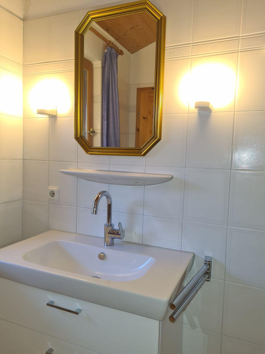 Das Bad verfügt über eine Dusche, WC und Waschbecken. Das Bad wurde im Februar 2023 in großen Teilen erneuert.