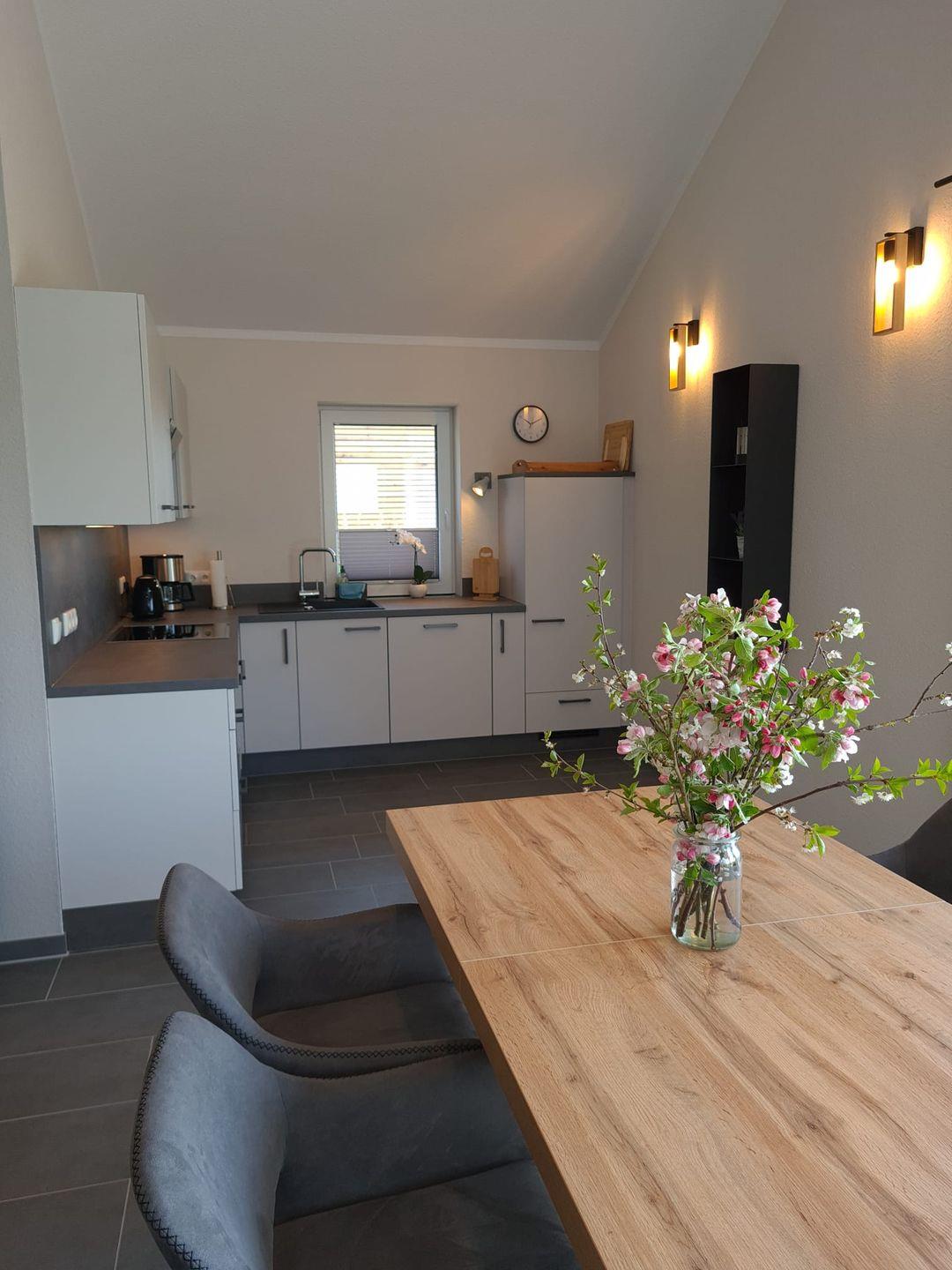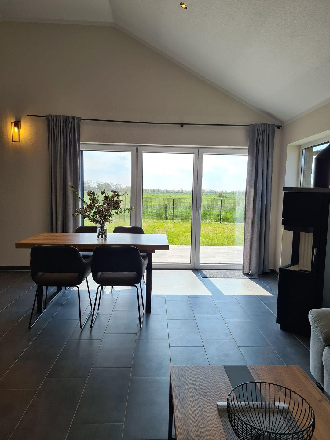 Der großzügige, helle Wohnbereich mit offener Küche lässt keine Wünsche offen. Ob vom bequemen Sofa aus, oder direkt vom Essbereich, sie genießen jederzeit den freien Blick in die offene Landschaft der Wesermarsch. Wenn die Sonne einmal nicht scheinen sollte vermittelt der Kamin viel Wärme und Gemütlichkeit.