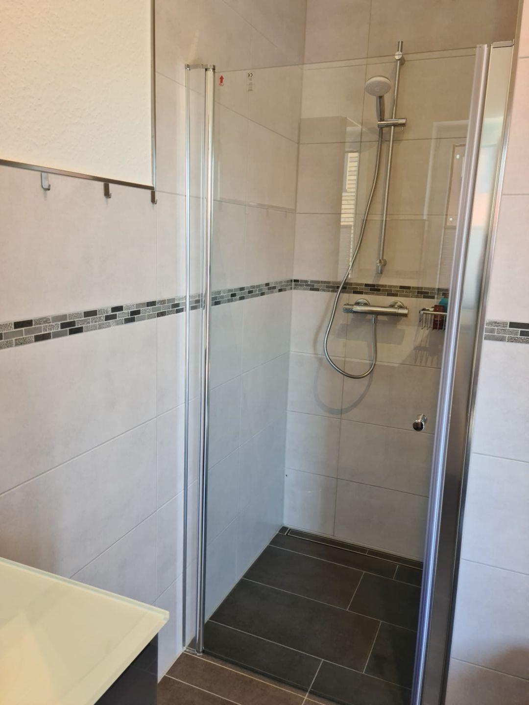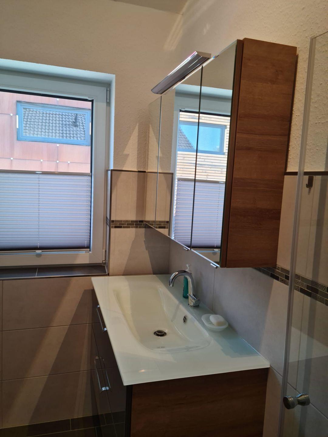 Das Bad verfügt über eine ebenerdige Dusche, WC und Waschbecken. Der Waschtisch und Spiegelschrank sind komfortabel mit viel Platz und Stellmöglichkeiten ausgestattet.