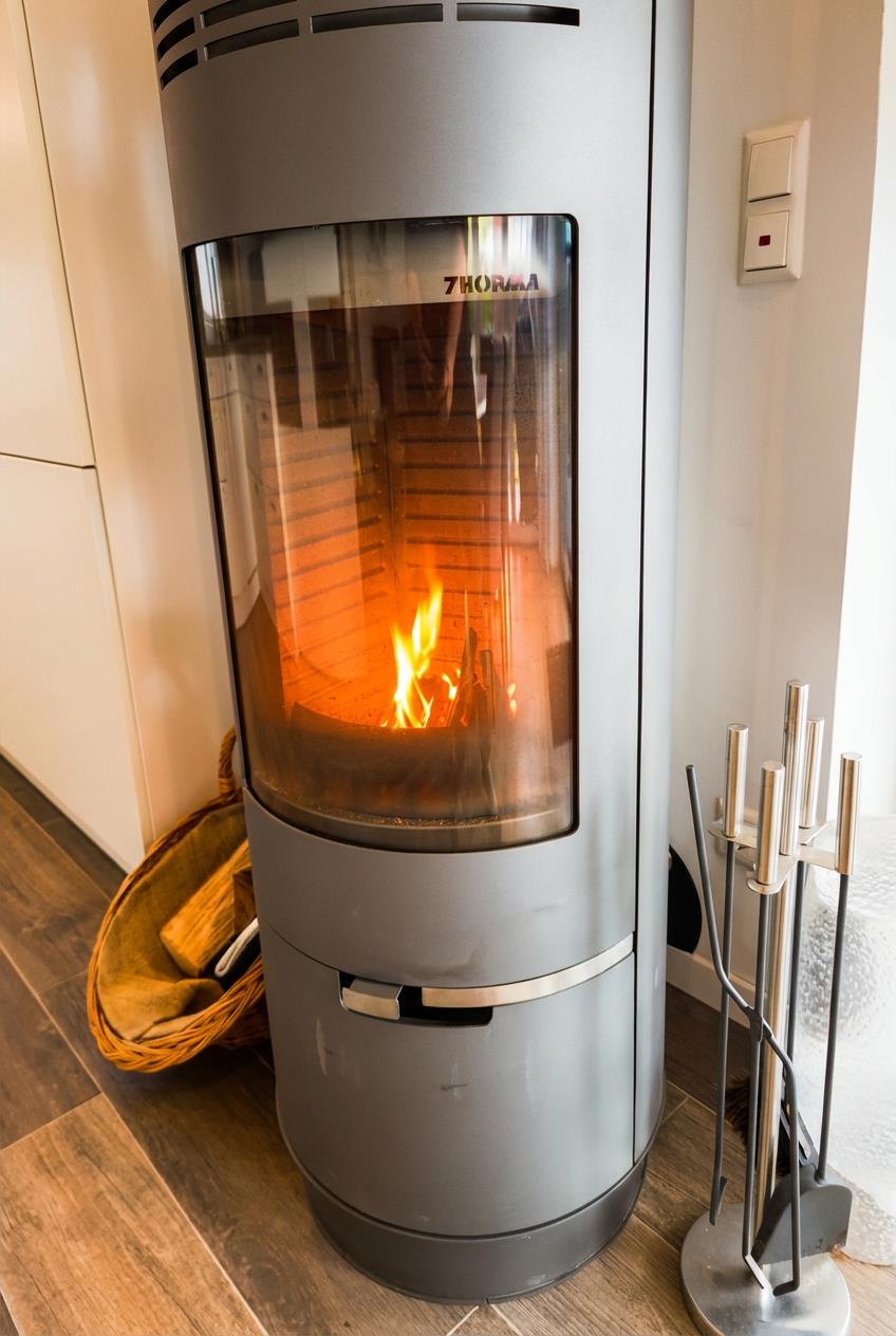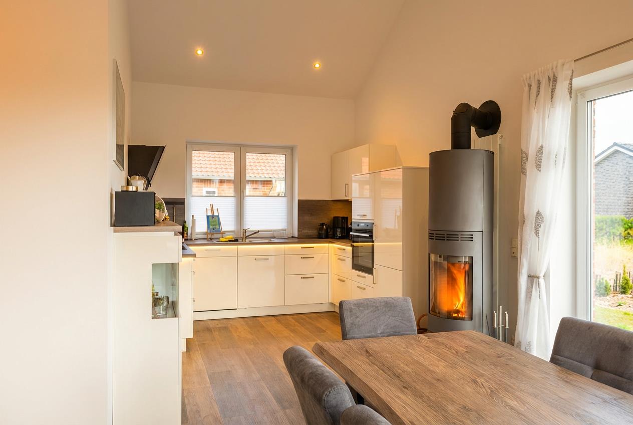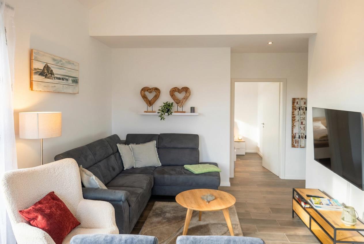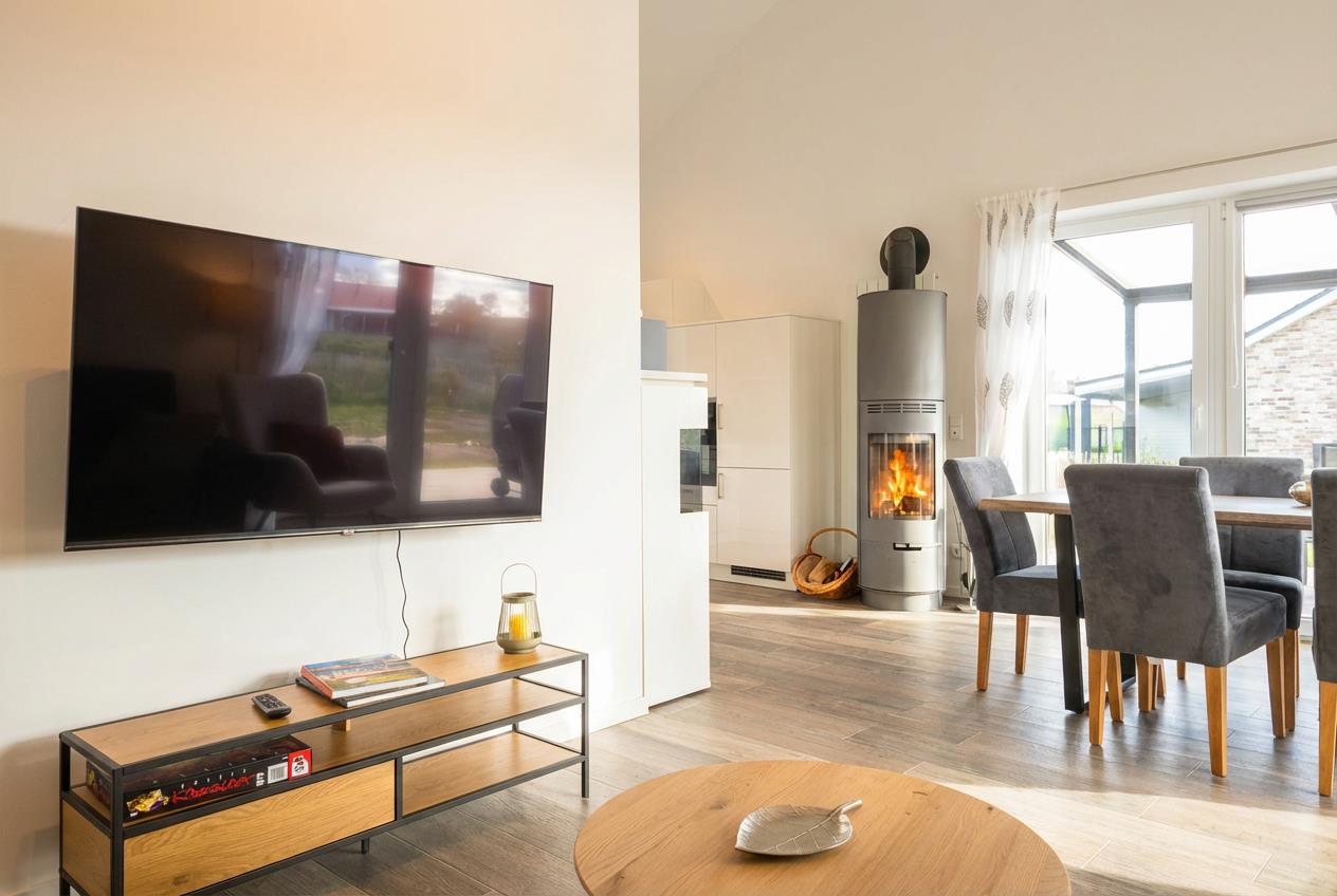 Das Wohnzimmer ist mit Sofa und Lesesessel gemütlich eingerichtet und verfügt über einen Smart-TV und eine Stereoanlage. Der Essbereich bietet Platz für 6 Personen an einem großen Tisch mit bequemen Stühlen. An kühlen Abenden können Sie den modernen Kaminofen nutzen. Es gibt zwei Schlafzimmer, von denen eines rollstuhlgerecht ist. In einem Schlafraum steht im unteren Bereich ein Doppelbett, ein Fernseher ist an der gegenüberliegenden Wand angebracht. Eine kleine geschlossene Holztreppe (Kindersicher mit Törchen) führt nach oben in die Dachgalerie. In dem Bereich sind zwei Einzelbetten optimal als ganz eigener Schlaf-und Spielbereich für Kinder.