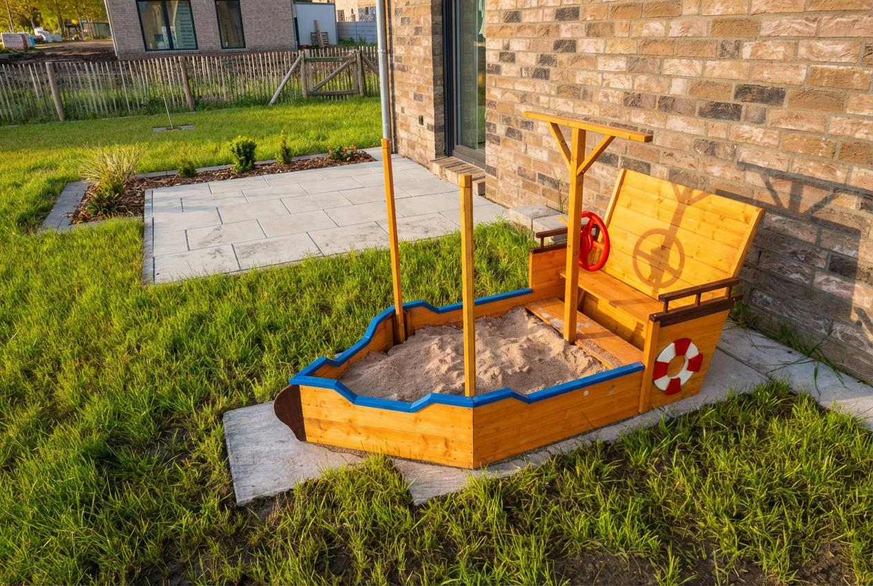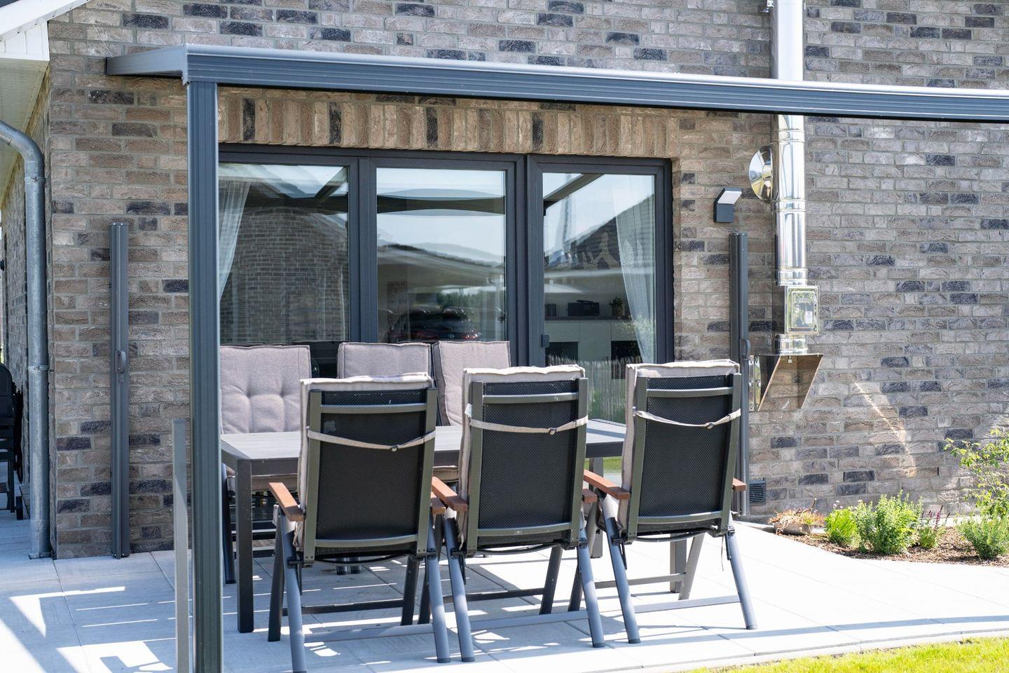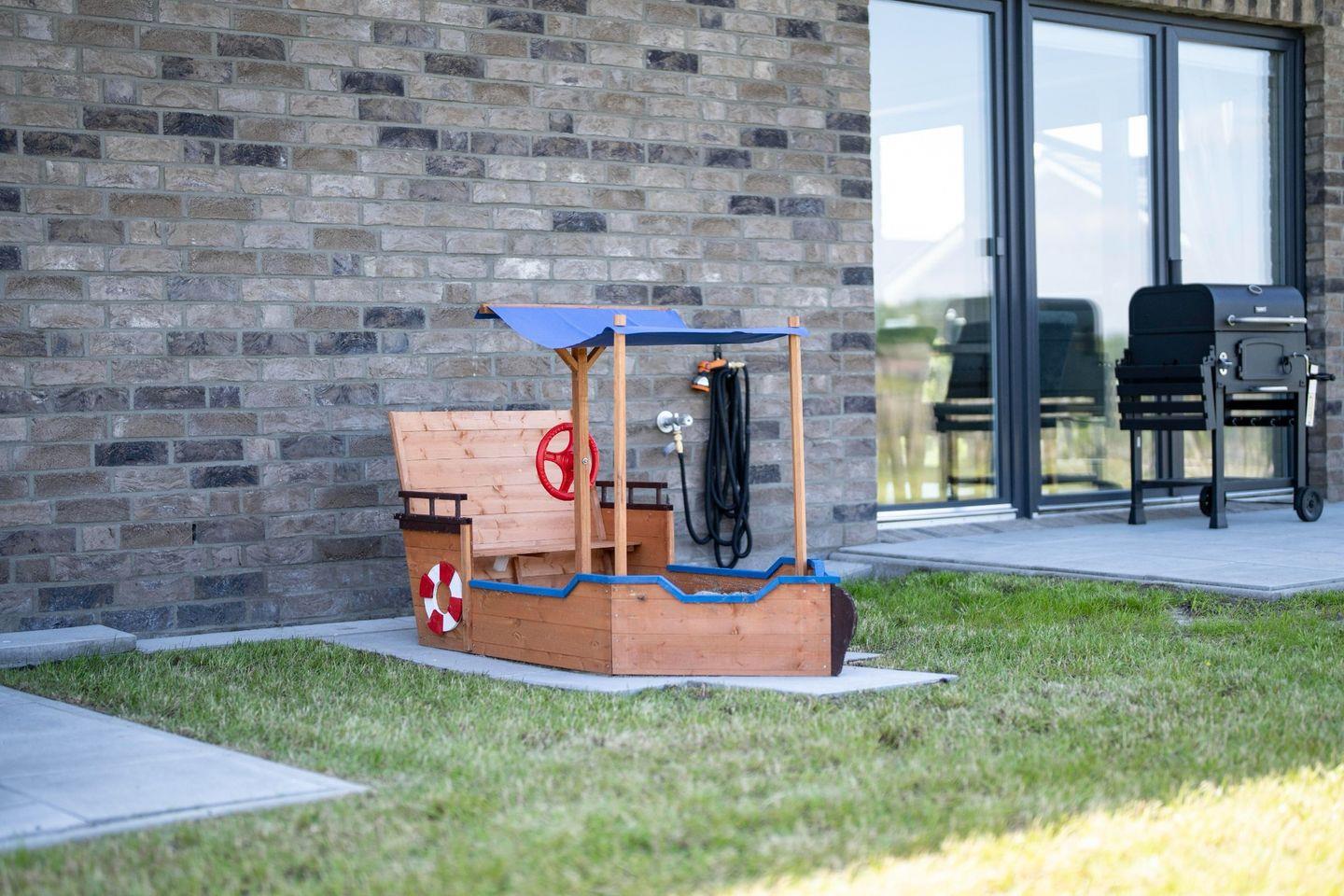 Eine überdachte Terrasse (mit integriertem ausziehbarem Windschutz) lädt zum Verweilen ein. Die kleinere Terrasse vor dem Schlafzimmer verführt dazu, den Sonnenuntergang vor dem Schlafengehen zu genießen. Es gibt 6 Gartenstühle, 2 Liegestühle und für alle Gartenmöbel sind natürlich passende Polster vorhanden. Ein Grill mit Smoker steht für BBQ-Abende bereit. Ein Sandkasten in Form eines Piratenboots bietet Kindern Spaß und Unterhaltung. Es gibt einen abschließbaren Abstellraum für Ihre Fahrräder. Eine Wallbox ist installiert, so können Sie direkt am Haus Ihr E-Auto aufladen. Die Abrechnung erfolgt hierfür direkt über Kreditkartenzahlung.