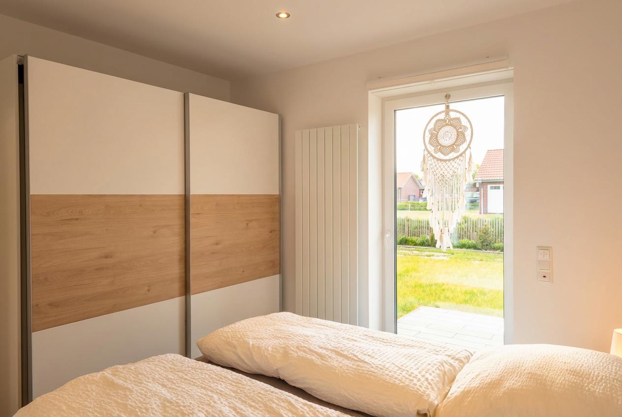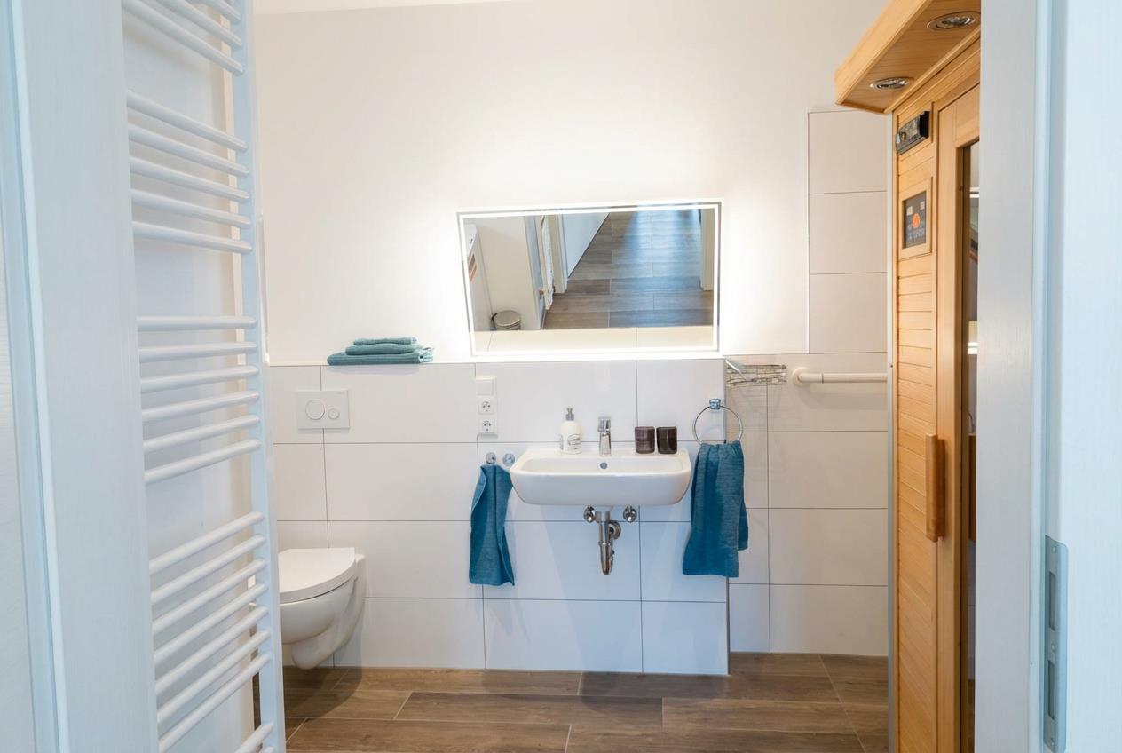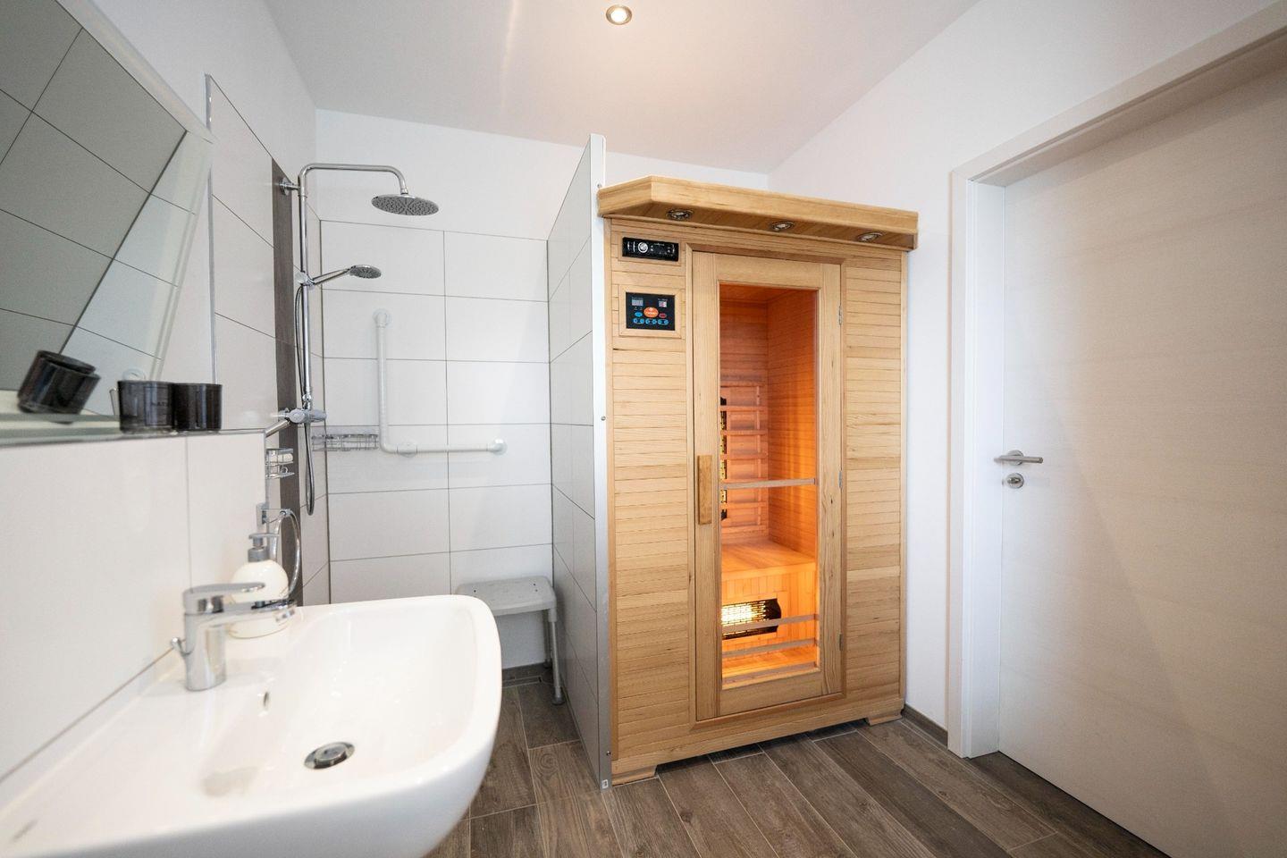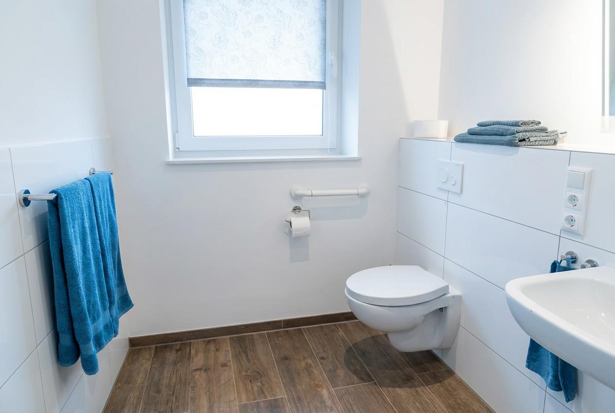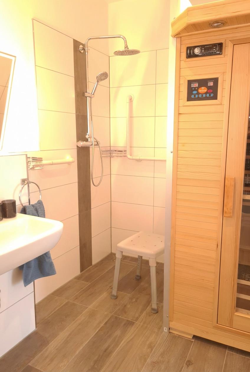 Das Wieken-Huus bietet besonders Menschen mit Gehbehinderung eine gute Grundausstattung. Schwellenlosen Zugang zur Haustür und Terrasse. Alle Türen sind 100cm breit, das Bad verfügt über eine ebenerdige Dusche mit Duschhocker und 2 Haltegriffen. Auch neben der Toilette befindet sich ein Griff. Der Spiegel ist gekippt, somit ist das Frisieren im Sitzen kein Problem. Im Bad befindet sich eine Infrarotsauna, die Badzimmertür geht zur Sicherheit nach außen auf. Waschmaschine, Trockner, Wäscheständer und Bügeleisen sind ebenfalls vorhanden. Zu Ihrer Sicherheit sind Rauchmelder, sowie ein Feuerlöscher installiert, der Erste-Hilfe-Koffer ist vorhanden.