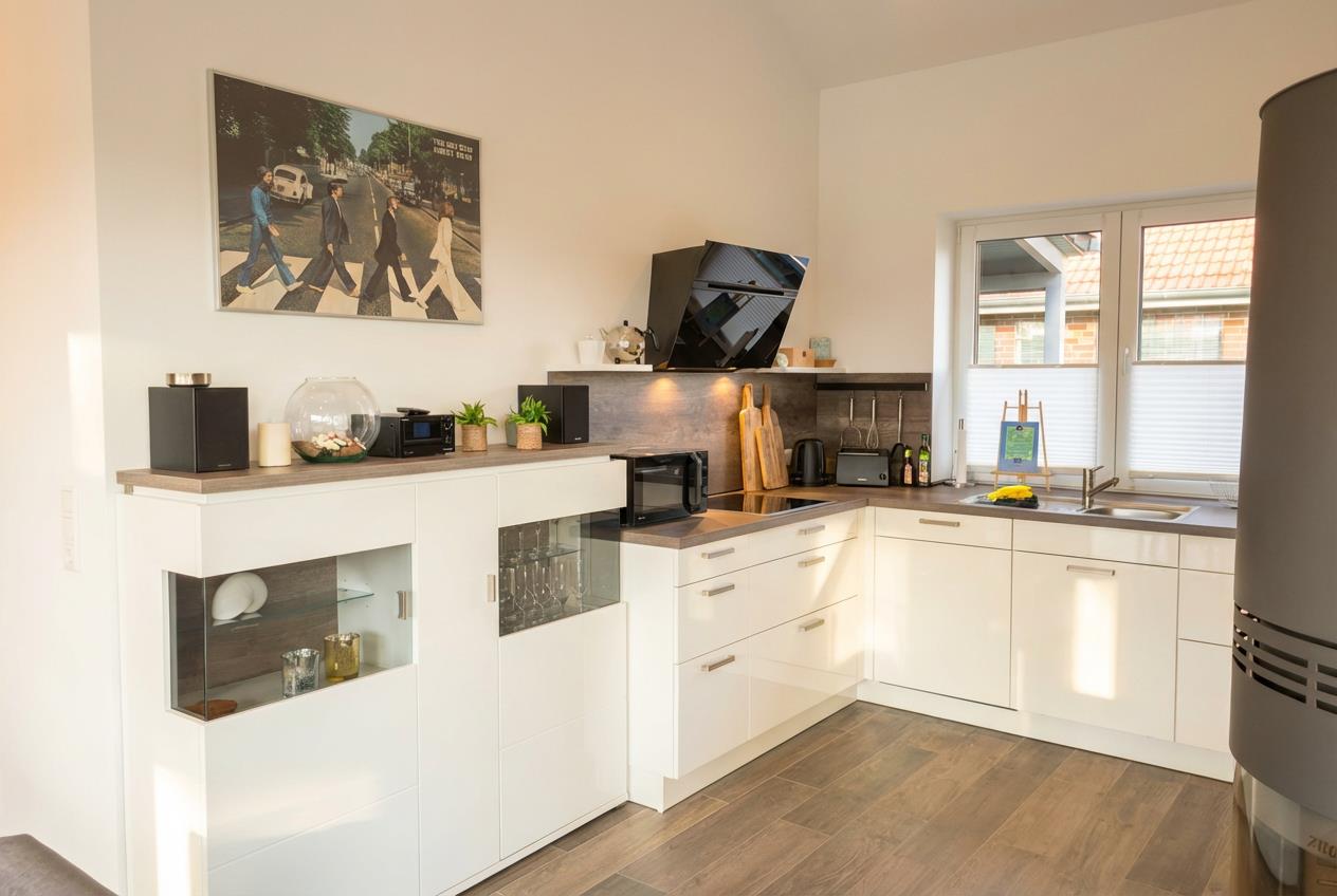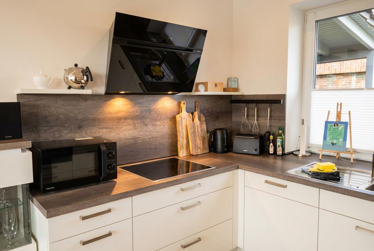 Die Küche ist voll ausgestattet mit hochwertigem Geschirr, Besteck und Gläsern für 12 Personen. Sie verfügt über einen Herd, Backofen, Mikrowelle, Kühlschrank mit Gefrierschrank, Kaffeemaschine (Filter und Senseo), Toaster, Eierkocher, Wasserkocher, Pürierstab, sowie Mixer und die dazugehörenden Backutensilien. Für die gesellige Runde ist ein Raclette-Grill vorhanden. Eine kleine Auswahl an Gewürzen steht ebenfalls zur Verfügung. Neben der Terrasse gibt es einen kleinen Kräutergarten.