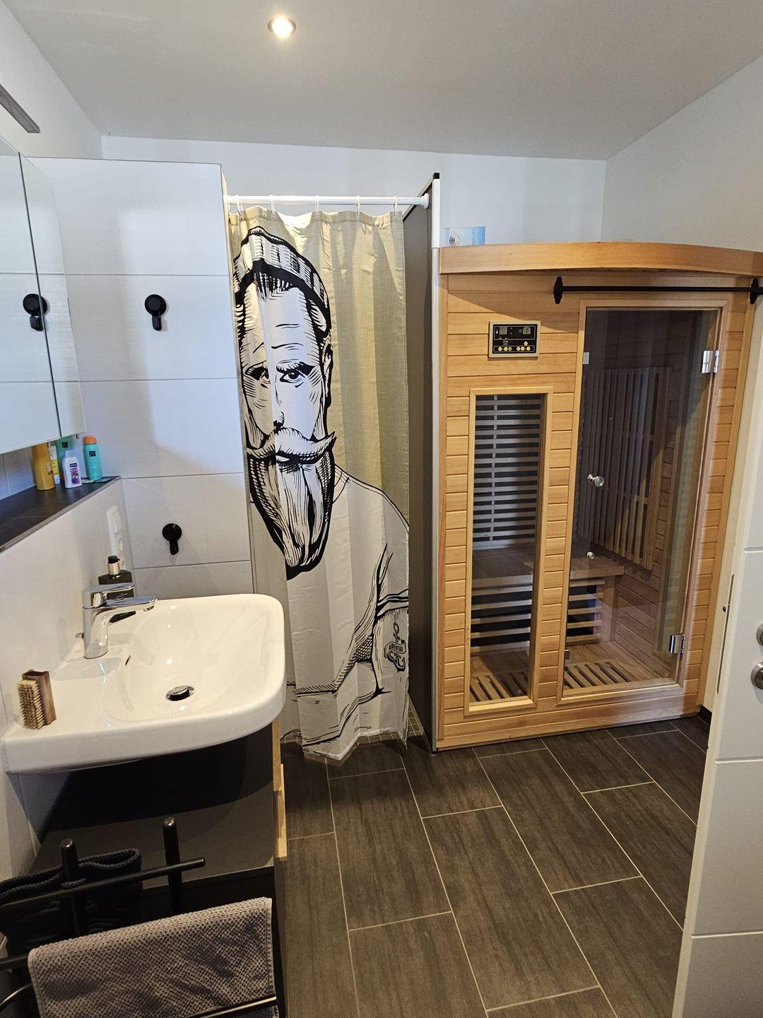Das Haus ist komfortabel gestaltet und lädt vom ersten Moment an zum Wohlfühlen ein. Das Badezimmer verfügt über eine ebenerdige Dusche sowie eine Infrarotsauna für entspannende Wellnessmomente. Waschmaschine und Wäscheständer sind ebenfalls vorhanden. Ein Gäste-WC ist ebenfalls vorhanden.