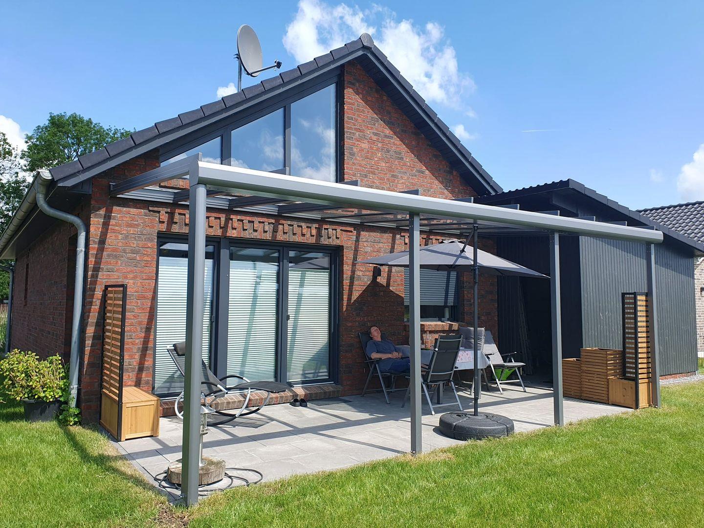 Die überdachte Terrasse und Gartenmöbel laden bei nahezu jedem Wetter zum Verweilen ein und bietet einen schönen Platz, um den Tag entspannt ausklingen zu lassen.