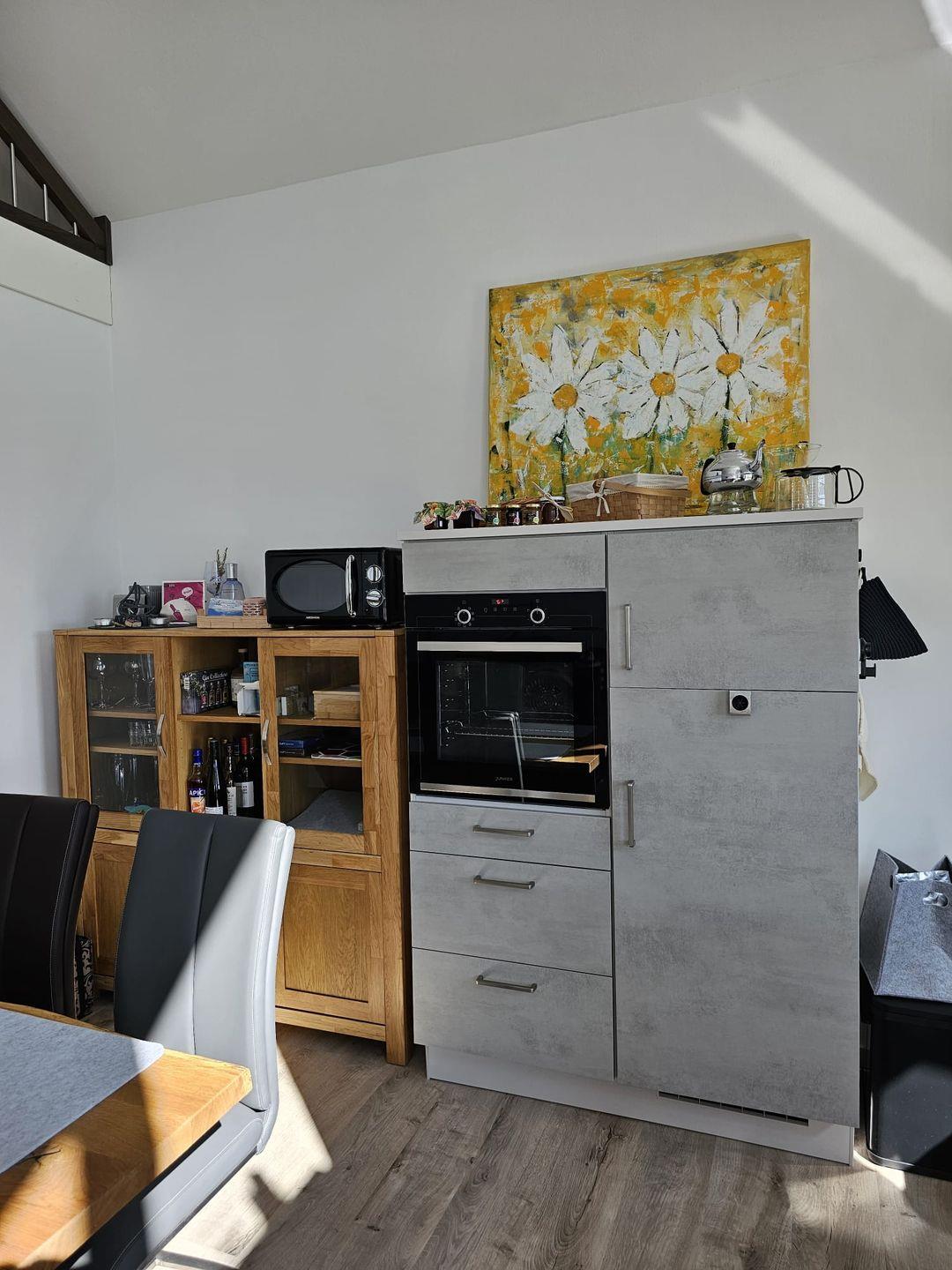 Die voll ausgestattete Küche lässt keine Wünsche offen. Sie verfügt über Herd und Backofen, Mikrowelle, Kühlschrank mit Gefrierfach, Kaffeemaschine, Toaster, Eierkocher und Wasserkocher.