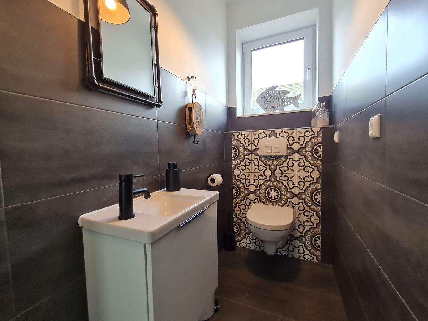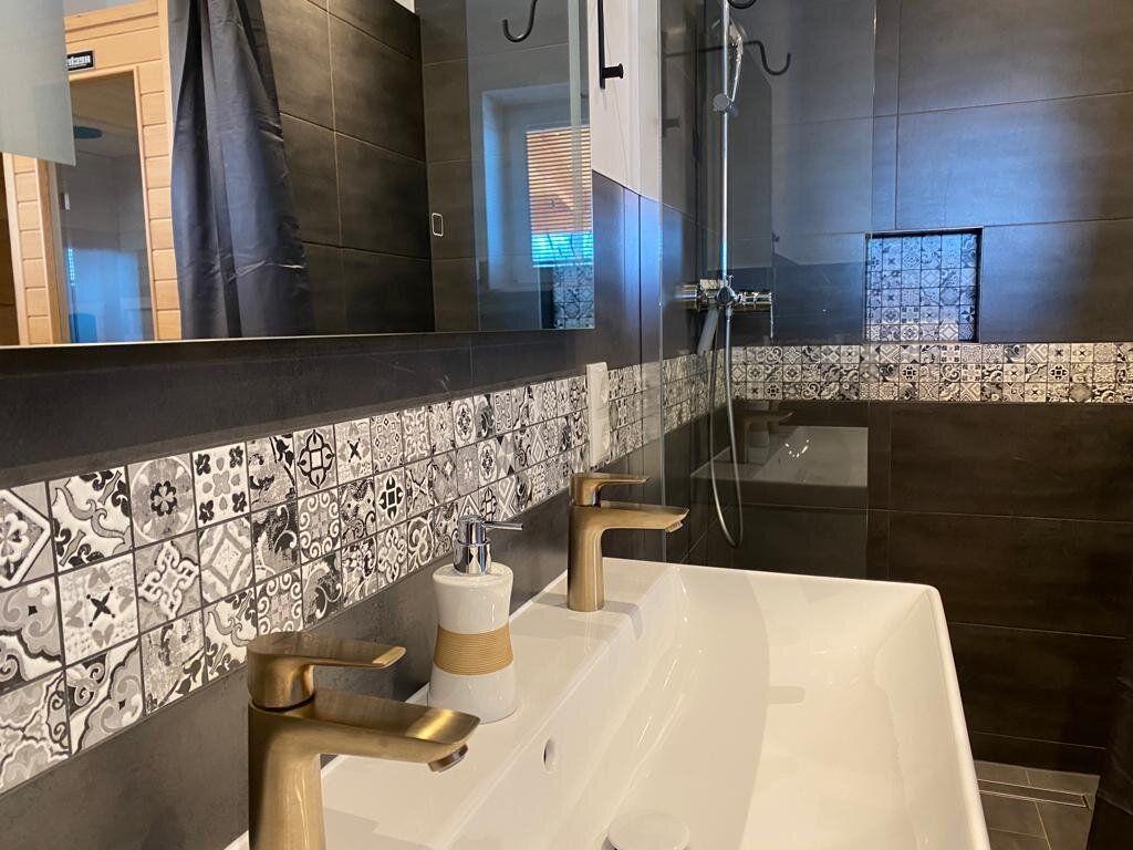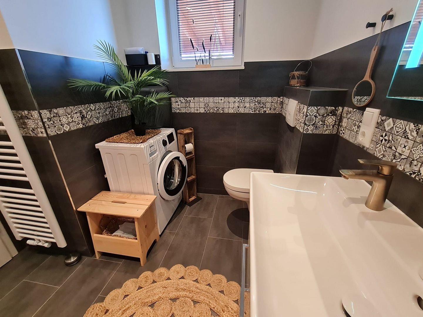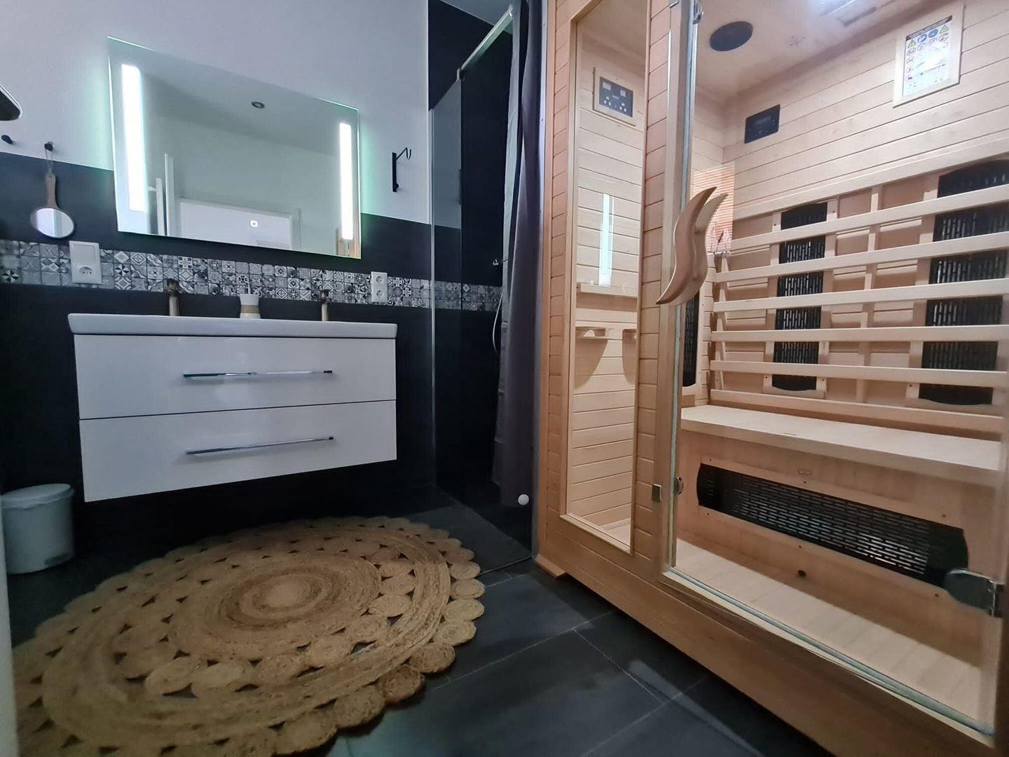 Auch das Badezimmer ist barrierefreundlich ausgestattet. Es gibt eine Infrarot-Wärmekabine (Privatsauna), Handtuchwärmer, Waschmaschine und ein Gäste-WC.