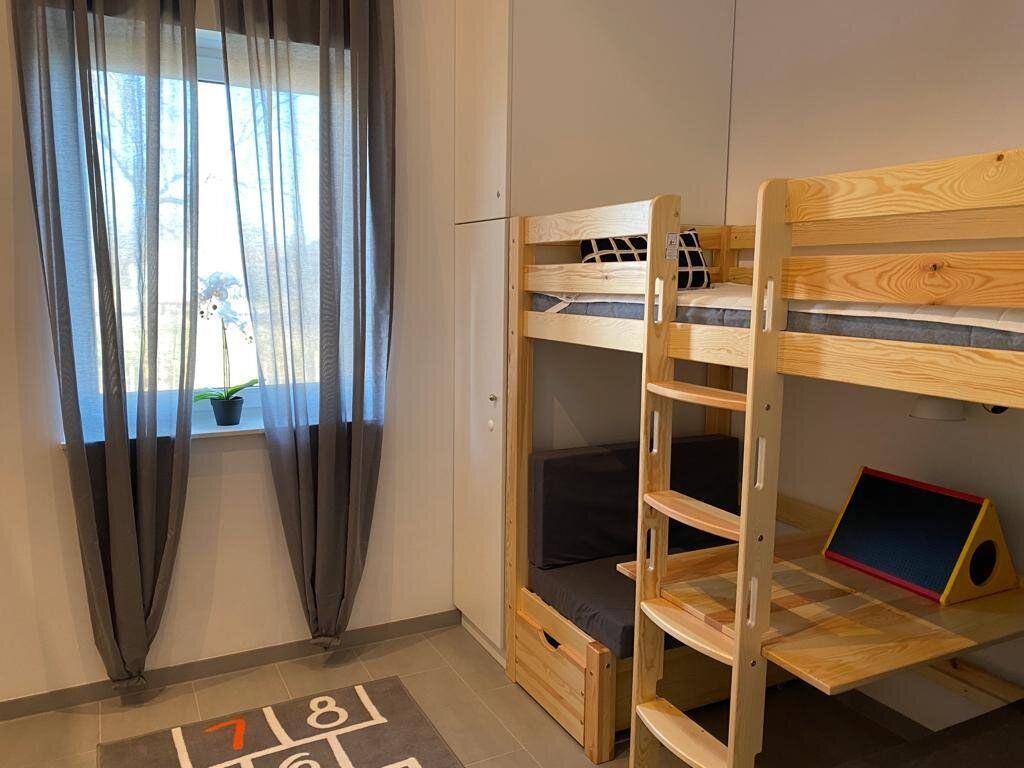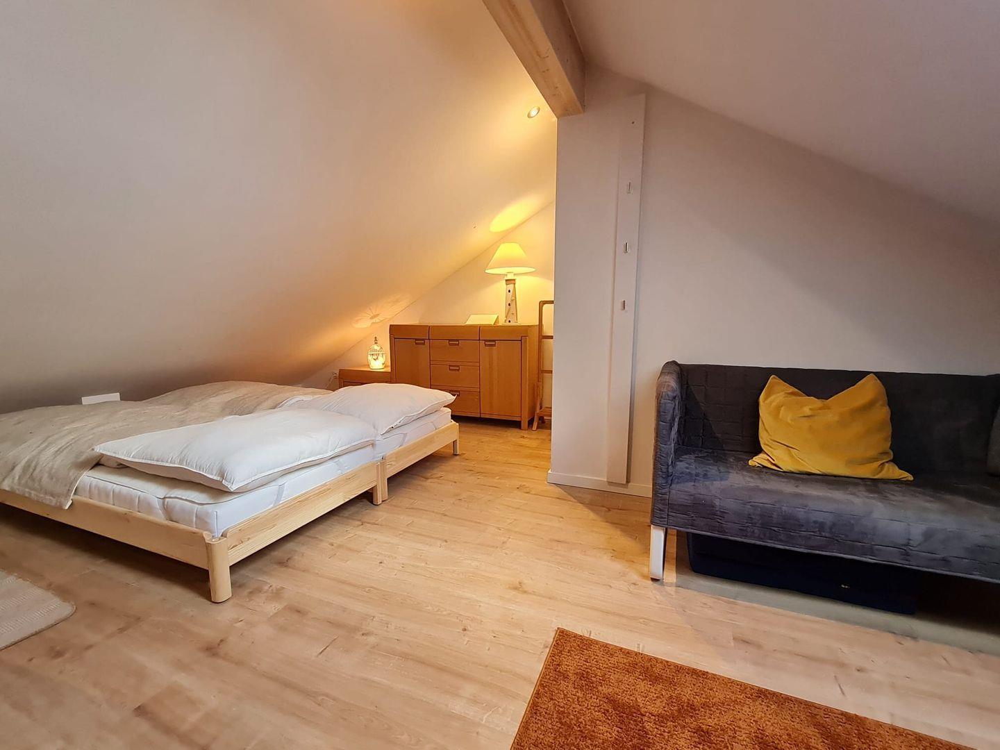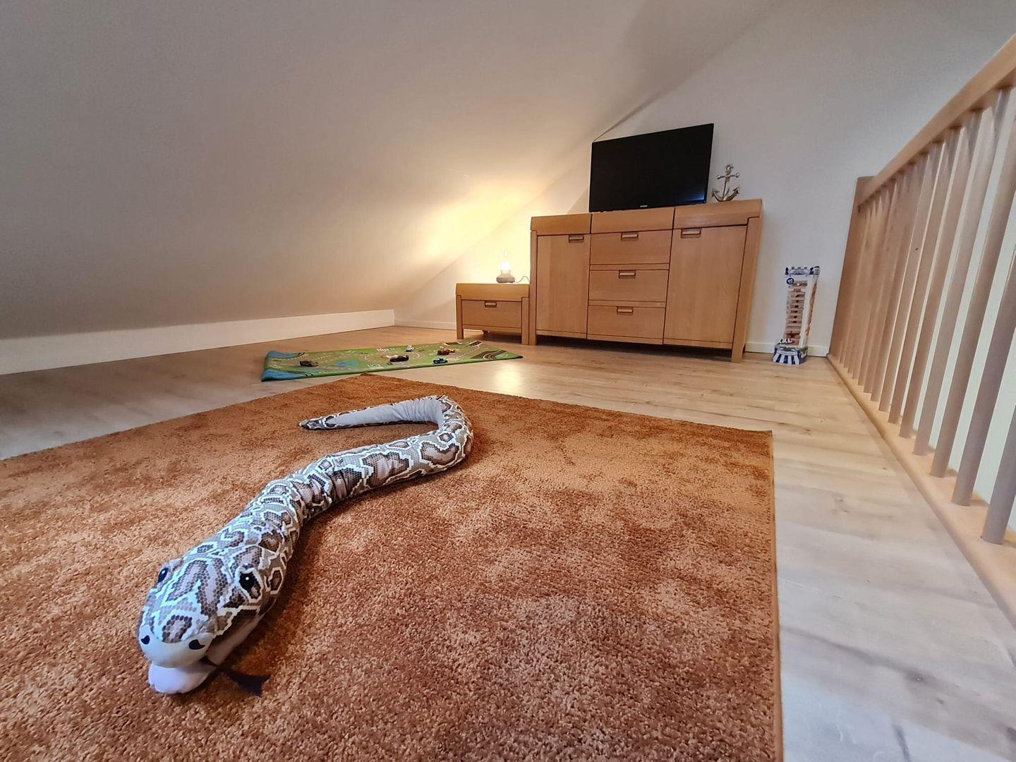 Das Haus ist barrierefreundlich, verfügt über viel Platz und eine Sonnenterrasse. Das großzügige Wohn- und Esszimmer verfügt über eine gemütliche Couch, einen Gas-Kamin und eine top moderne Küche mit 6 Plätzen. Die Kücheninsel hat im Induktionsfeld eine integrierte Dunstabzugshaube Es gibt ein Hauptschlafzimmer mit Boxspringbett und ein kleineres Schlafzimmer mit Etagenbett, welches auch als Spieltisch nutzbar ist und einer Spielebene mit weiteren zwei Betten. Hier oben kann man gemütlich entspannen. Treppenschutzgitter oben und unten vorhanden. Hochwertige Plissee/ Verdunkelung und Fußbodenheizung sind ebenfalls vorhanden.