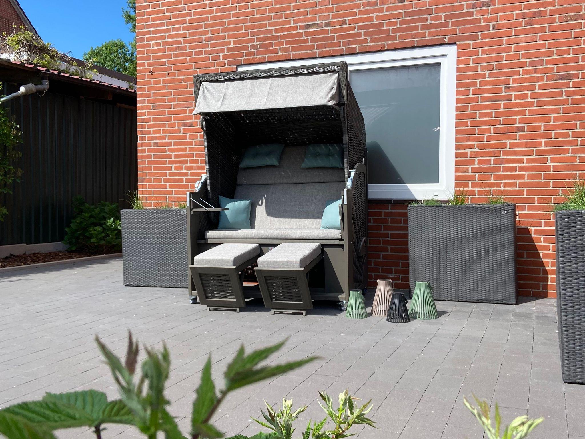 Zur Wohnung gehört eine kleine Terrasse mit Gartenmöbeln.