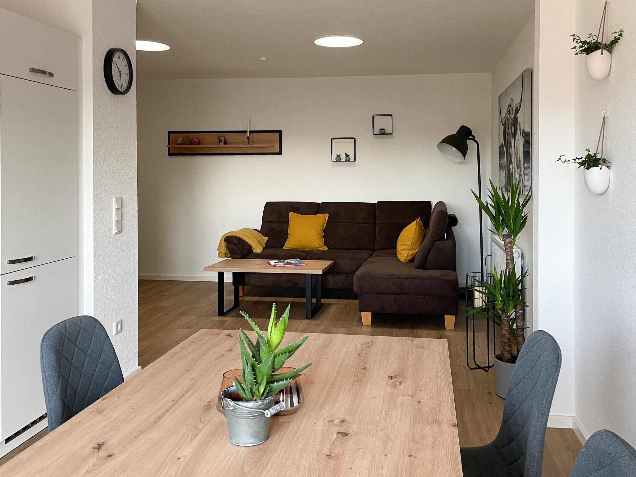 • Großzügige Wohnküche mit Sofa, Küche mit Spülmaschine und Backofen und großem Esstisch
