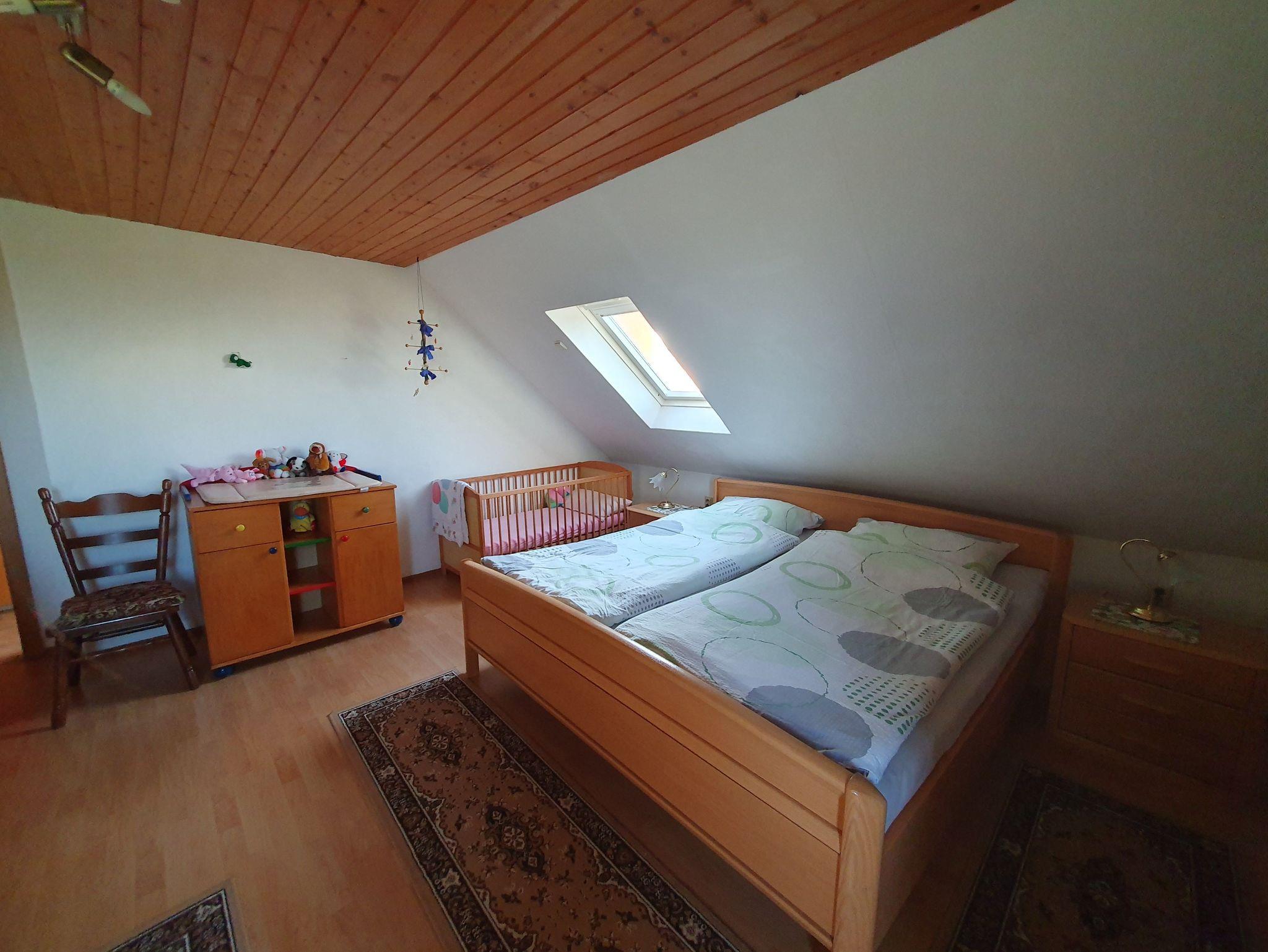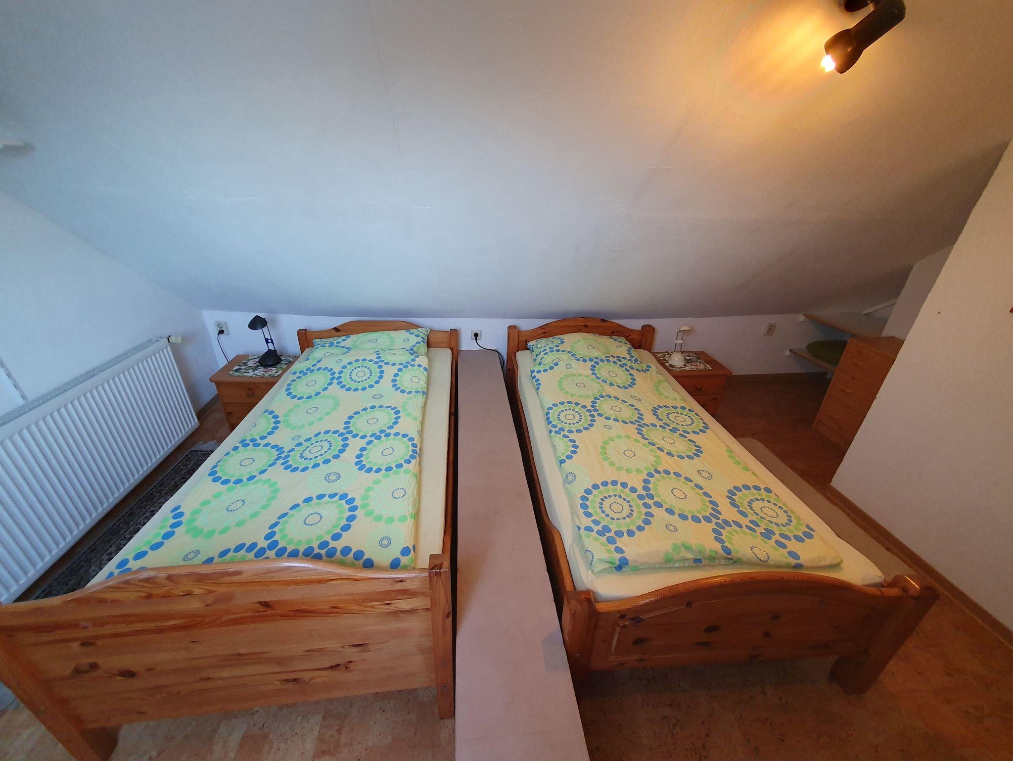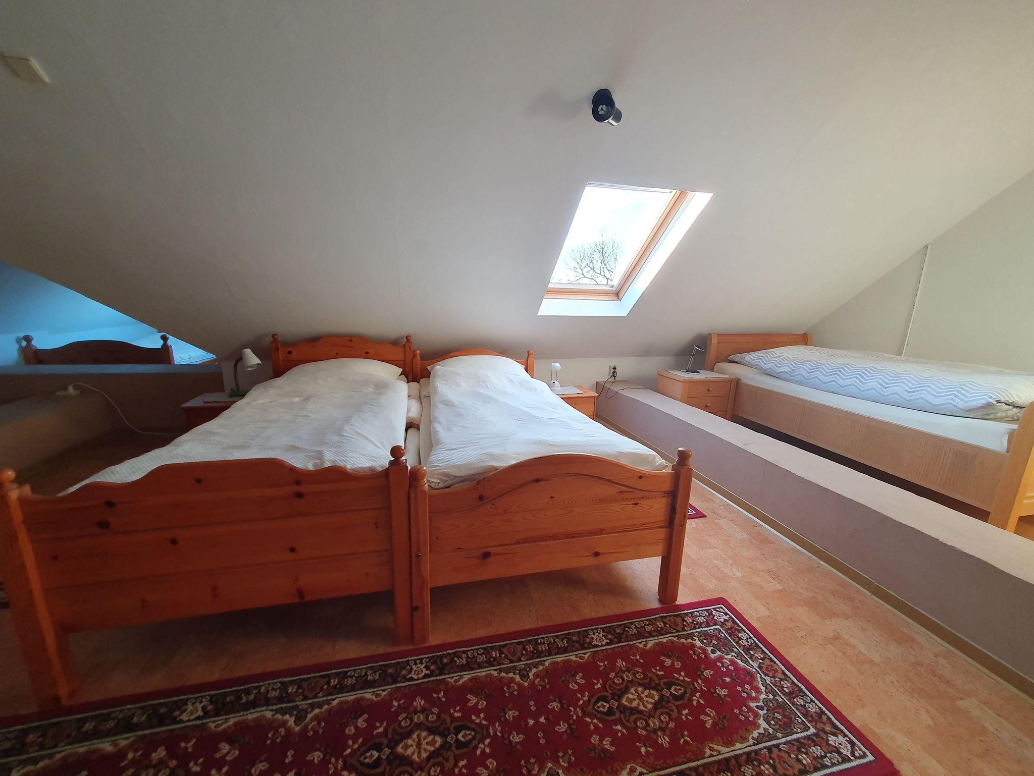 Es gibt ein Zimmer mit einem Einzelbett, ein Zimmer mit Doppelbett und Einzelbett, ein Zimmer mit Doppelbett, Kinderbett und Einzelbett und unterm Dach einen großen, aufgeteilten Raum mit 3 Einzelbetten, 2 Einzelbetten und einem Einzelbett.