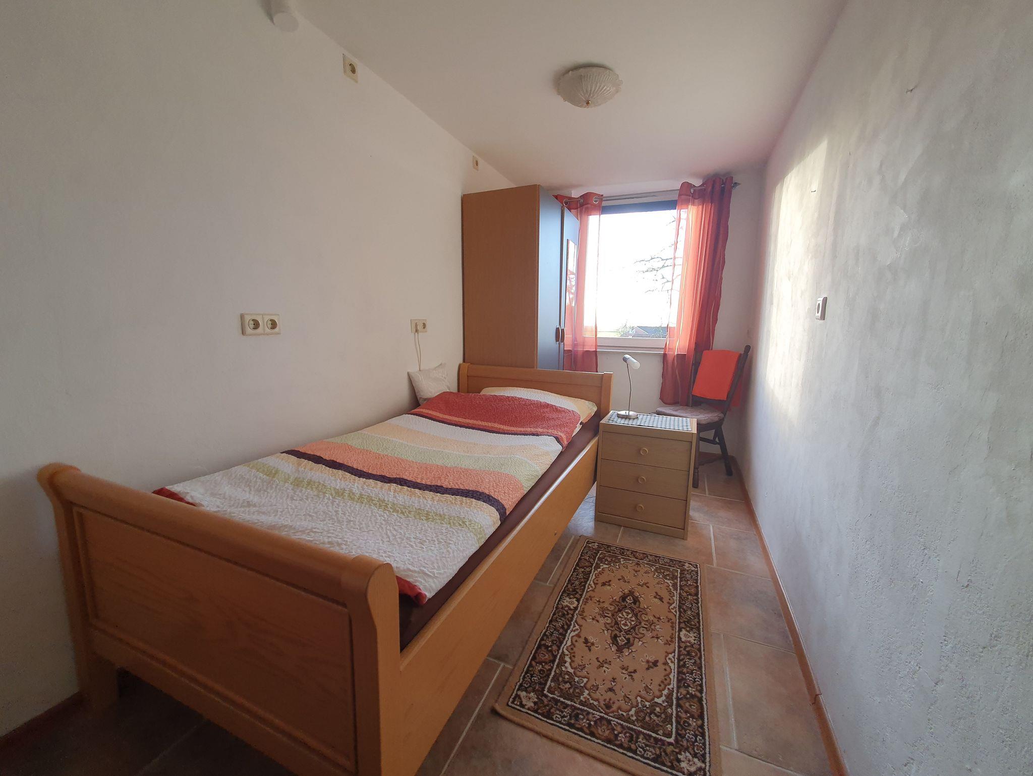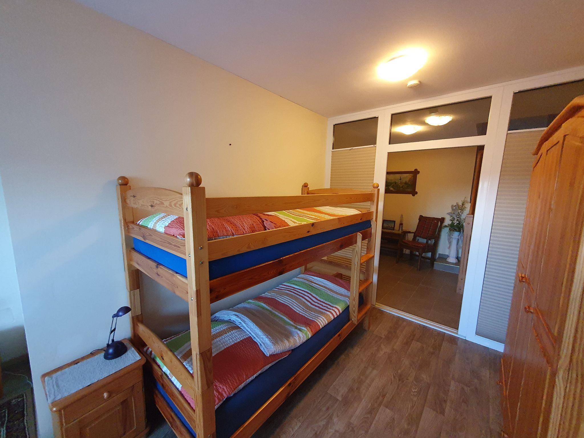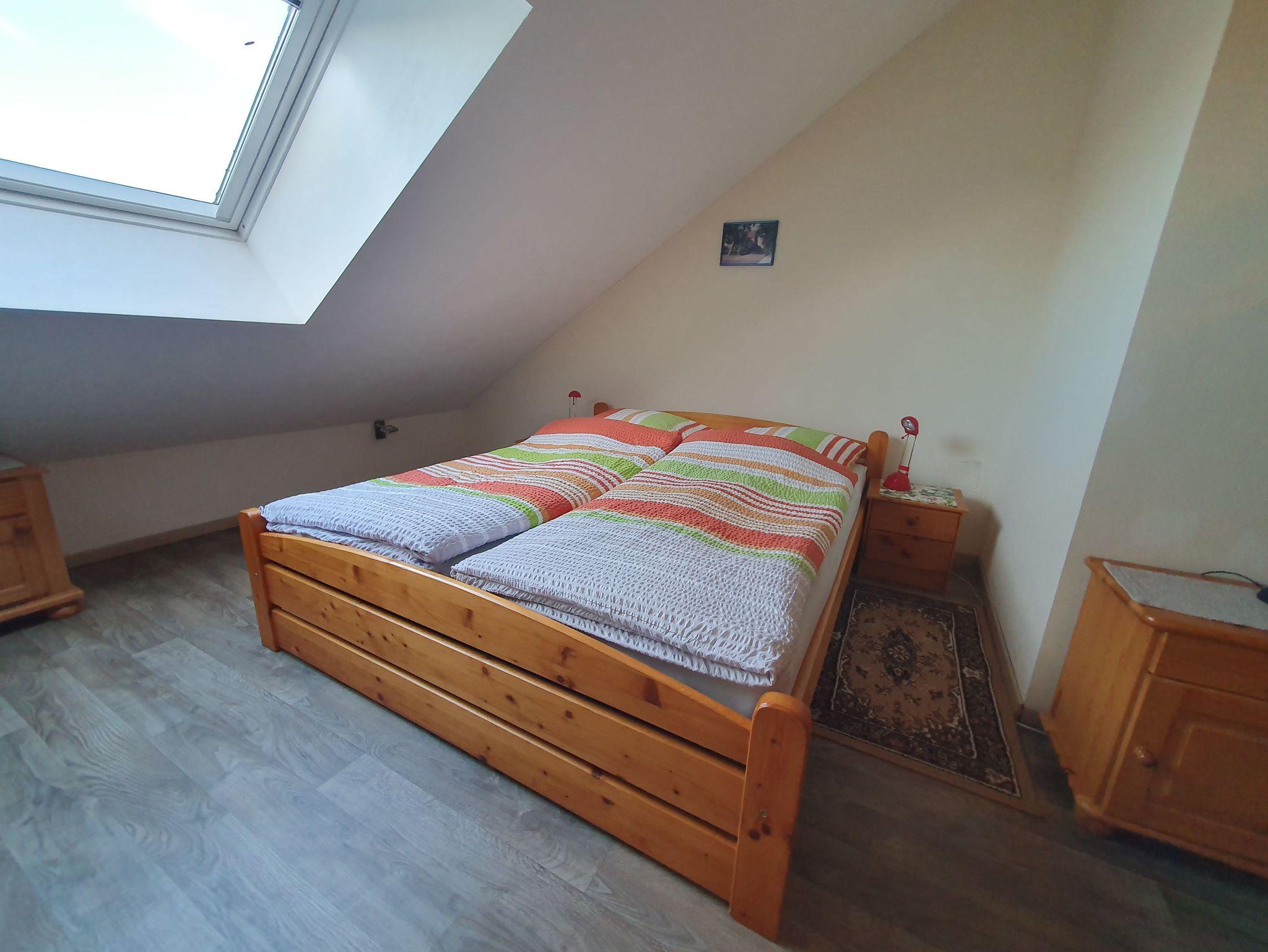 Es gibt ein Zimmer mit einem Einzelbett, ein Zimmer mit Doppelbett und Einzelbett, ein Zimmer mit Doppelbett, Kinderbett und Einzelbett und unterm Dach einen großen, aufgeteilten Raum mit 3 Einzelbetten, 2 Einzelbetten und einem Einzelbett.