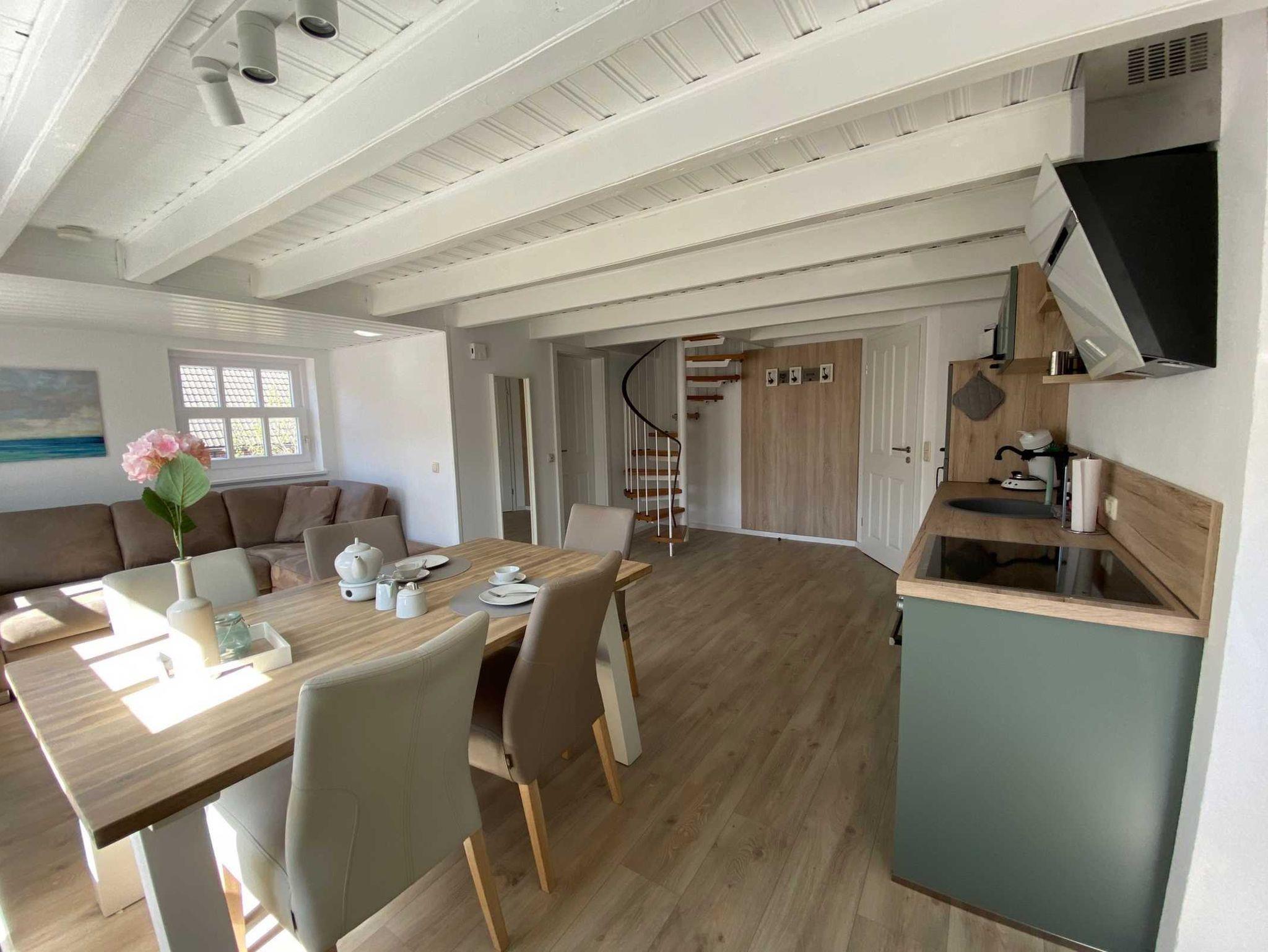 Koje 3 lädt auf gemütlichen ca. 53qm über 2 Etagen, für bis zu 5 Personen, zum verweilen ein und bietet folgende Ausstattung: Wohnzimmer mit Couch-Ecke, Flat TV, angrenzende, offene Küche (inkl. Kaffeemaschine, Wasserkocher, Spülmaschine, Mikrowelle, Toaster, Backofen) und einen gemütlichen Essplatz. In der oberen Etage, die über eine Wendeltreppe erreichbar ist, befinden sich zwei Schlafräume, einmal mit einem Bett in 1,80x2,00m und im zweiten Raum 2x 0,90x2,00m, sowie ein Funktionssofa, welches mit einem Handgriff zu einem komfortablen Bett mit Matratze umfunktioniert werden kann. Modernes Bad mit WC, Dusche & Fön Bettwäsche, Handtücher und Enreinigung sind inklusive.