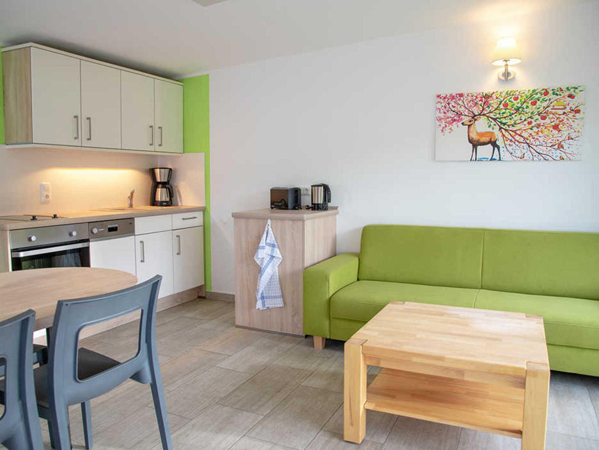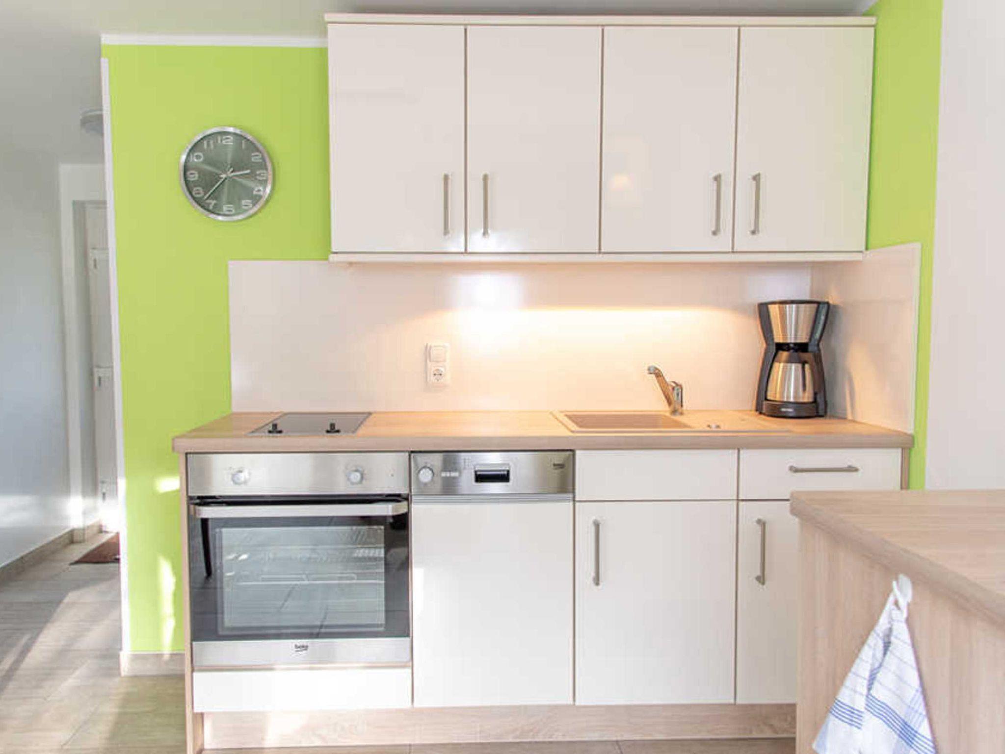 Die in den Wohnbereich integrierte Küche ist mit allem notwendigen Geschirr, Besteck, Gläsern und dazugehörigen Elektrogeräten (Kaffeemaschine, Toaster, Wasserkocher) ausgestattet. Sie verfügt über einen Geschirrspüler und Backofen. Eine Waschmaschine gibt es zur Gemeinschaftsnutzung gegen Gebühr. Für den täglichen Gebrauch haben wir zur Erstausstattung in jedem Haus, zwei Toilettenpapier, in der Küche zwei Mülltüten, zwei Tabs, Fit und Spüllappen.