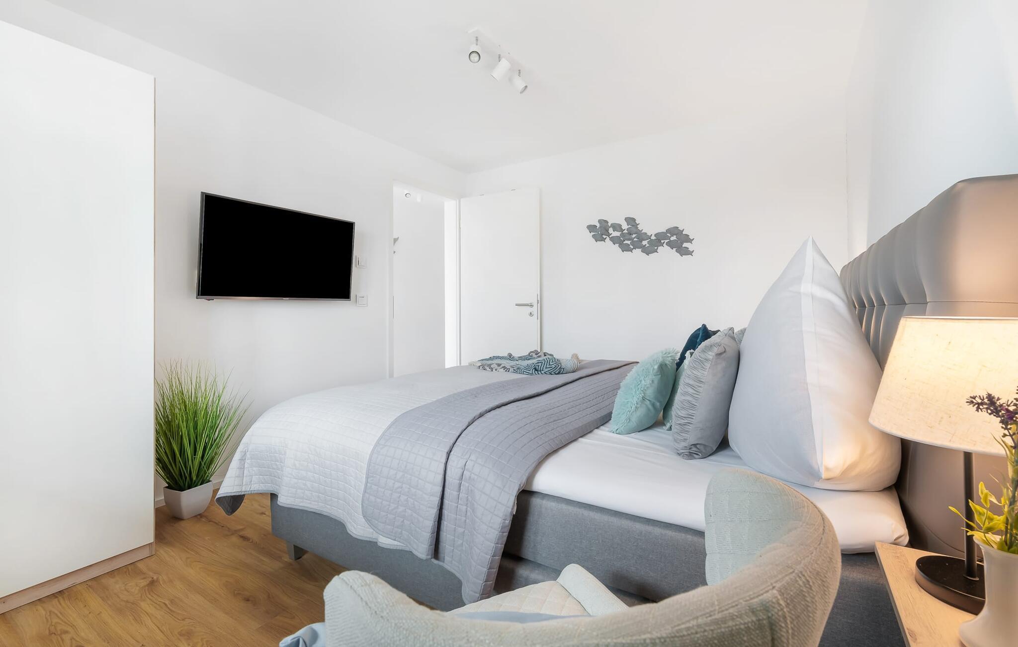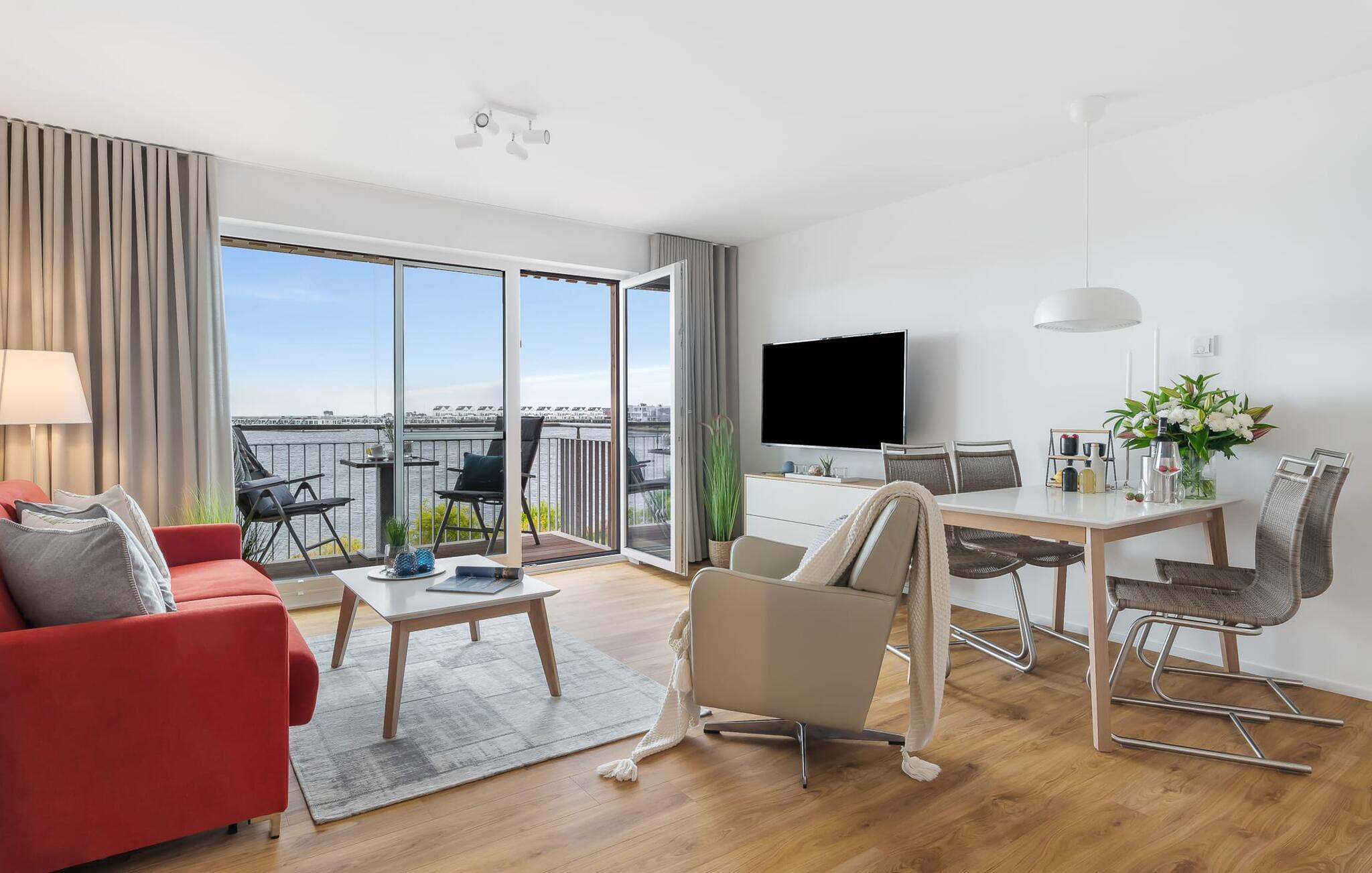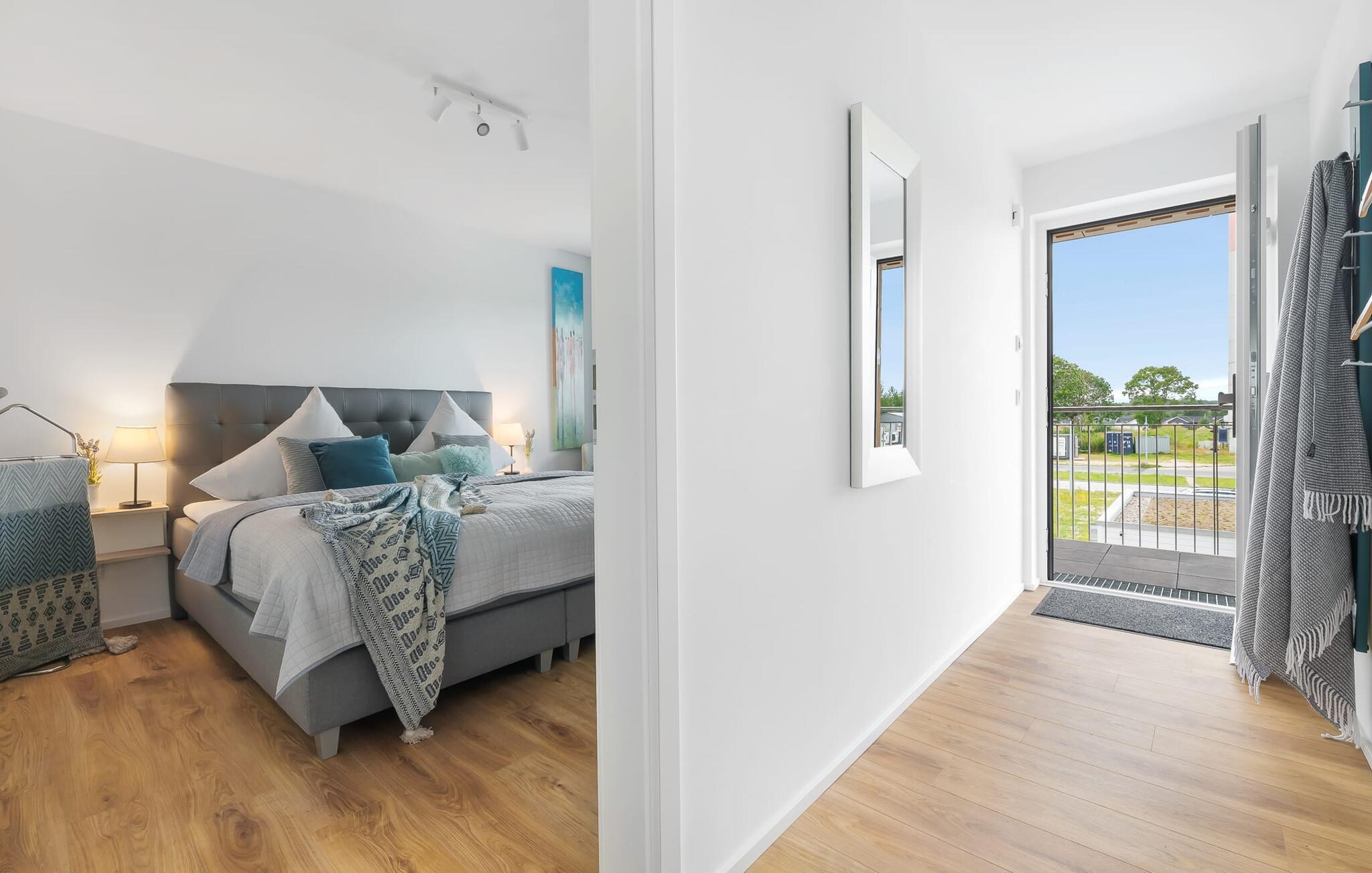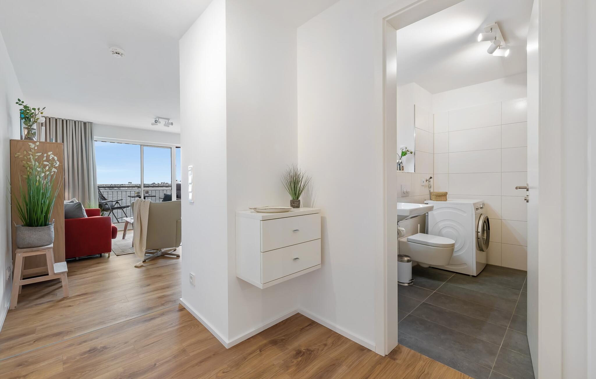 Gjennom gulv-til-tak-vinduene og fra balkongen har du ikke bare utsikt over marinaen og de flytende husene, men også over Schlei Østersjøfjord og Schleimünde fyrtårn. Seilbåter, måker og vakre solnedganger garanterer en ekte feriefølelse.