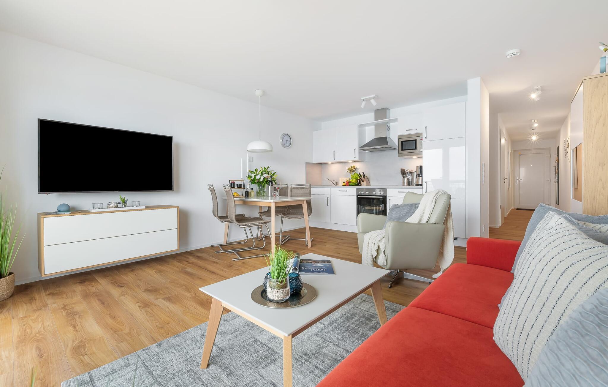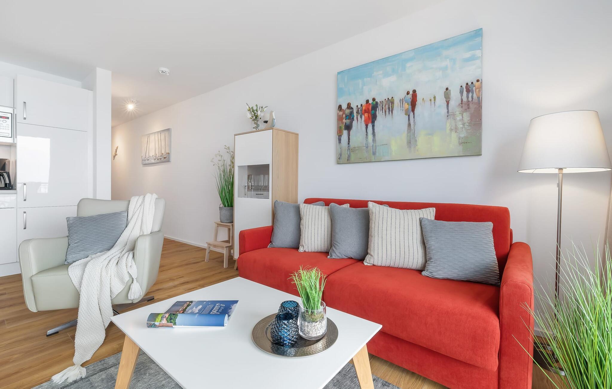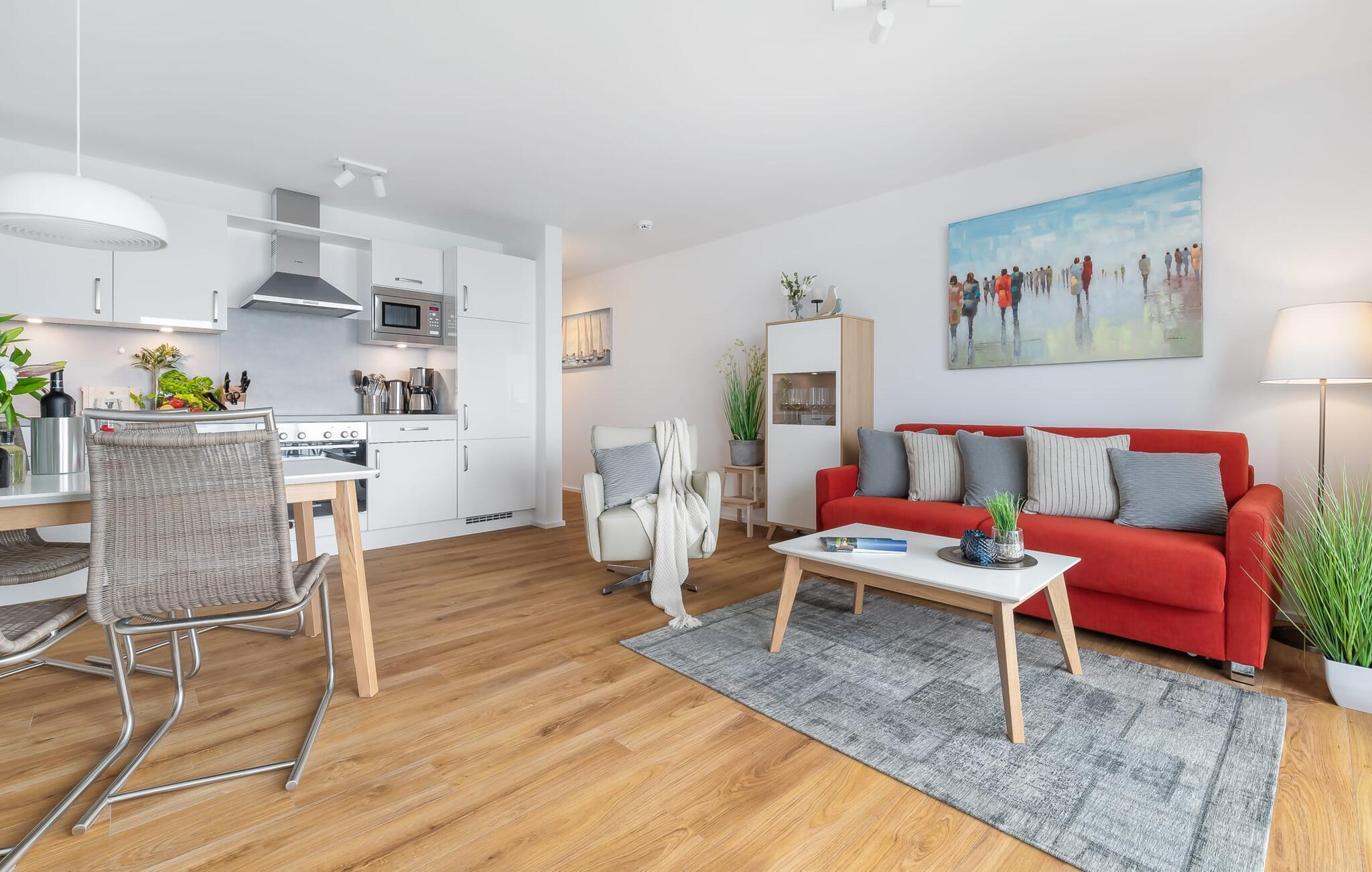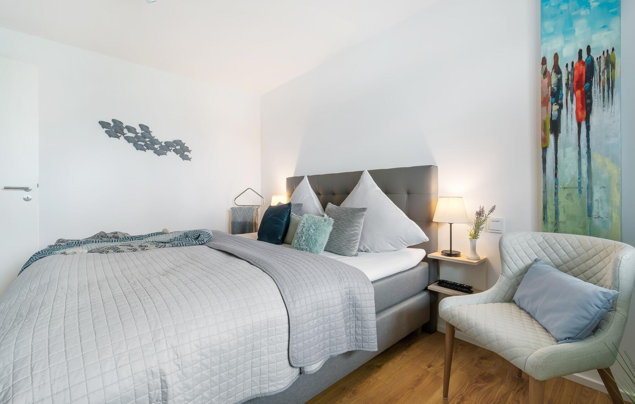Gjennom gulv-til-tak-vinduene og fra balkongen har du ikke bare utsikt over marinaen og de flytende husene, men også over Schlei Østersjøfjord og Schleimünde fyrtårn. Seilbåter, måker og vakre solnedganger garanterer en ekte feriefølelse.