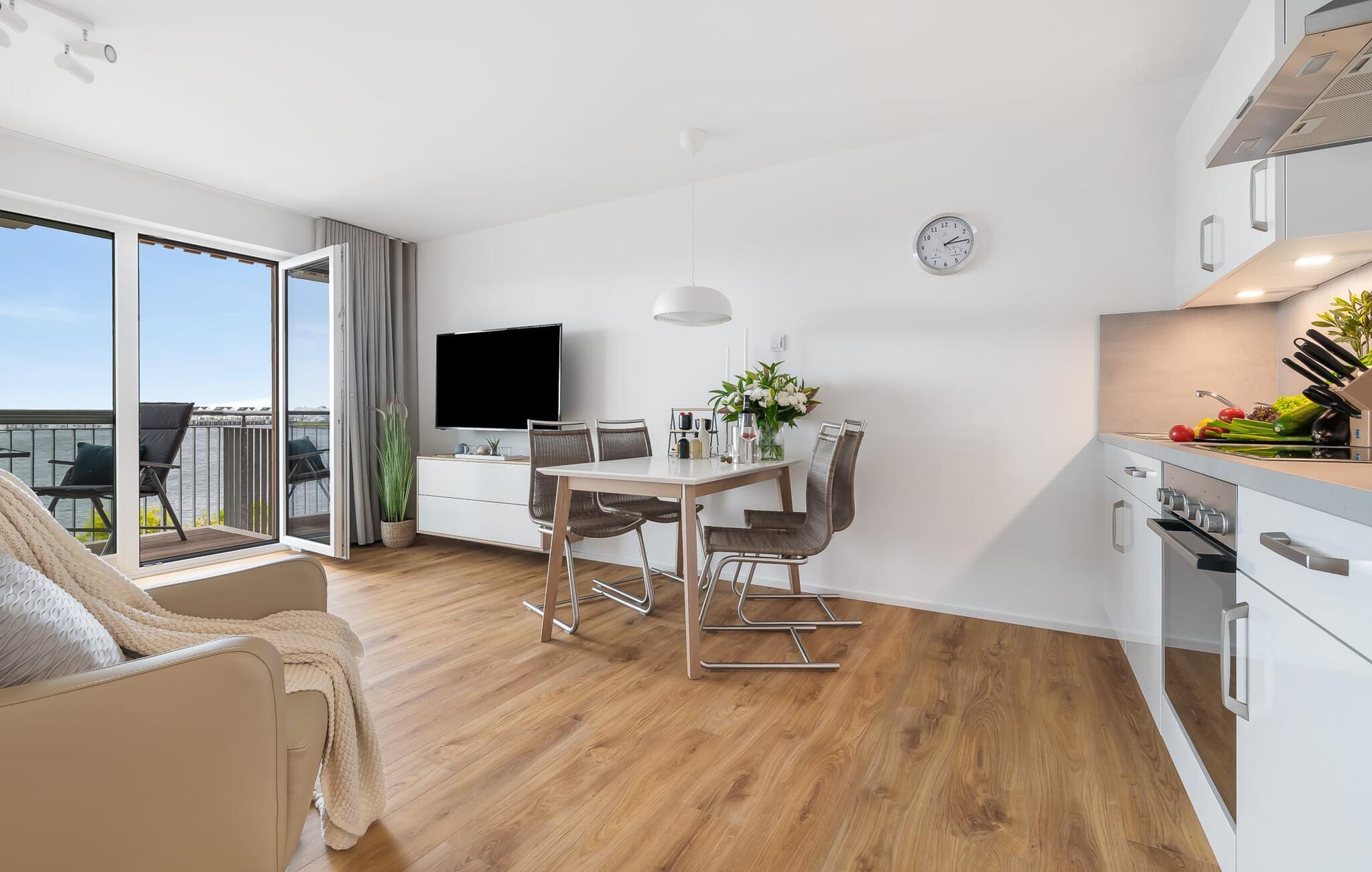 Det velutstyrte kjøkkenet i åpen planløsning lar ikke noe tilbake å ønske. Her kan du trylle frem deilige feriemåltider. Balkongen innbyr til grillmat med utsikt over vannet.