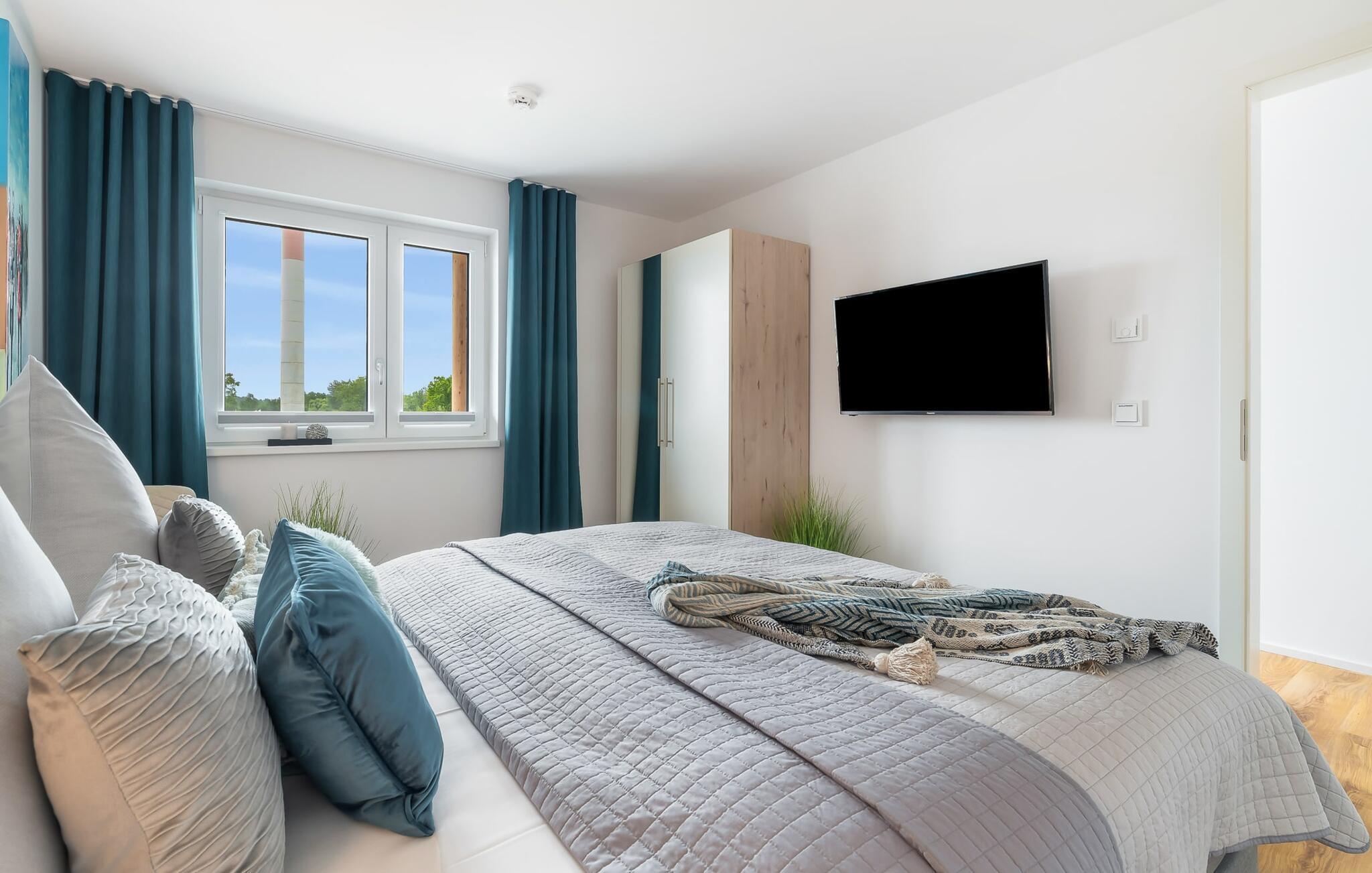 Det koselige soverommet er utstyrt med en dobbel fjærfjærseng, en ekstra flatskjerm-TV og insektsnett for en avslappende nattesøvn. En ekstra soveplass er tilgjengelig på den komfortable sovesofaen i stuen (140 cm x 200 cm).