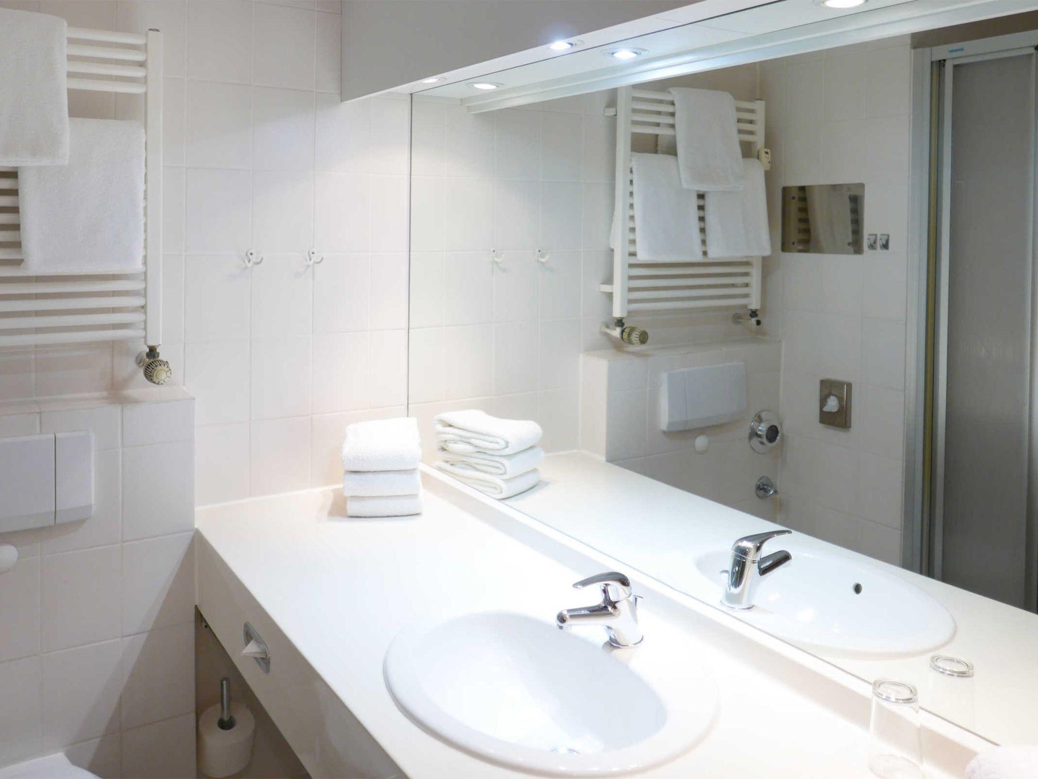 Das Badezimmer verfügt über eine Toilette, eine Dusche sowie einen äußerst großzügigen Waschtisch.