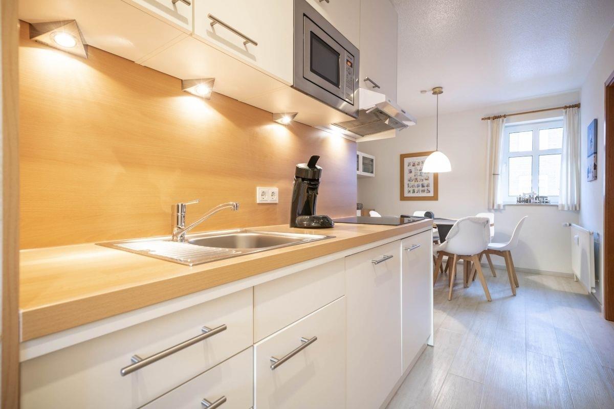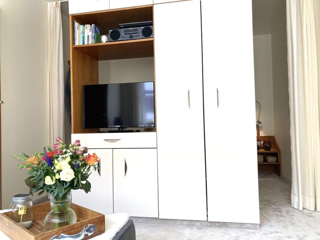 Die Wohnung ist vom DTV mit 4 Sternen ausgezeichnet und entsprechend komfortabel eingerichtet. Im Haus befindet sich ein frisch renoviertes Schwimmbad- und Saunabereich. Die Küche ist komplett und neu ausgestattet. Sie finden hier alles: Spülmaschine, Mikrowelle, Backofen, Wasserkocher, Eierkocher, Toaster, Waffeleisen, 3-Mix, Senseo- oder Filterkaffeemaschine zur Auswahl und mehr! Im Essbereich befindet sich ein runder Esstisch an dem 6 Personen bequem Platz finden. Im Wohn-Schlafzimmer ist ein Doppelbett (160x200) optisch durch einen Schrank vom einladenden Sofa mit Récamiere getrennt. Das Smart-TV ist zum Bett hin drehbar. In einem Schlafzimmer befindet sich ein Doppelbett (160x200) und in dem 2. Schlafzimmer ein Etagenbett, das eher für Kinder ausgelegt ist (180x90). Das Duschbad enthält ausreichend Handtuchstangen, Haken, Ablagen, Föhn und 2 großen Schubladen, sowie eine Dusche mit Glas-Duschabtrennung. Ihnen steht in der Wohnung eine Waschmaschine, ein Wäschetrockner und ein Bügeleisen zur Verfügung. Sie finden die Ferienwohnung für Sie komplett hergerichtet vor. Bettwäsche, Handtücher, Bademäntel und Küchentücher sind im Preis enthalten und werden regelmäßig ausgetauscht. Unsere Hausdame steht Ihnen für Fragen und Wünsche zur Verfügung.