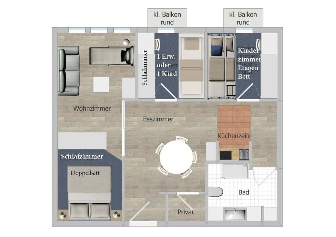 Nichtraucher-Ferienwohnung für 2 bis 5 Personen mit Schwimmbad und Sauna. 50qm, 3 Schlafzimmer - davon 1 Wohnschlafraum mit freistehendem Doppelbett, 1 Einzelbett und 1 Etagenbett für Kinder (80x180), Küche, Bad, 2 Trittbalkone.