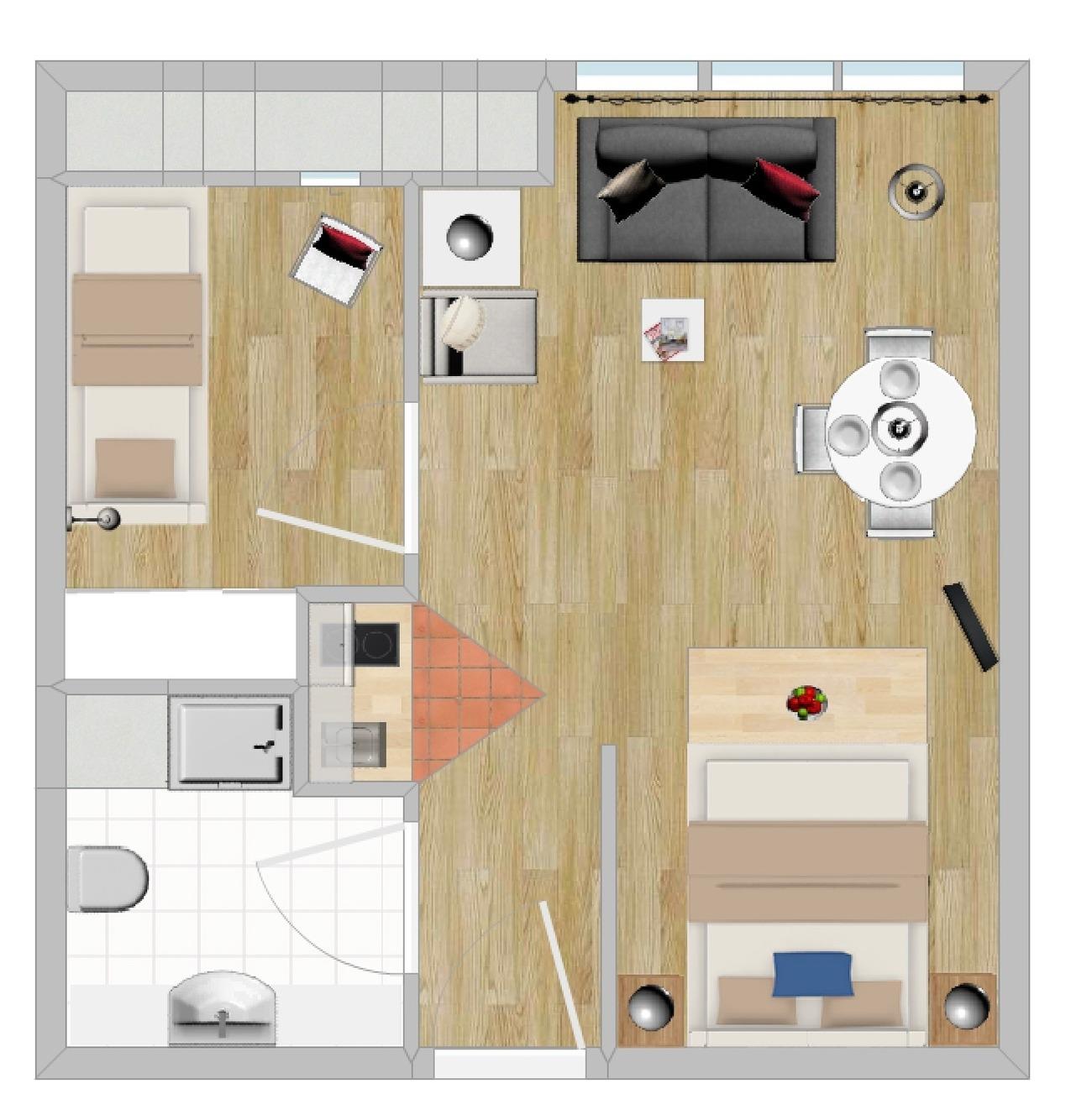 Nichtraucher-Ferienwohnung für 2 bis 3 Personen mit Schwimmbad und Sauna. 30qm, 2 Schlafzimmer - davon 1 Wohnschlafraum mit freistehendem Doppelbett. Weitere Schlafmöglichkeit im separaten Einzelbettzimmer. Großzügig ausgestattete Küche und Badezimmer.