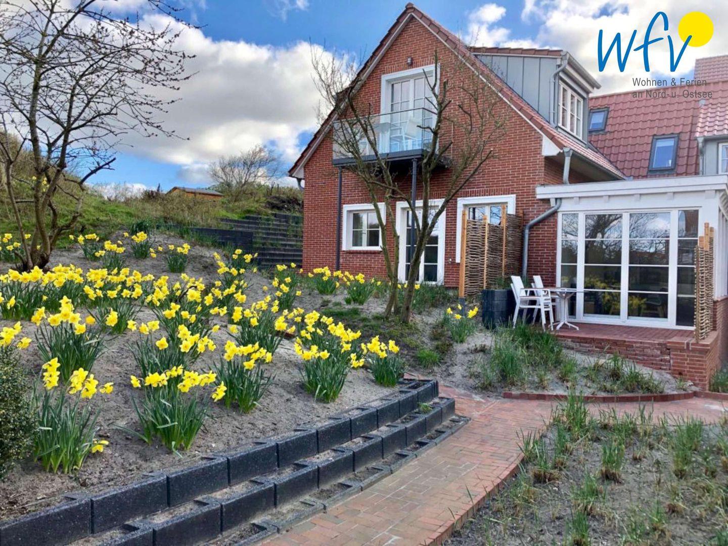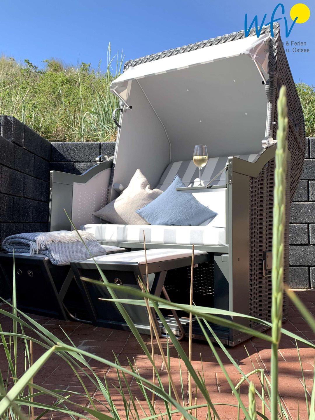Auch die große Terrasse lädt zum Entspannen ein - besonders im windgeschützten Strandkorb mit Blick in den Garten und auf den Dünenkessel Juist! Hier können Sie bei frischer Nordseeluft nahezu den ganzen Tag die Sonne genießen, bis zu Ihrem Untergang über den Dünen...