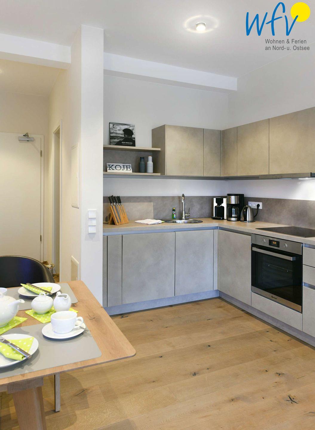 Damit Sie sich in Ihrem Urlaub auf Juist bequem selbst verpflegen können, verfügt die Küchenzeile u.a. über einen Induktionsherd, einen Backofen, einen Kühlschrank mit Gefrierfach sowie über eine Kaffeemaschine, eine Spülmaschine, einen Wasserkocher und einen Toaster. Kaffeeliebhaber können zwischen der klassischen Kaffeemaschine und einer Senseo-Pad-Maschine wählen.
