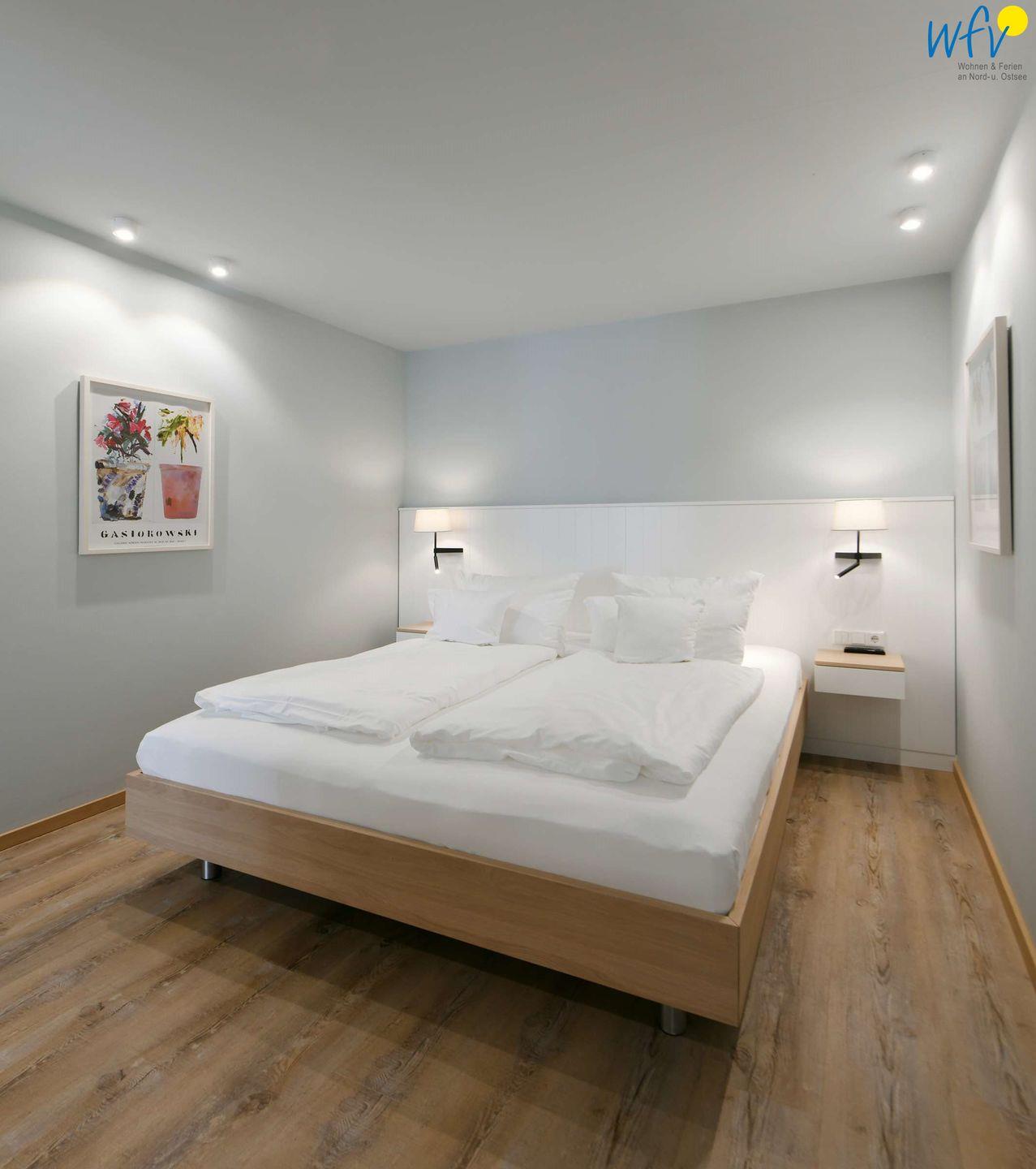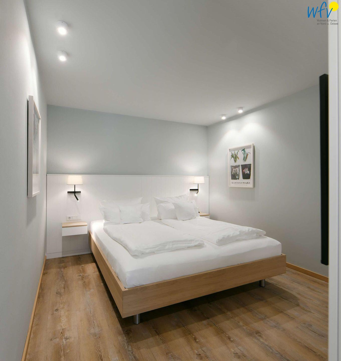 Ein gehobener Stil erwartet Sie auch in dem separaten Schlafzimmer der Ferienwohnung "Seestern"! Es ist mit einem Doppelbett mit hochwertigen Matratzen (180 x 200 cm; exklusives SCHRAMM-Bettsystem plus Topper), einem Kleiderschrank und einem SmartTV mit WLAN-Anschluss ausgestattet. Es bestehen gute Verdunkelungsmöglichkeiten. Zwei zusätzliche Schlafplätze befinden sich auf der Schlafcouch im Wohnraum.