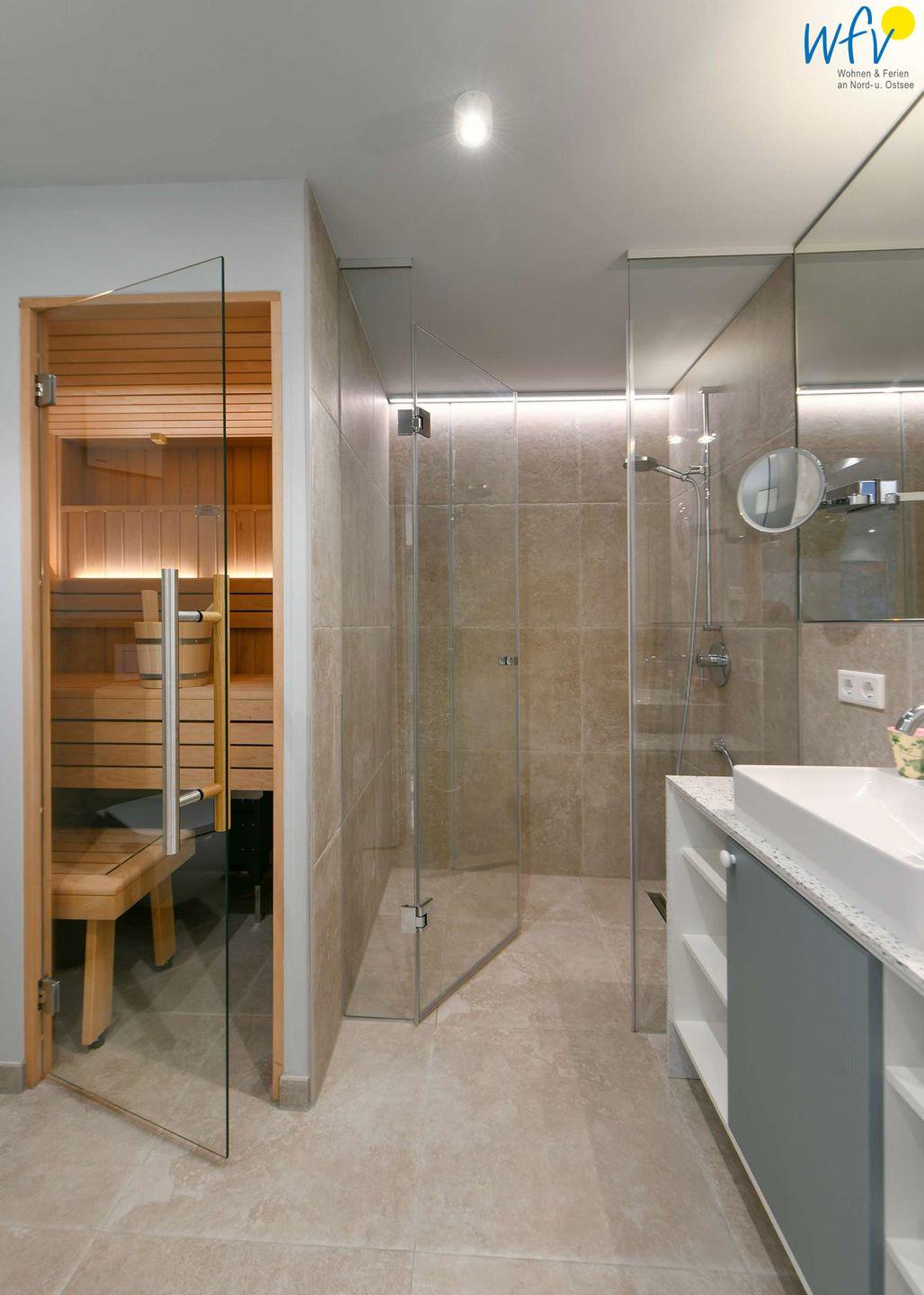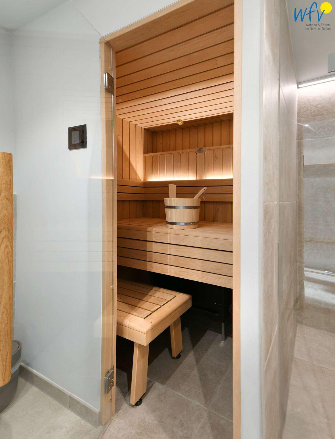 Weiteren Wohnkomfort bietet Ihnen das moderne Badezimmer mit stilvoller Ausstattung, Dusche und eigener Sauna. Ideal für Entspannungsmomente nach dem Strandspaziergang!