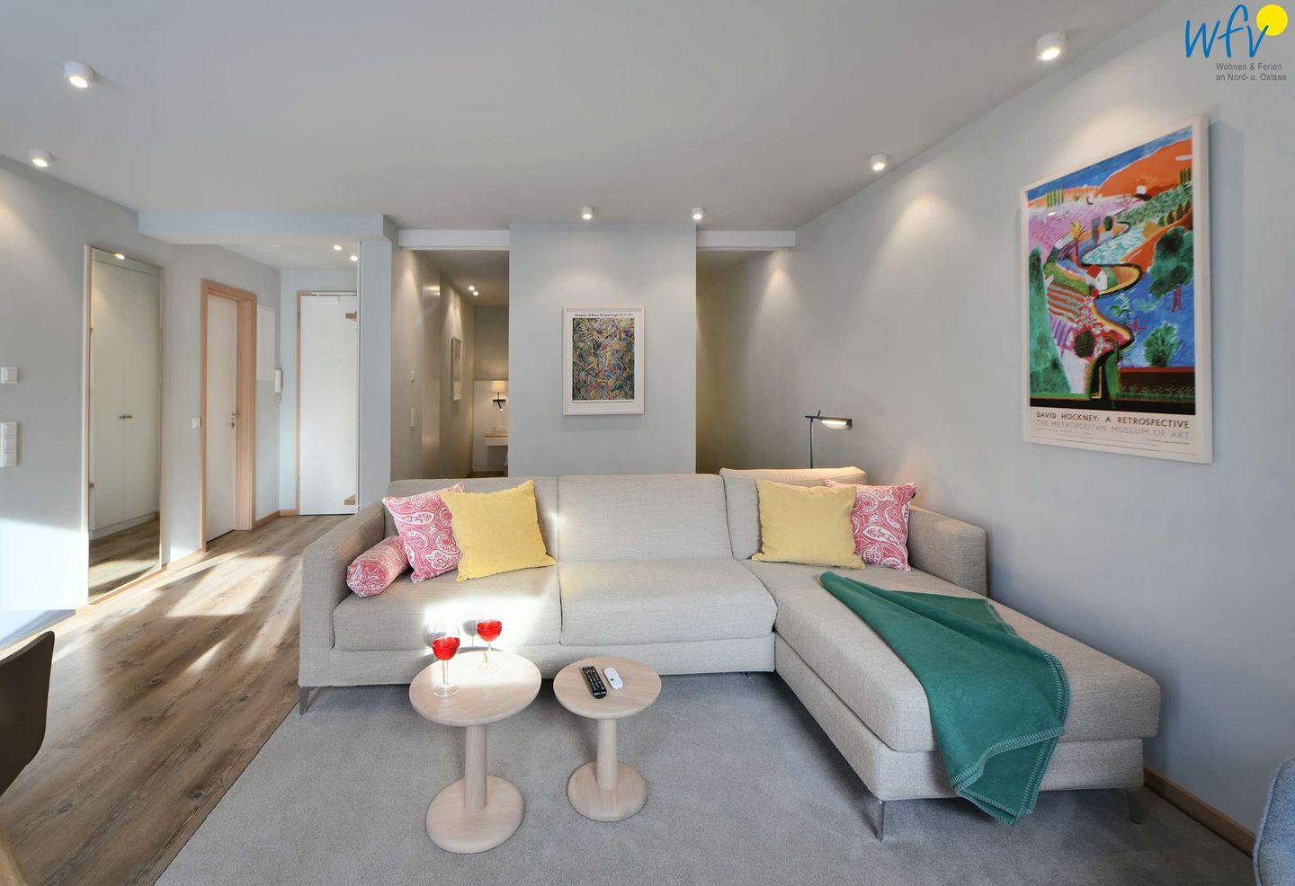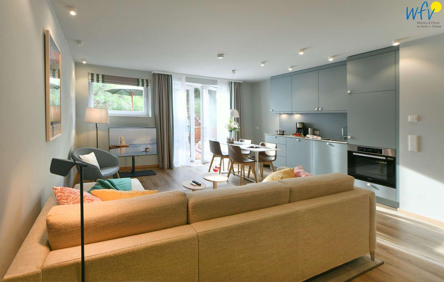 Die Ferienwohnung verfügt über ein separates Schlafzimmer, einen großzügigen Wohnraum mit integrierter Küche, ein Duschbad und eine große Terrasse und ist damit ideal für den Urlaub für bis zu vier Personen. Helle Räume, eine sehr geschmackvolle Einrichtung in dezenten Farben und nordischem Stil sowie eine gute technische Ausstattung bieten Ihnen Wohnkomfort. Sie möchten gerne mit mehreren Personen verreisen? Diese Wohnung kann mit der weiteren Wohnung im UG (3460001 "Wohnung Segel" mit Sauna) mit einem eigenen Flurbereich zusammengelegt werden. Sprechen Sie uns gerne an!